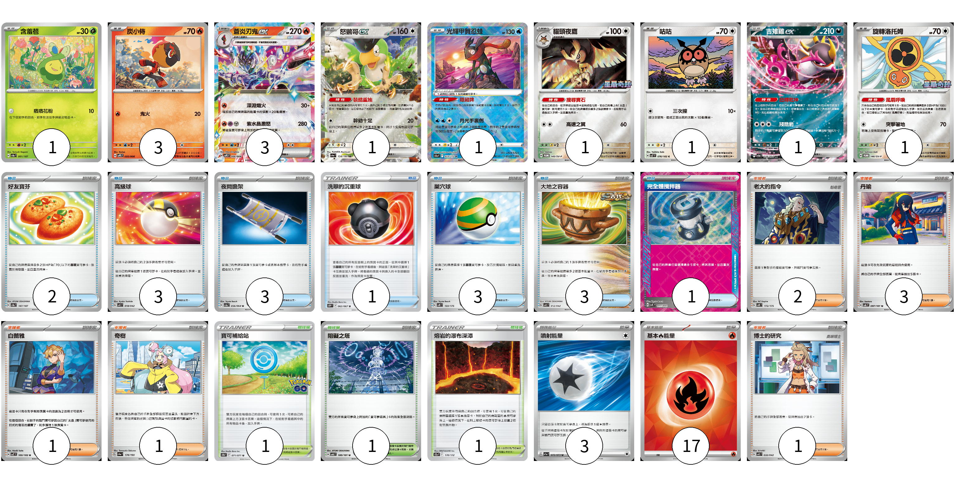 牌組構築方案 以此牌組為基礎新構築牌組 顯示卡面 顯示列表 寶可夢卡(13) 1 3 3 1 1 1 1 1 1 物品卡(16) 2 3 3 1 3 3 1 支援者卡(8) 2 3 1 1 1 競技場卡(3) 1 1 1 能量卡(20) 3 17 寶可夢卡(13) 卡牌名稱 張數 卡牌名稱 張數 含羞苞 SV8a 001/187 01 炭小侍 SVPS 005/008 03 蒼炎刃鬼ex SVPS 006/008 03 怒鸚哥ex SV4a 154/190 01 光輝甲賀忍蛙 S12a 033/172 01 貓頭夜鷹 SV-P 145/SV-P 01 咕咕 SV7 076/102 01 吉雉雞ex SV6a 038/064 01 旋轉洛托姆 SV-P 146/SV-P 01 物品卡(16) 卡牌名稱 張數 卡牌名稱 張數 好友寶芬 SV8a 147/187 02 高級球 SVK 018/042 03 夜間擔架 SV6a 056/064 03 洗翠的沉重球 S10P 062/067 01 巢穴球 SVM 133/175 03 大地之容器 SVK 012/042 03 完全體攪拌器 SVK 017/042 01 支援者卡(8) 卡牌名稱 張數 卡牌名稱 張數 老大的指令 SVM 172/175 02 丹瑜 SV6 097/101 03 白蕾雅 SV7 100/102 01 奇樹 SV4a 174/190 01 博士的研究 SVK 032/042 01 競技場卡(3) 卡牌名稱 張數 卡牌名稱 張數 寶可補給站 S10b 071/071 01 阻礙之塔 SV6 100/101 01 熔岩的瀑布深潭 S12a 170/172 01 能量卡(20) 卡牌名稱 張數 卡牌名稱 張數 噴射能量 SV1a 072/073 03 基本【火】能量 SVK FIR 17 以此牌組為基礎新構築牌組 牌組編碼 TQDoOk-nSxhMP-PGKamg copy 列印牌組單 牌組編碼已複製 分享至SNS