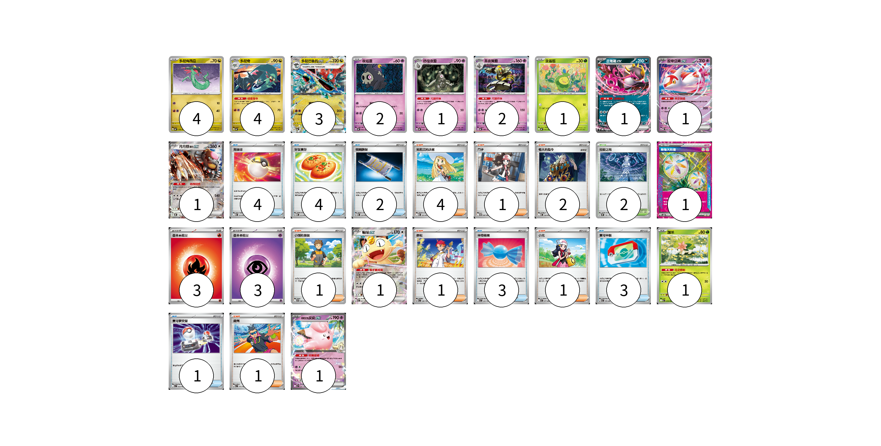 牌組構築方案 以此牌組為基礎新構築牌組 顯示卡面 顯示列表 寶可夢卡(23) 4 4 3 2 1 2 1 1 1 1 1 1 1 物品卡(17) 4 4 2 3 3 1 支援者卡(11) 4 1 2 1 1 1 1 競技場卡(2) 2 能量卡(7) 1 3 3 寶可夢卡(23) 卡牌名稱 張數 卡牌名稱 張數 多龍梅西亞 SV8a 118/187 04 多龍奇 SV8a 119/187 04 多龍巴魯托ex SV8a 120/187 03 夜巡靈 SV8a 064/187 02 彷徨夜靈 SV8a 065/187 01 黑夜魔靈 SV8a 066/187 02 含羞苞 SV8a 001/187 01 吉雉雞ex SVOD 004/020 01 拉帝亞斯ex MBD 003/022 01 月月熊 赫月ex SV8a 134/187 01 喵喵ex M3 061/080 01 謝米 M2a 012/193 01 莉莉艾的皮皮ex MC 287/742 01 物品卡(17) 卡牌名稱 張數 卡牌名稱 張數 高級球 MBD 014/022 04 好友寶芬 MBD 013/022 04 夜間擔架 MBD 016/022 02 神奇糖果 MC 655/742 03 寶可平板 M3 070/080 03 寶可夢交替 MC 663/742 01 支援者卡(11) 卡牌名稱 張數 卡牌名稱 張數 莉莉艾的決意 MBD 021/022 04 鬥子 SV11W 085/086 01 老大的指令 MBD 020/022 02 小剛的發掘 SV9 096/100 01 赤松 MC 696/742 01 小光 M2 077/080 01 裁判 MC 711/742 01 競技場卡(2) 卡牌名稱 張數 卡牌名稱 張數 阻礙之塔 SV8a 181/187 02 能量卡(7) 卡牌名稱 張數 卡牌名稱 張數 新衝天能量 SV5K 071/071 01 基本【火】能量 M-P FIR 03 基本【超】能量 MBD PSY 03 以此牌組為基礎新構築牌組 牌組編碼 TSsoNT-HwUalv-sOBRdP copy 列印牌組單 牌組編碼已複製 分享至SNS