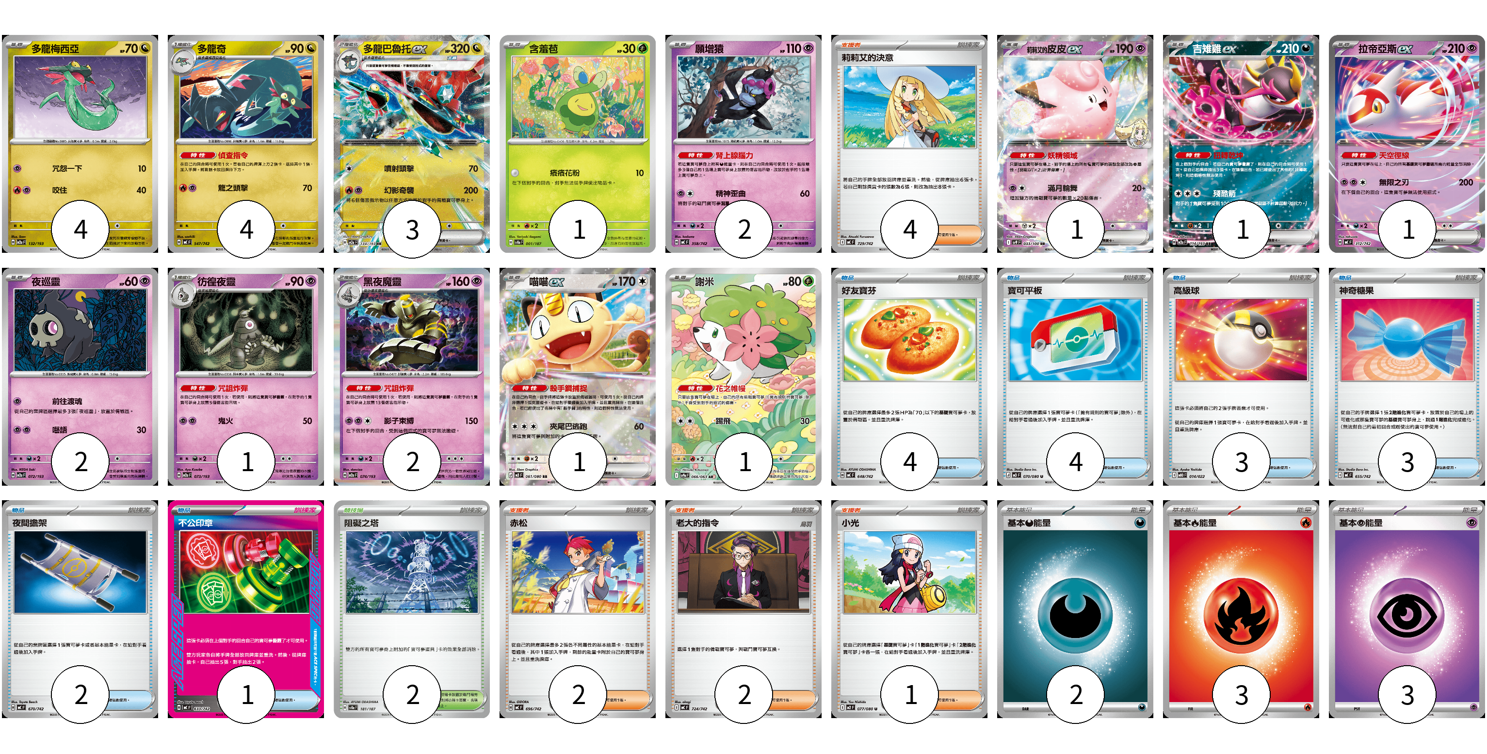 牌組構築方案 以此牌組為基礎新構築牌組 顯示卡面 顯示列表 寶可夢卡(24) 4 4 3 1 2 1 1 1 2 1 2 1 1 物品卡(17) 4 4 3 3 2 1 支援者卡(9) 4 2 2 1 競技場卡(2) 2 能量卡(8) 2 3 3 寶可夢卡(24) 卡牌名稱 張數 卡牌名稱 張數 多龍梅西亞 M2a 132/193 04 多龍奇 MC 547/742 04 多龍巴魯托ex M2a 134/193 03 含羞苞 SV8a 001/187 01 願增猿 MC 358/742 02 莉莉艾的皮皮ex SV9 033/100 01 吉雉雞ex M2a 114/193 01 拉帝亞斯ex MC 312/742 01 夜巡靈 M2a 072/193 02 彷徨夜靈 M2a 073/193 01 黑夜魔靈 M2a 074/193 02 喵喵ex M3 061/080 01 謝米 SV9a 066/063 01 物品卡(17) 卡牌名稱 張數 卡牌名稱 張數 好友寶芬 MC 648/742 04 寶可平板 M3 070/080 04 高級球 MBD 014/022 03 神奇糖果 MC 655/742 03 夜間擔架 MC 670/742 02 不公印章 MC 633/742 01 支援者卡(9) 卡牌名稱 張數 卡牌名稱 張數 莉莉艾的決意 MC 729/742 04 赤松 MC 696/742 02 老大的指令 MC 724/742 02 小光 M2 077/080 01 競技場卡(2) 卡牌名稱 張數 卡牌名稱 張數 阻礙之塔 SV8a 181/187 02 能量卡(8) 卡牌名稱 張數 卡牌名稱 張數 基本【惡】能量 MC DAR 02 基本【火】能量 MC FIR 03 基本【超】能量 MC PSY 03 以此牌組為基礎新構築牌組 牌組編碼 TTdGDr-Iulmzt-AnYtAi copy 列印牌組單 牌組編碼已複製 分享至SNS