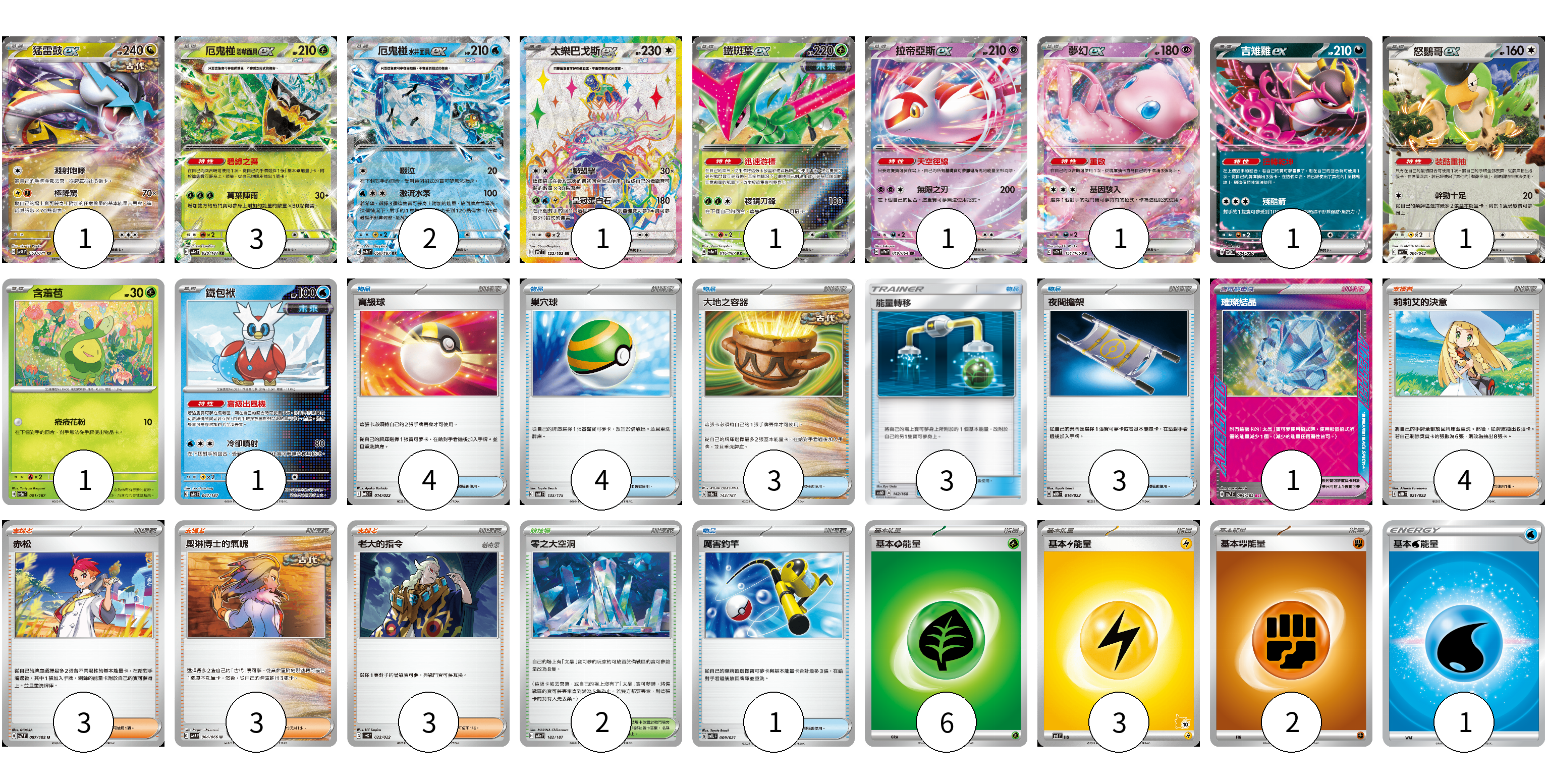 牌組構築方案 以此牌組為基礎新構築牌組 顯示卡面 顯示列表 寶可夢卡(14) 1 3 2 1 1 1 1 1 1 1 1 寶可夢道具(1) 1 物品卡(18) 4 4 3 3 3 1 支援者卡(13) 4 3 3 3 競技場卡(2) 2 能量卡(12) 6 3 2 1 寶可夢卡(14) 卡牌名稱 張數 卡牌名稱 張數 猛雷鼓ex SV5K 053/071 01 厄鬼椪 碧草面具ex SV8a 020/187 03 厄鬼椪 水井面具ex SV8a 050/187 02 太樂巴戈斯ex SV7 122/102 01 鐵斑葉ex SV8a 016/187 01 拉帝亞斯ex SV7a 019/064 01 夢幻ex SV2a 151/165 01 吉雉雞ex SVOD 004/020 01 怒鸚哥ex SVK 006/042 01 含羞苞 SV8a 001/187 01 鐵包袱 SV8a 047/187 01 寶可夢道具(1) 卡牌名稱 張數 卡牌名稱 張數 璀璨結晶 SV7 094/102 01 物品卡(18) 卡牌名稱 張數 卡牌名稱 張數 高級球 MBD 014/022 04 巢穴球 SVM 133/175 04 大地之容器 SV8a 143/187 03 能量轉移 AS6D 142/168 03 夜間擔架 MBD 016/022 03 厲害釣竿 SVTL 009/021 01 支援者卡(13) 卡牌名稱 張數 卡牌名稱 張數 莉莉艾的決意 MBD 021/022 04 赤松 SV7 097/102 03 奧琳博士的氣魄 SV4K 064/066 03 老大的指令 SVHK 022/022 03 競技場卡(2) 卡牌名稱 張數 卡牌名稱 張數 零之大空洞 SV8a 182/187 02 能量卡(12) 卡牌名稱 張數 卡牌名稱 張數 基本【草】能量 SVTM GRA 06 基本【雷】能量 SVI LIG 03 基本【鬥】能量 SVD FIG 02 基本【水】能量 SI WAT 01 以此牌組為基礎新構築牌組 牌組編碼 TUyWbP-VtHfWi-aFEJCx copy 列印牌組單 牌組編碼已複製 分享至SNS