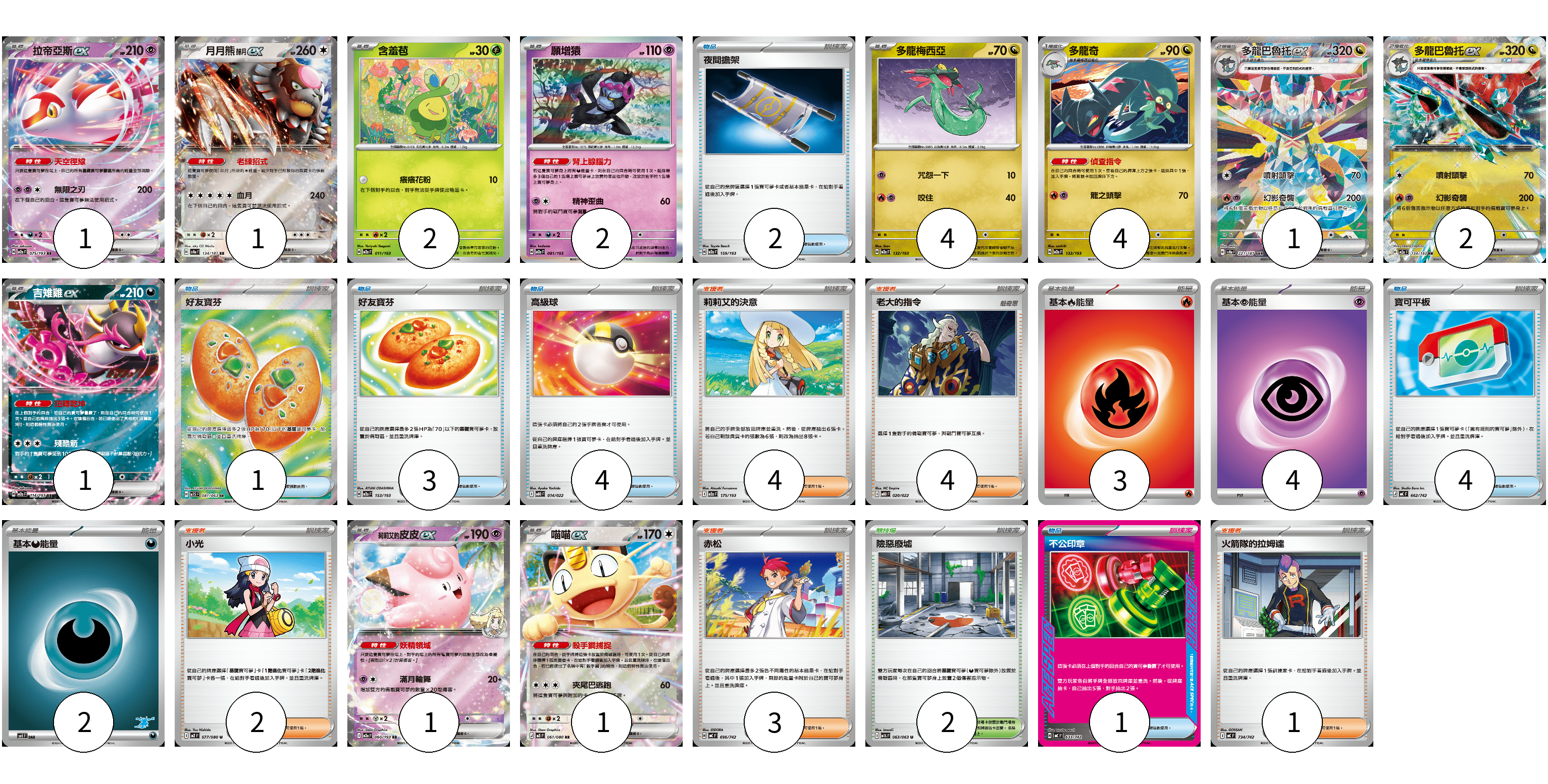 牌組構築方案 以此牌組為基礎新構築牌組 顯示卡面 顯示列表 寶可夢卡(20) 1 1 2 2 4 4 1 2 1 1 1 物品卡(15) 2 1 3 4 4 1 支援者卡(14) 4 4 2 3 1 競技場卡(2) 2 能量卡(9) 3 4 2 寶可夢卡(20) 卡牌名稱 張數 卡牌名稱 張數 拉帝亞斯ex M2a 075/193 01 月月熊 赫月ex SV8a 134/187 01 含羞苞 M2a 011/193 02 願增猿 M2a 081/193 02 多龍梅西亞 M2a 132/193 04 多龍奇 M2a 133/193 04 多龍巴魯托ex SV8a 221/187 01 多龍巴魯托ex M2a 134/193 02 吉雉雞ex M2a 114/193 01 莉莉艾的皮皮ex M2a 060/193 01 喵喵ex M3 061/080 01 物品卡(15) 卡牌名稱 張數 卡牌名稱 張數 夜間擔架 M2a 159/193 02 好友寶芬 M1S 081/063 01 好友寶芬 M2a 153/193 03 高級球 MBD 014/022 04 寶可平板 MC 662/742 04 不公印章 MC 633/742 01 支援者卡(14) 卡牌名稱 張數 卡牌名稱 張數 莉莉艾的決意 M2a 175/193 04 老大的指令 MBD 020/022 04 小光 M2 077/080 02 赤松 MC 696/742 03 火箭隊的拉姆達 MC 734/742 01 競技場卡(2) 卡牌名稱 張數 卡牌名稱 張數 險惡廢墟 M1L 063/063 02 能量卡(9) 卡牌名稱 張數 卡牌名稱 張數 基本火能量 sv-p FIR 03 基本超能量 sv-p PSY 04 基本【惡】能量 SVI DAR 02 以此牌組為基礎新構築牌組 牌組編碼 TVYZAb-QRDSwE-ztXCNk copy 列印牌組單 牌組編碼已複製 分享至SNS
