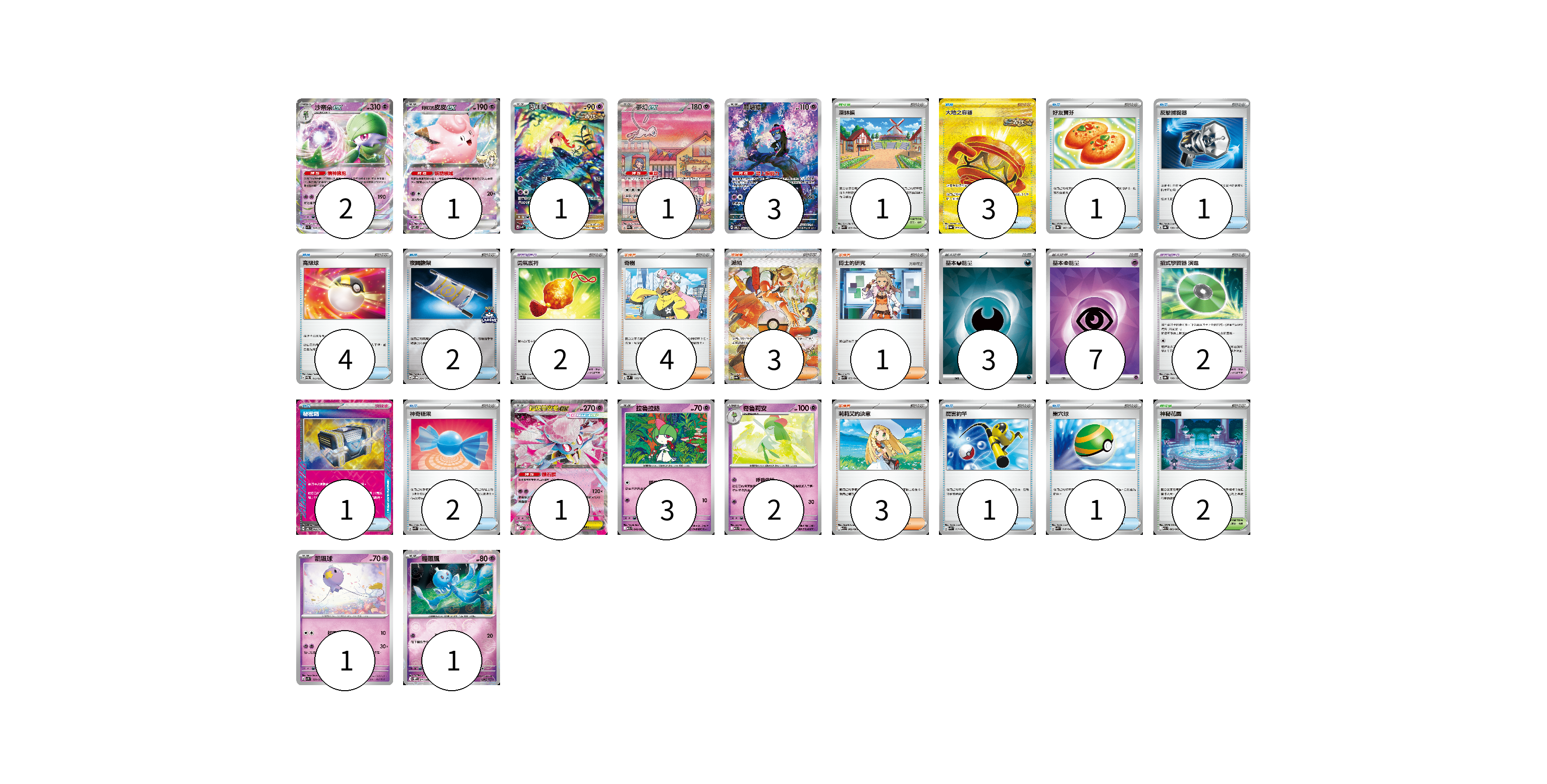 牌組構築方案 以此牌組為基礎新構築牌組 顯示卡面 顯示列表 寶可夢卡(16) 2 1 1 1 3 1 3 2 1 1 寶可夢道具(4) 2 2 物品卡(16) 3 1 1 4 2 1 2 1 1 支援者卡(11) 4 3 1 3 競技場卡(3) 1 2 能量卡(10) 3 7 寶可夢卡(16) 卡牌名稱 張數 卡牌名稱 張數 沙奈朵ex SV1S 028/078 02 莉莉艾的皮皮ex SV9 033/100 01 吼叫尾 SV4K 071/066 01 夢幻ex SV2a 205/165 01 願增猿 SV6 107/101 03 超級蒂安希ex MBD 006/022 01 拉魯拉絲 M1S 040/063 03 奇魯莉安 M1S 041/063 02 飄飄球 SV1S 029/078 01 輕飄飄 SV11W 041/086 01 寶可夢道具(4) 卡牌名稱 張數 卡牌名稱 張數 勇氣護符 SVK 024/042 02 招式學習器 演進 SV8a 160/187 02 物品卡(16) 卡牌名稱 張數 卡牌名稱 張數 大地之容器 SV6a 093/064 03 好友寶芬 SV8a 147/187 01 反擊捕捉器 SV8a 139/187 01 高級球 SVEM 013/020 04 夜間擔架 SV-P 204/SV-P 02 秘密箱 SV6 092/101 01 神奇糖果 SVK 019/042 02 厲害釣竿 SVK 011/042 01 巢穴球 SVK 016/042 01 支援者卡(11) 卡牌名稱 張數 卡牌名稱 張數 奇樹 SVM 160/175 04 派帕 SV4a 353/190 03 博士的研究 SVK 032/042 01 莉莉艾的決意 M1L 062/063 03 競技場卡(3) 卡牌名稱 張數 卡牌名稱 張數 深缽鎮 SVK 039/042 01 神秘花園 M1S 063/063 02 能量卡(10) 卡牌名稱 張數 卡牌名稱 張數 基本【惡】能量 SVK DAR 03 基本【超】能量 SVK PSY 07 以此牌組為基礎新構築牌組 牌組編碼 TVpiSL-zSHaiq-maWKhH copy 列印牌組單 牌組編碼已複製 分享至SNS