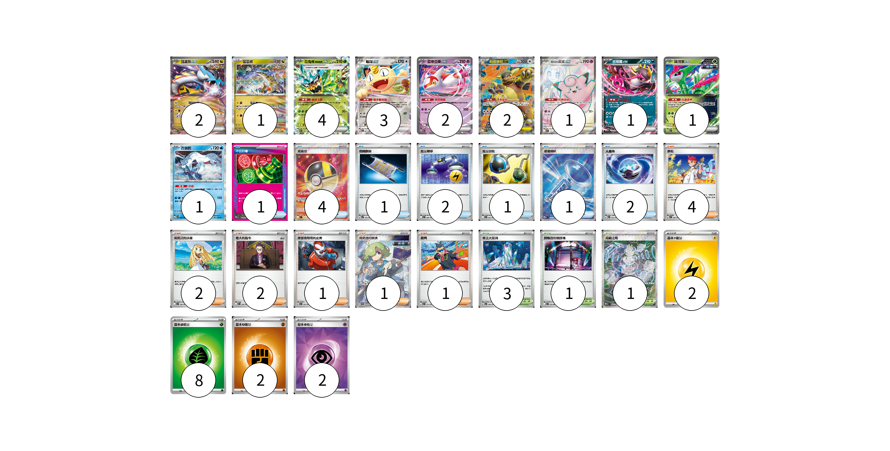 牌組構築方案 以此牌組為基礎新構築牌組 顯示卡面 顯示列表 寶可夢卡(18) 2 1 4 3 2 2 1 1 1 1 物品卡(12) 1 4 1 2 1 1 2 支援者卡(11) 4 2 2 1 1 1 競技場卡(5) 3 1 1 能量卡(14) 2 8 2 2 寶可夢卡(18) 卡牌名稱 張數 卡牌名稱 張數 猛雷鼓ex MC 554/742 02 猛雷鼓 SV7 075/102 01 厄鬼椪 碧草面具ex MC 082/742 04 喵喵ex M3 061/080 03 拉帝亞斯ex MC 312/742 02 超級袋獸ex M1S 080/063 02 莉莉艾的皮皮ex SV9 115/100 01 吉雉雞ex MC 489/742 01 鐵斑葉ex MC 077/742 01 古劍豹 M2a 043/193 01 物品卡(12) 卡牌名稱 張數 卡牌名稱 張數 不公印章 MC 633/742 01 高級球 M2a 216/193 04 夜間擔架 M2a 159/193 01 能量轉移 MC 638/742 02 能量回收 MC 636/742 01 玻璃喇叭 M2a 215/193 01 太晶珠 M2a 152/193 02 支援者卡(11) 卡牌名稱 張數 卡牌名稱 張數 赤松 MC 696/742 04 莉莉艾的決意 MC 729/742 02 老大的指令 MC 724/742 02 庫瑟洛斯奇的企圖 MC 705/742 01 暗碼迷的解讀 SV5M 090/071 01 裁判 MC 711/742 01 競技場卡(5) 卡牌名稱 張數 卡牌名稱 張數 零之大空洞 M2a 184/193 03 對戰圓形競技場 M2 079/080 01 阻礙之塔 M2a 222/193 01 能量卡(14) 卡牌名稱 張數 卡牌名稱 張數 基本【雷】能量 MJ LIG 02 基本【草】能量 MJ GRA 08 基本【鬥】能量 MC FIG 02 基本【超】能量 SVOD PSY 02 以此牌組為基礎新構築牌組 牌組編碼 TWaKUR-XrNCsD-LFZMyu copy 列印牌組單 牌組編碼已複製 分享至SNS