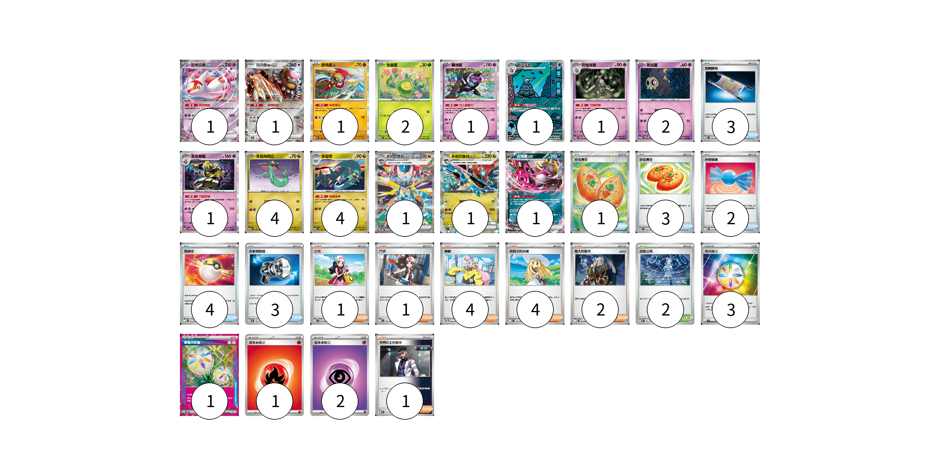牌組構築方案 以此牌組為基礎新構築牌組 顯示卡面 顯示列表 寶可夢卡(22) 1 1 1 2 1 1 1 2 1 4 4 1 1 1 物品卡(16) 3 1 3 2 4 3 支援者卡(13) 1 1 4 4 2 1 競技場卡(2) 2 能量卡(7) 3 1 1 2 寶可夢卡(22) 卡牌名稱 張數 卡牌名稱 張數 拉帝亞斯ex M2a 075/193 01 月月熊 赫月ex SV8a 134/187 01 摔角鷹人 SV8a 084/187 01 含羞苞 M2a 011/193 02 願增猿 M2a 081/193 01 彷徨夜靈 SV6a 069/064 01 彷徨夜靈 M2a 073/193 01 夜巡靈 M2a 072/193 02 黑夜魔靈 M2a 074/193 01 多龍梅西亞 M2a 132/193 04 多龍奇 M2a 133/193 04 多龍巴魯托ex SV8a 221/187 01 多龍巴魯托ex M2a 134/193 01 吉雉雞ex M2a 114/193 01 物品卡(16) 卡牌名稱 張數 卡牌名稱 張數 夜間擔架 M2a 159/193 03 好友寶芬 M1S 081/063 01 好友寶芬 M2a 153/193 03 神奇糖果 MBG 013/022 02 高級球 MBD 014/022 04 反擊捕捉器 SV8a 139/187 03 支援者卡(13) 卡牌名稱 張數 卡牌名稱 張數 小光 M2 077/080 01 鬥子 M2a 172/193 01 奇樹 SVOM 018/021 04 莉莉艾的決意 M2a 175/193 04 老大的指令 MBD 020/022 02 弗圖博士的劇本 SV8a 175/187 01 競技場卡(2) 卡牌名稱 張數 卡牌名稱 張數 阻礙之塔 SV8a 181/187 02 能量卡(7) 卡牌名稱 張數 卡牌名稱 張數 夜光能量 SVK 042/042 03 新衝天能量 SV5K 071/071 01 基本火能量 sv-p FIR 01 基本超能量 sv-p PSY 02 以此牌組為基礎新構築牌組 牌組編碼 TXYYdP-AFPrxz-wqGMTT copy 列印牌組單 牌組編碼已複製 分享至SNS