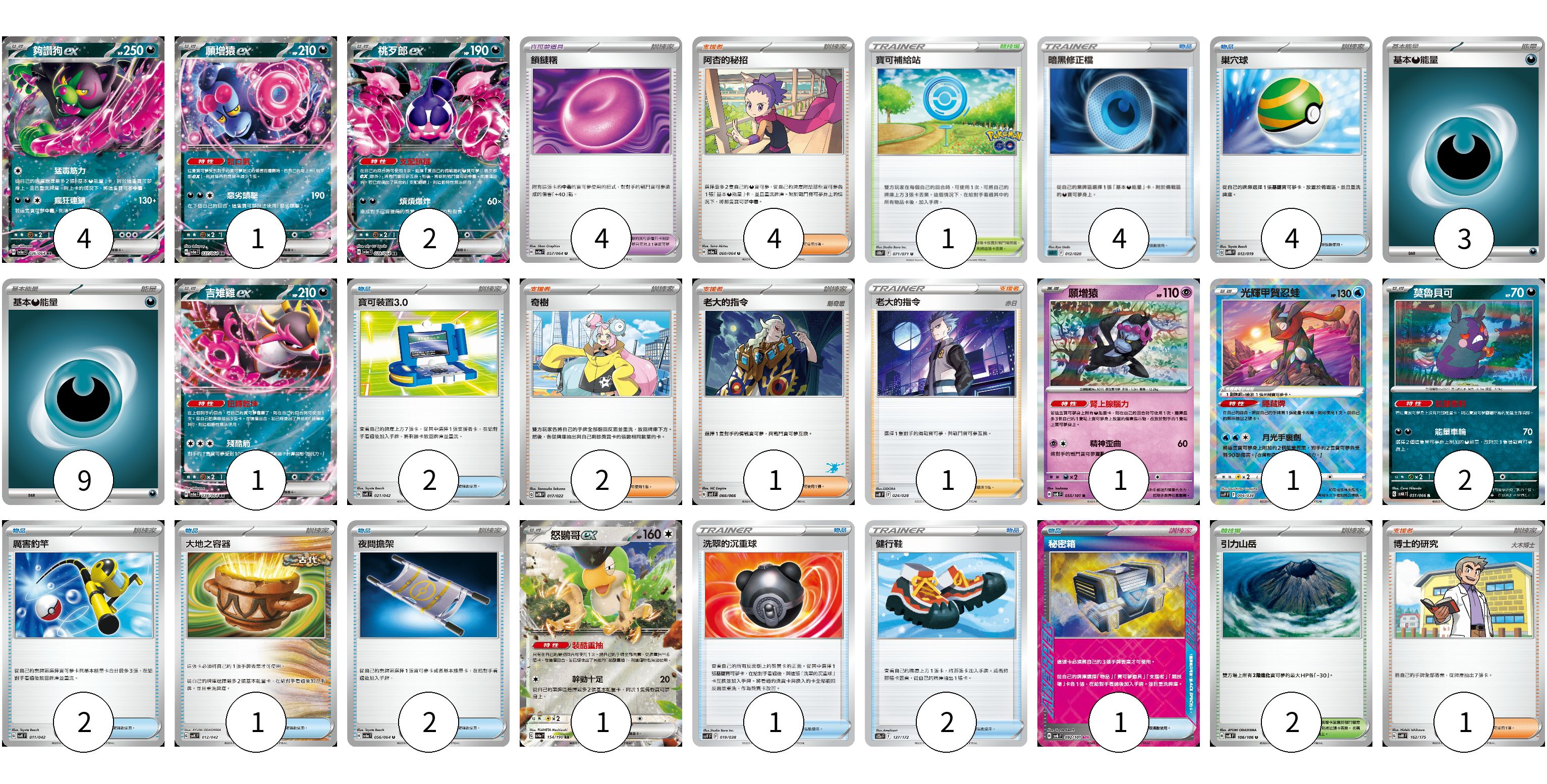 牌組構築方案 以此牌組為基礎新構築牌組 顯示卡面 顯示列表 寶可夢卡(13) 4 1 2 1 1 1 2 1 寶可夢道具(4) 4 物品卡(19) 4 4 2 2 1 2 1 2 1 支援者卡(9) 4 2 1 1 1 競技場卡(3) 1 2 能量卡(12) 3 9 寶可夢卡(13) 卡牌名稱 張數 卡牌名稱 張數 夠讚狗ex SV6a 036/064 04 願增猿ex SV6a 037/064 01 桃歹郎ex SV6a 039/064 02 吉雉雞ex SV6a 038/064 01 願增猿 SV6 055/101 01 光輝甲賀忍蛙 SVF 004/038 01 莫魯貝可 SV4K 051/066 02 怒鸚哥ex SV4a 154/190 01 寶可夢道具(4) 卡牌名稱 張數 卡牌名稱 張數 鎖鏈糬 SV6a 057/064 04 物品卡(19) 卡牌名稱 張數 卡牌名稱 張數 暗黑修正檔 SLD 012/020 04 巢穴球 SVTG 012/019 04 寶可裝置3.0 SVK 021/042 02 厲害釣竿 SVK 011/042 02 大地之容器 SVK 012/042 01 夜間擔架 SV6a 056/064 02 洗翠的沉重球 SVF 019/038 01 健行鞋 S12a 137/172 02 秘密箱 SV6 092/101 01 支援者卡(9) 卡牌名稱 張數 卡牌名稱 張數 阿杏的秘招 SV6a 060/064 04 奇樹 SVTM 017/022 02 老大的指令 SVI 066/066 01 老大的指令(赤日) SVB 024/028 01 博士的研究 SVM 162/175 01 競技場卡(3) 卡牌名稱 張數 卡牌名稱 張數 寶可補給站 S10b 071/071 01 引力山岳 SV8 106/106 02 能量卡(12) 卡牌名稱 張數 卡牌名稱 張數 基本【惡】能量 SVB DAR 03 基本惡能量 sv-p DAR 09 以此牌組為基礎新構築牌組 牌組編碼 TZuqCX-EAhQFs-tVgBQO copy 列印牌組單 牌組編碼已複製 分享至SNS