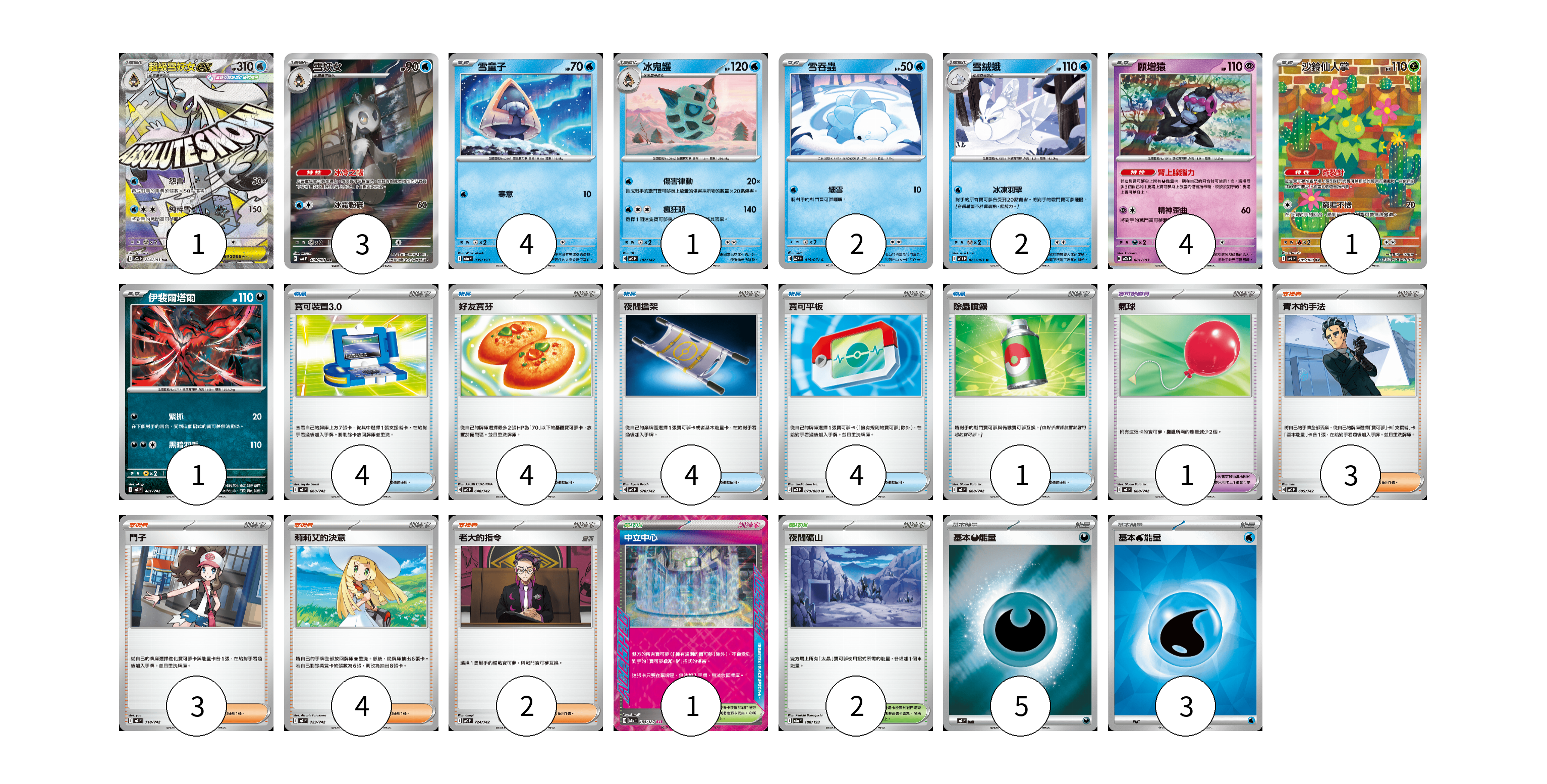 牌組構築方案 以此牌組為基礎新構築牌組 顯示卡面 顯示列表 寶可夢卡(19) 1 3 4 1 2 2 4 1 1 寶可夢道具(1) 1 物品卡(17) 4 4 4 4 1 支援者卡(12) 3 3 4 2 競技場卡(3) 1 2 能量卡(8) 5 3 寶可夢卡(19) 卡牌名稱 張數 卡牌名稱 張數 超級雪妖女ex M2a 224/193 01 雪妖女 SV6 104/101 03 雪童子 M2a 035/193 04 冰鬼護 MC 187/742 01 雪吞蟲 SV5K 019/071 02 雪絨蛾 M1S 025/063 02 願增猿 M2a 081/193 04 沙鈴仙人掌 SV9 101/100 01 伊裴爾塔爾 MC 481/742 01 寶可夢道具(1) 卡牌名稱 張數 卡牌名稱 張數 氣球 MC 688/742 01 物品卡(17) 卡牌名稱 張數 卡牌名稱 張數 寶可裝置3.0 MC 660/742 04 好友寶芬 MC 648/742 04 夜間擔架 MC 670/742 04 寶可平板 M3 070/080 04 除蟲噴霧 MC 668/742 01 支援者卡(12) 卡牌名稱 張數 卡牌名稱 張數 青木的手法 MC 695/742 03 鬥子 MC 718/742 03 莉莉艾的決意 MC 729/742 04 老大的指令 MC 724/742 02 競技場卡(3) 卡牌名稱 張數 卡牌名稱 張數 中立中心 SV8a 184/187 01 夜間礦山 M2a 188/193 02 能量卡(8) 卡牌名稱 張數 卡牌名稱 張數 基本【惡】能量 MC DAR 05 基本【水】能量 SVM WAT 03 以此牌組為基礎新構築牌組 牌組編碼 TffrNa-Hxwplf-XVFdNi copy 列印牌組單 牌組編碼已複製 分享至SNS