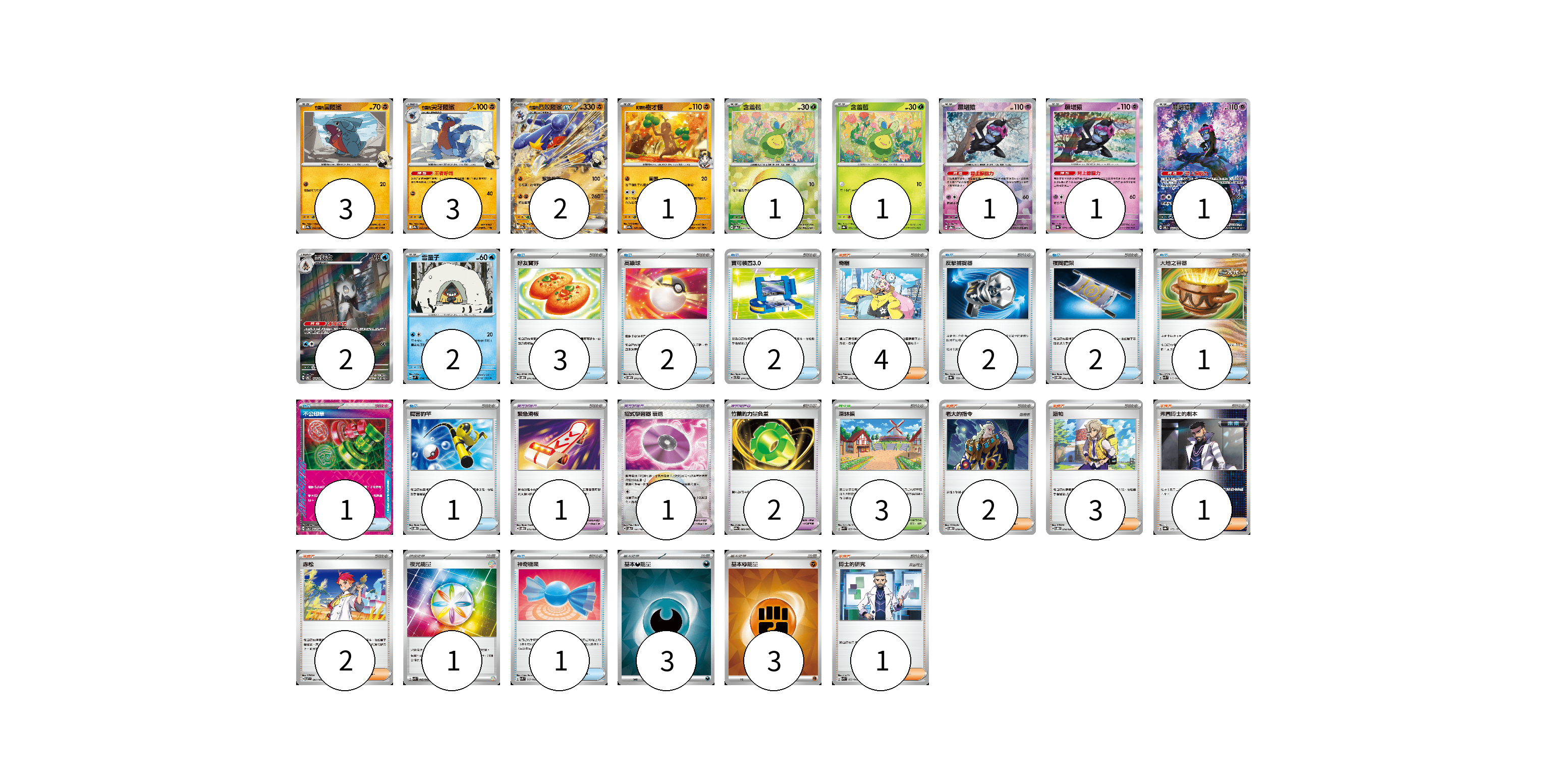 牌組構築方案 以此牌組為基礎新構築牌組 顯示卡面 顯示列表 寶可夢卡(18) 3 3 2 1 1 1 1 1 1 2 2 寶可夢道具(4) 1 1 2 物品卡(15) 3 2 2 2 2 1 1 1 1 支援者卡(13) 4 2 3 1 2 1 競技場卡(3) 3 能量卡(7) 1 3 3 寶可夢卡(18) 卡牌名稱 張數 卡牌名稱 張數 <竹蘭的>圓陸鯊 SV9a 042/063 03 <竹蘭的>尖牙陸鯊 SV9a 043/063 03 <竹蘭的>烈咬陸鯊ex SV9a 044/063 02 <阿響的>樹才怪 SV9a 041/063 01 含羞苞 SV8a 001/187 01 含羞苞 SV8a 001/187 01 願增猿 SV8a 075/187 01 願增猿 SV8a 075/187 01 願增猿 SV6 107/101 01 雪妖女 SV6 104/101 02 雪童子 SVM 034/175 02 寶可夢道具(4) 卡牌名稱 張數 卡牌名稱 張數 緊急滑板 SVOD 015/020 01 招式學習器 衰退 SV8a 161/187 01 竹蘭的力量負重 SV9a 060/063 02 物品卡(15) 卡牌名稱 張數 卡牌名稱 張數 好友寶芬 SVOD 011/020 03 高級球 SVOM 013/021 02 寶可裝置3.0 SVTL 014/021 02 反擊捕捉器 SV8a 139/187 02 夜間擔架 SVOM 016/021 02 大地之容器 SVK 012/042 01 不公印章 SV5a 053/066 01 厲害釣竿 SVOD 010/020 01 神奇糖果 SVK 019/042 01 支援者卡(13) 卡牌名稱 張數 卡牌名稱 張數 奇樹 SVOD 016/020 04 老大的指令 SVOD 019/020 02 派帕 SVOD 018/020 03 弗圖博士的劇本 SV8a 175/187 01 赤松 SV7 097/102 02 博士的研究 SVK 033/042 01 競技場卡(3) 卡牌名稱 張數 卡牌名稱 張數 深缽鎮 SVK 039/042 03 能量卡(7) 卡牌名稱 張數 卡牌名稱 張數 夜光能量 SVK 042/042 01 基本【惡】能量 SVOM DAR 03 基本【鬥】能量 SVK FIG 03 以此牌組為基礎新構築牌組 牌組編碼 TmHWln-QUBWsL-ePVpsQ copy 列印牌組單 牌組編碼已複製 分享至SNS