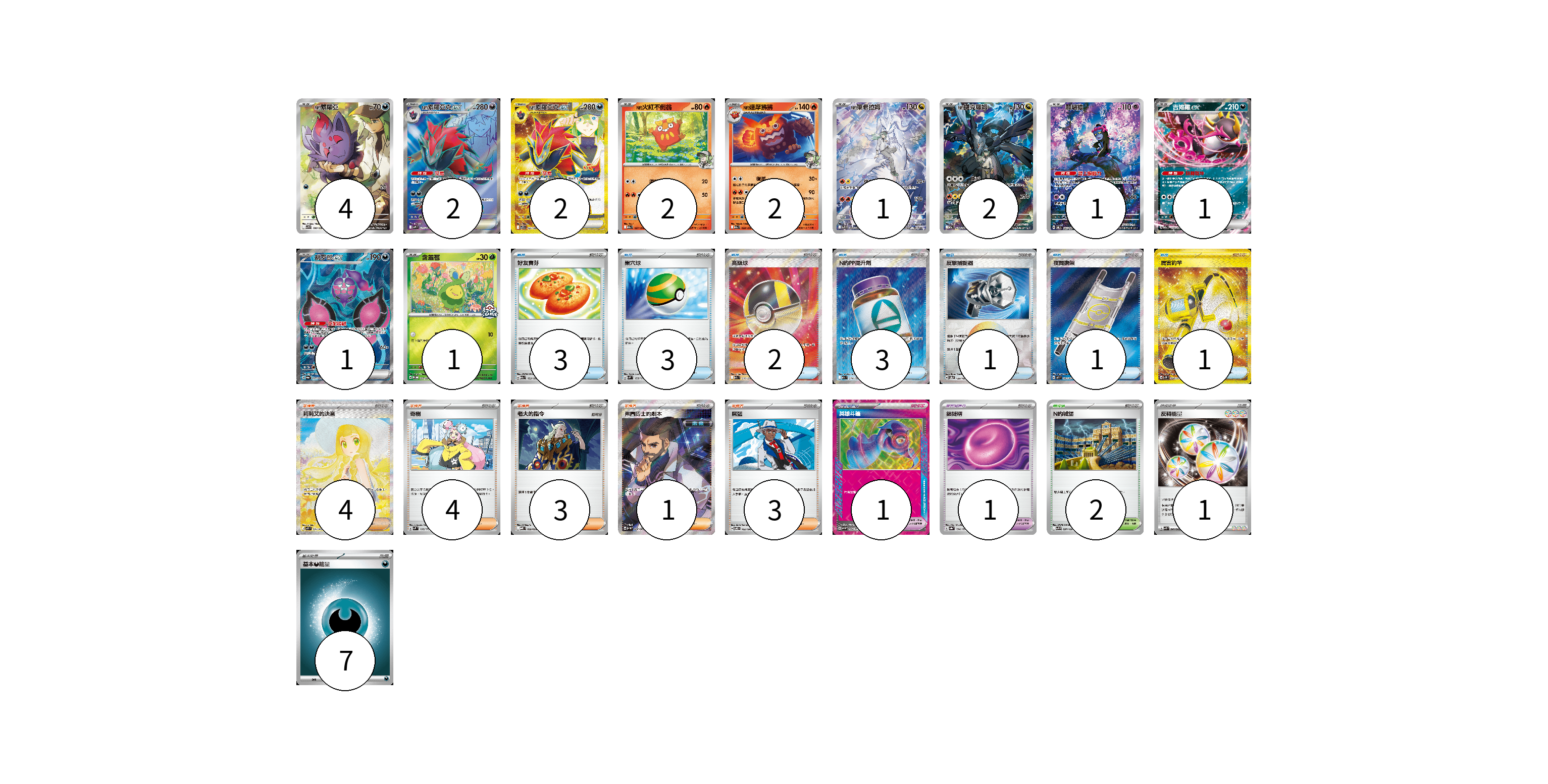 牌組構築方案 以此牌組為基礎新構築牌組 顯示卡面 顯示列表 寶可夢卡(19) 4 2 2 2 2 1 2 1 1 1 1 寶可夢道具(2) 1 1 物品卡(14) 3 3 2 3 1 1 1 支援者卡(15) 4 4 3 1 3 競技場卡(2) 2 能量卡(8) 1 7 寶可夢卡(19) 卡牌名稱 張數 卡牌名稱 張數 N的索羅亞 SV9 108/100 04 N的索羅亞克ex SV9 117/100 02 N的索羅亞克ex SV9 131/100 02 N的火紅不倒翁 M2a 027/193 02 N的達摩狒狒 M2a 028/193 02 N的萊希拉姆 SV9 109/100 01 N的捷克羅姆 M2a 210/193 02 願增猿 SV6 107/101 01 吉雉雞ex M2a 114/193 01 桃歹郎ex SV6a 082/064 01 含羞苞 M-P 037/M-P 01 寶可夢道具(2) 卡牌名稱 張數 卡牌名稱 張數 英雄斗篷 SV5M 064/071 01 鎖鏈糬 SV8a 154/187 01 物品卡(14) 卡牌名稱 張數 卡牌名稱 張數 好友寶芬 M2a 153/193 03 巢穴球 SVM 133/175 03 高級球 M2a 216/193 02 N的PP提升劑 M2a 214/193 03 反擊捕捉器 SV8a 139/187 01 夜間擔架 M1L 083/063 01 厲害釣竿 SV2P 098/071 01 支援者卡(15) 卡牌名稱 張數 卡牌名稱 張數 莉莉艾的決意 M1L 091/063 04 奇樹 SVM 160/175 04 老大的指令 MBD 020/022 03 弗圖博士的劇本 SV4M 086/066 01 席藍 SV8 102/106 03 競技場卡(2) 卡牌名稱 張數 卡牌名稱 張數 N的城堡 SV9 097/100 02 能量卡(8) 卡牌名稱 張數 卡牌名稱 張數 反轉能量 SVK 041/042 01 基本【惡】能量 MBG DAR 07 以此牌組為基礎新構築牌組 牌組編碼 TmTekE-pKxWiE-JxzdiZ copy 列印牌組單 牌組編碼已複製 分享至SNS