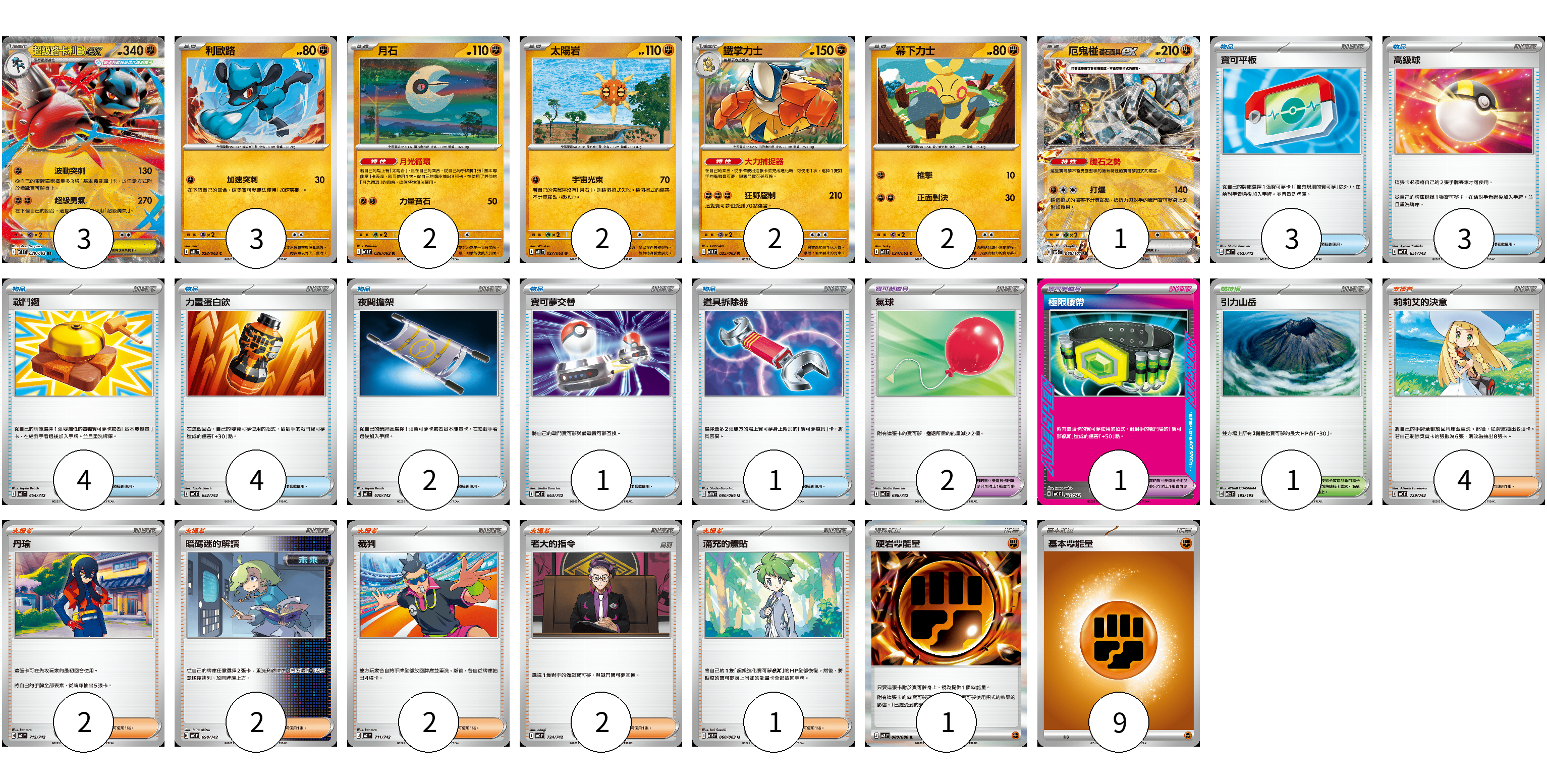 牌組構築方案 以此牌組為基礎新構築牌組 顯示卡面 顯示列表 寶可夢卡(15) 3 3 2 2 2 2 1 寶可夢道具(3) 2 1 物品卡(18) 3 3 4 4 2 1 1 支援者卡(13) 4 2 2 2 2 1 競技場卡(1) 1 能量卡(10) 1 9 寶可夢卡(15) 卡牌名稱 張數 卡牌名稱 張數 超級路卡利歐ex M1L 029/063 03 利歐路 M1L 028/063 03 月石 M1L 026/063 02 太陽岩 M1L 027/063 02 鐵掌力士 M1L 025/063 02 幕下力士 M1L 024/063 02 厄鬼椪 礎石面具ex SV6 065/101 01 寶可夢道具(3) 卡牌名稱 張數 卡牌名稱 張數 氣球 MC 688/742 02 極限腰帶 MC 691/742 01 物品卡(18) 卡牌名稱 張數 卡牌名稱 張數 寶可平板 MC 662/742 03 高級球 MC 651/742 03 戰鬥鑼 MC 654/742 04 力量蛋白飲 MC 652/742 04 夜間擔架 MC 670/742 02 寶可夢交替 MC 663/742 01 道具拆除器 SV11W 080/086 01 支援者卡(13) 卡牌名稱 張數 卡牌名稱 張數 莉莉艾的決意 MC 729/742 04 丹瑜 MC 715/742 02 暗碼迷的解讀 MC 698/742 02 裁判 MC 711/742 02 老大的指令 MC 724/742 02 滿充的體貼 M1S 060/063 01 競技場卡(1) 卡牌名稱 張數 卡牌名稱 張數 引力山岳 M2a 183/193 01 能量卡(10) 卡牌名稱 張數 卡牌名稱 張數 硬岩【鬥】能量 M3 080/080 01 基本【鬥】能量 MC FIG 09 以此牌組為基礎新構築牌組 牌組編碼 TmUFDa-GciyWP-ZJJqPt copy 列印牌組單 牌組編碼已複製 分享至SNS