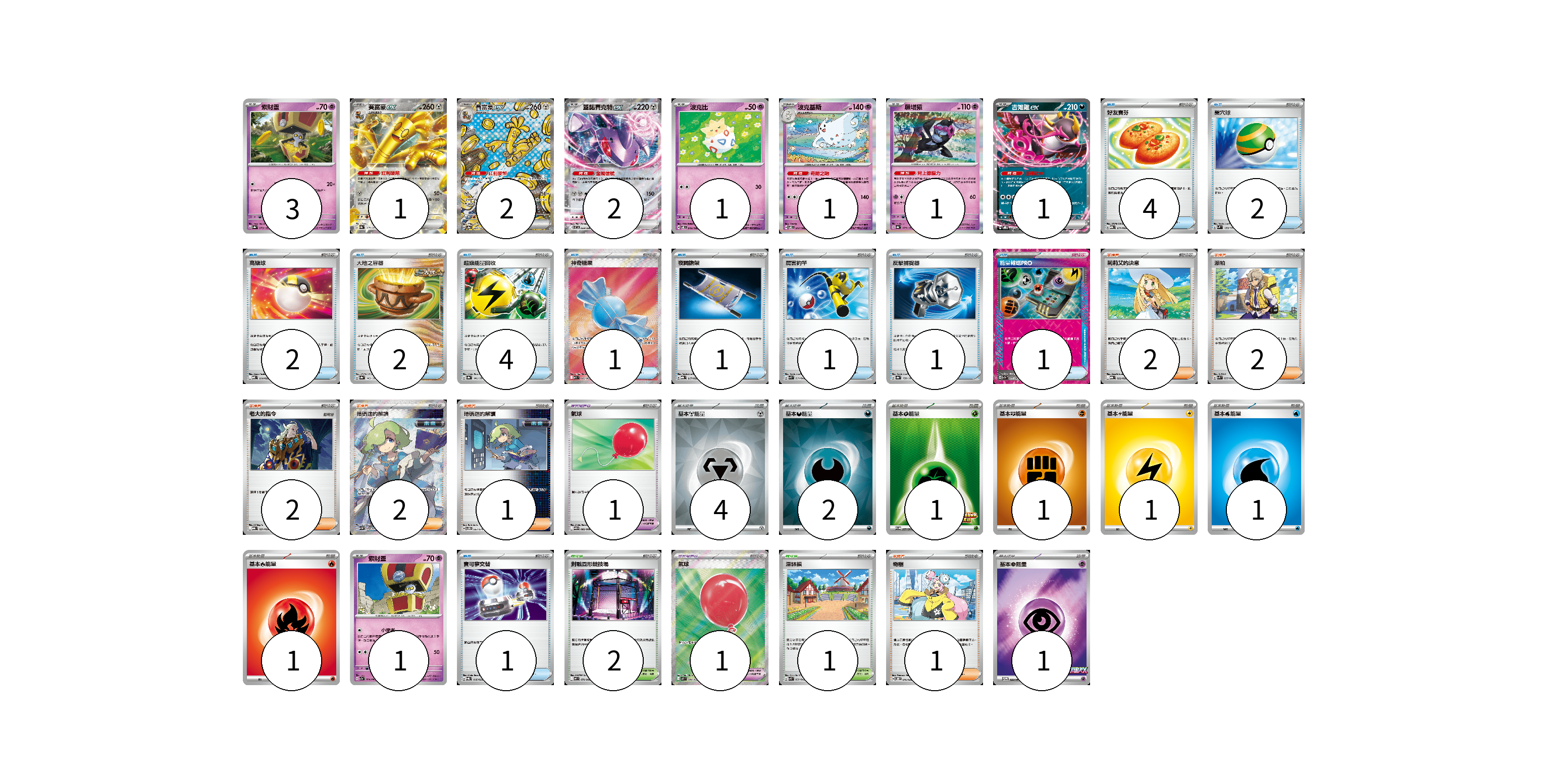 牌組構築方案 以此牌組為基礎新構築牌組 顯示卡面 顯示列表 寶可夢卡(13) 3 1 2 2 1 1 1 1 1 寶可夢道具(2) 1 1 物品卡(20) 4 2 2 2 4 1 1 1 1 1 1 支援者卡(10) 2 2 2 2 1 1 競技場卡(3) 2 1 能量卡(12) 4 2 1 1 1 1 1 1 寶可夢卡(13) 卡牌名稱 張數 卡牌名稱 張數 索財靈 SV8a 073/187 03 賽富豪ex SV8a 117/187 01 賽富豪ex SV8a 220/187 02 蓋諾賽克特ex SV11B 069/086 02 波克比 SV8 045/106 01 波克基斯 SV8 047/106 01 願增猿 SV8a 075/187 01 吉雉雞ex SVOD 004/020 01 索財靈 SV7a 024/064 01 寶可夢道具(2) 卡牌名稱 張數 卡牌名稱 張數 氣球 SV11B 082/086 01 氣球 M1L 084/063 01 物品卡(20) 卡牌名稱 張數 卡牌名稱 張數 好友寶芬 MBG 011/022 04 巢穴球 SVM 133/175 02 高級球 MBD 014/022 02 大地之容器 SV8a 143/187 02 超級能量回收 SV8a 141/187 04 神奇糖果 M1S 082/063 01 夜間擔架 MBG 017/022 01 厲害釣竿 SVK 011/042 01 反擊捕捉器 SV8a 139/187 01 能量輸送PRO SV7a 052/064 01 寶可夢交替 SVQL 016/022 01 支援者卡(10) 卡牌名稱 張數 卡牌名稱 張數 莉莉艾的決意 MBG 022/022 02 派帕 SVK 035/042 02 老大的指令 MBG 021/022 02 暗碼迷的解讀 SV5M 090/071 02 暗碼迷的解讀 SV5M 067/071 01 奇樹 SVOD 016/020 01 競技場卡(3) 卡牌名稱 張數 卡牌名稱 張數 對戰圓形競技場 M2 079/080 02 深缽鎮 SVK 039/042 01 能量卡(12) 卡牌名稱 張數 卡牌名稱 張數 基本【鋼】能量 SVOD MET 04 基本【惡】能量 SVOM DAR 02 基本【草】能量 SV-P 257/SV-P 01 基本【鬥】能量 SVAM FIG 01 基本【雷】能量 SVAL LIG 01 基本【水】能量 SVAW WAT 01 基本【火】能量 SVAL FIR 01 基本【超】能量 M-P 033/M-P 01 以此牌組為基礎新構築牌組 牌組編碼 TmcMNS-SKYoLP-UuHRZb copy 列印牌組單 牌組編碼已複製 分享至SNS
