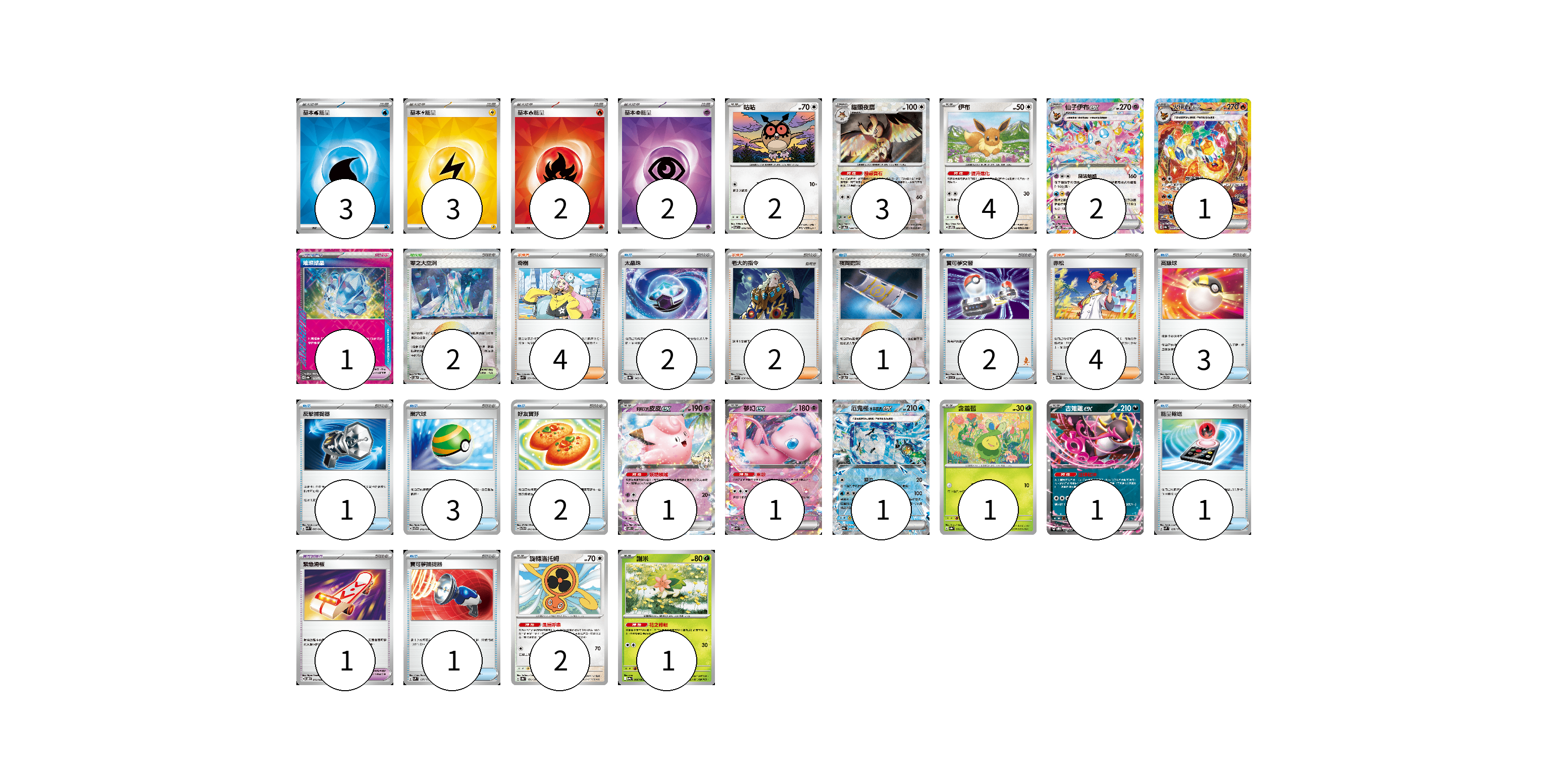 牌組構築方案 以此牌組為基礎新構築牌組 顯示卡面 顯示列表 寶可夢卡(20) 2 3 4 2 1 1 1 1 1 1 2 1 寶可夢道具(2) 1 1 物品卡(16) 2 1 2 3 1 3 2 1 1 支援者卡(10) 4 2 4 競技場卡(2) 2 能量卡(10) 3 3 2 2 寶可夢卡(20) 卡牌名稱 張數 卡牌名稱 張數 咕咕 SV7 076/102 02 貓頭夜鷹 SV8a 128/187 03 伊布 SVPN 008/008 04 仙子伊布ex SVPN 005/008 02 火伊布ex SV8a 202/187 01 莉莉艾的皮皮ex SV9 033/100 01 夢幻ex SVK 001/042 01 厄鬼椪 水井面具ex SV8a 050/187 01 含羞苞 SV8a 001/187 01 吉雉雞ex SVOD 004/020 01 旋轉洛托姆 SV8a 131/187 02 謝米 SV9a 006/063 01 寶可夢道具(2) 卡牌名稱 張數 卡牌名稱 張數 璀璨結晶 SV8a 152/187 01 緊急滑板 SVOD 015/020 01 物品卡(16) 卡牌名稱 張數 卡牌名稱 張數 太晶珠 SV8a 145/187 02 夜間擔架 SV8a 151/187 01 寶可夢交替 SVI 054/066 02 高級球 SVTH 011/018 03 反擊捕捉器 SVK 009/042 01 巢穴球 SVTG 012/019 03 好友寶芬 SVTG 011/019 02 能量輸送 SVM 128/175 01 寶可夢捕捉器 SVM 137/175 01 支援者卡(10) 卡牌名稱 張數 卡牌名稱 張數 奇樹 SVK 031/042 04 老大的指令 SVK 036/042 02 赤松 SV8a 163/187 04 競技場卡(2) 卡牌名稱 張數 卡牌名稱 張數 零之大空洞 SV8a 182/187 02 能量卡(10) 卡牌名稱 張數 卡牌名稱 張數 基本【水】能量 SVK WAT 03 基本【雷】能量 SVK LIG 03 基本【火】能量 SVK FIR 02 基本【超】能量 SVK PSY 02 以此牌組為基礎新構築牌組 牌組編碼 TntCTx-EHkynu-NuLlMc copy 列印牌組單 牌組編碼已複製 分享至SNS