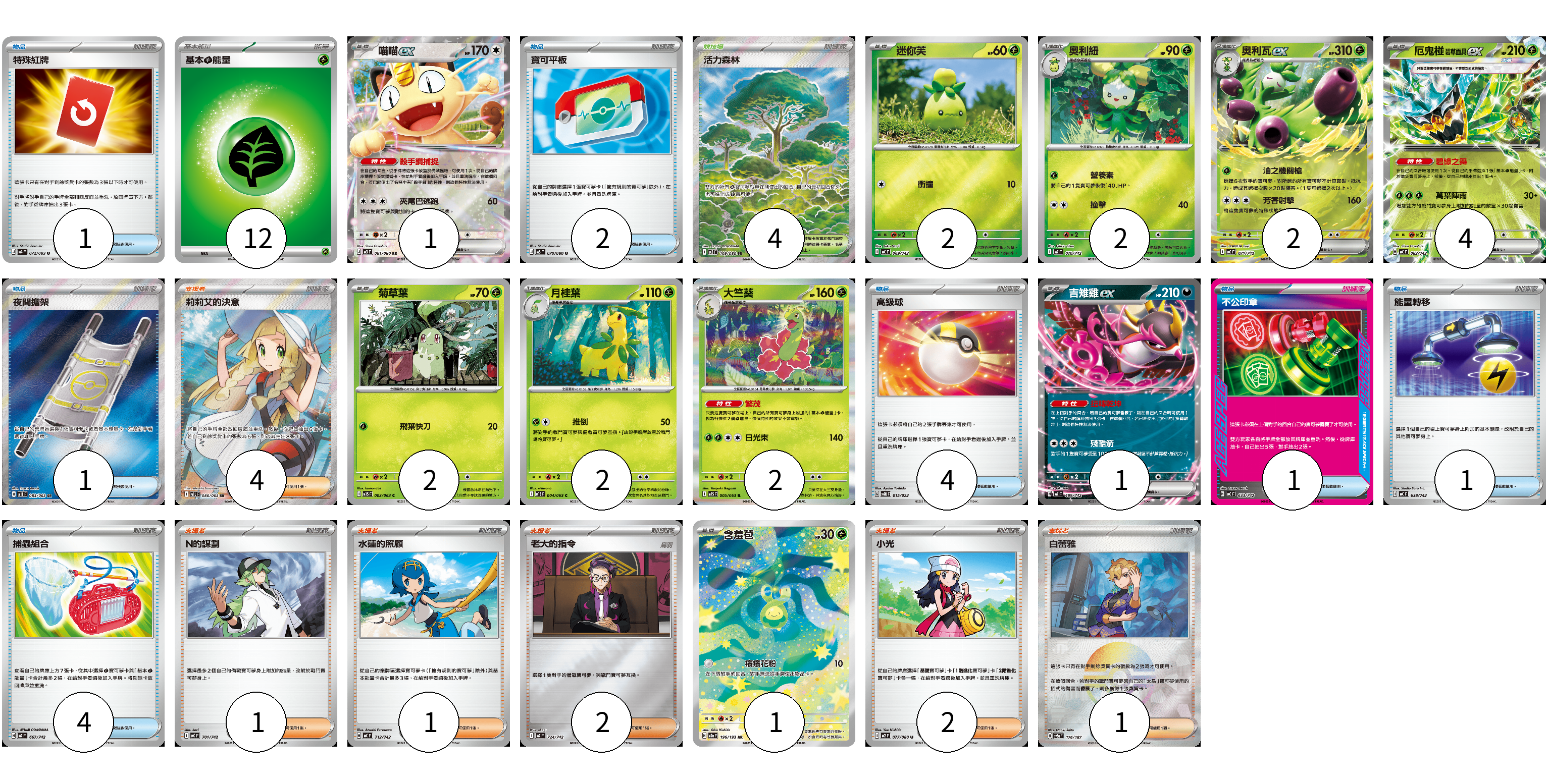 牌組構築方案 以此牌組為基礎新構築牌組 顯示卡面 顯示列表 寶可夢卡(19) 1 2 2 2 4 2 2 2 1 1 物品卡(14) 1 2 1 4 1 1 4 支援者卡(11) 4 1 1 2 2 1 競技場卡(4) 4 能量卡(12) 12 寶可夢卡(19) 卡牌名稱 張數 卡牌名稱 張數 喵喵ex M3 061/080 01 迷你芙 MC 069/742 02 奧利紐 MC 070/742 02 奧利瓦ex MC 071/742 02 厄鬼椪 碧草面具ex MC 082/742 04 菊草葉 M1S 003/063 02 月桂葉 M1S 004/063 02 大竺葵 M1S 005/063 02 吉雉雞ex MC 489/742 01 含羞苞 M2a 196/193 01 物品卡(14) 卡牌名稱 張數 卡牌名稱 張數 特殊紅牌 M4 072/083 01 寶可平板 M3 070/080 02 夜間擔架 M1L 083/063 01 高級球 SVQL 015/022 04 不公印章 MC 633/742 01 能量轉移 MC 638/742 01 捕蟲組合 MC 667/742 04 支援者卡(11) 卡牌名稱 張數 卡牌名稱 張數 莉莉艾的決意 M1L 086/063 04 N的謀劃 MC 701/742 01 水蓮的照顧 MC 712/742 01 老大的指令 MC 724/742 02 小光 M2 077/080 02 白蕾雅 SV8a 176/187 01 競技場卡(4) 卡牌名稱 張數 卡牌名稱 張數 活力森林 M3 109/080 04 能量卡(12) 卡牌名稱 張數 卡牌名稱 張數 基本【草】能量 MJ GRA 12 以此牌組為基礎新構築牌組 牌組編碼 TodFWZ-ULTYTs-HrPZHV copy 列印牌組單 牌組編碼已複製 分享至SNS