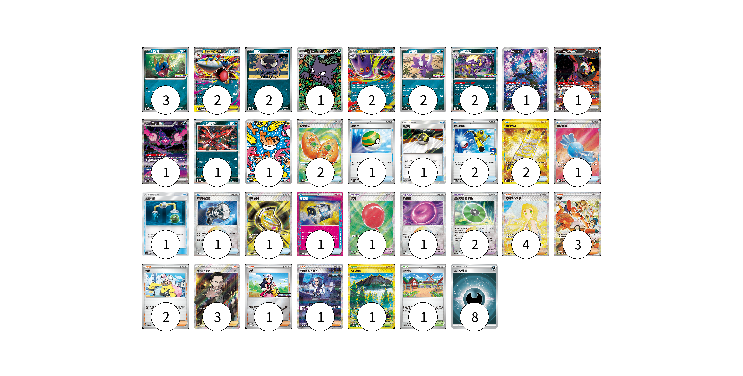 牌組構築方案 以此牌組為基礎新構築牌組 顯示卡面 顯示列表 寶可夢卡(19) 3 2 2 1 2 2 2 1 1 1 1 1 寶可夢道具(4) 1 1 2 物品卡(13) 2 1 1 2 2 1 1 1 1 1 支援者卡(14) 4 3 2 3 1 1 競技場卡(2) 1 1 能量卡(8) 8 寶可夢卡(19) 卡牌名稱 張數 卡牌名稱 張數 利牙魚 M-P 026/M-P 03 超級巨牙鯊ex M2 051/080 02 鬼斯 MBG 001/022 02 鬼斯通 MBG 023/022 01 超級耿鬼ex MBG 003/022 02 毒電嬰 M-P 027/M-P 02 顫弦蠑螈 M-P 031/M-P 02 願增猿 SV6 107/101 01 吉雉雞ex SV6a 089/064 01 桃歹郎ex SV6a 090/064 01 伊裴爾塔爾 M1L 040/063 01 米立龍 SV6 112/101 01 寶可夢道具(4) 卡牌名稱 張數 卡牌名稱 張數 氣球 M1L 084/063 01 鎖鏈糬 SV8a 154/187 01 招式學習器 演進 SV8a 160/187 02 物品卡(13) 卡牌名稱 張數 卡牌名稱 張數 好友寶芬 M1S 081/063 02 巢穴球 SVM 133/175 01 高級球 AS5b 178/186 01 厲害釣竿 SV-P 112/SV-P 02 夜間擔架 SV8 137/106 02 神奇糖果 M1S 082/063 01 能量轉移 AC1D 132/157 01 反擊捕捉器 SV8a 139/187 01 超級信號 M1S 083/063 01 秘密箱 SV6 092/101 01 支援者卡(14) 卡牌名稱 張數 卡牌名稱 張數 莉莉艾的決意 M1L 091/063 04 派帕 SV4a 353/190 03 奇樹 SVM 160/175 02 老大的指令(坂木) SC1b 170/153 03 小光 M-P 028/M-P 01 弗圖博士的劇本 SV4M 091/066 01 競技場卡(2) 卡牌名稱 張數 卡牌名稱 張數 引力山岳 SV8 138/106 01 深缽鎮 SVK 039/042 01 能量卡(8) 卡牌名稱 張數 卡牌名稱 張數 基本惡能量 SLD DAR 08 以此牌組為基礎新構築牌組 牌組編碼 Tqeadk-rMxTxN-JJAvkl copy 列印牌組單 牌組編碼已複製 分享至SNS