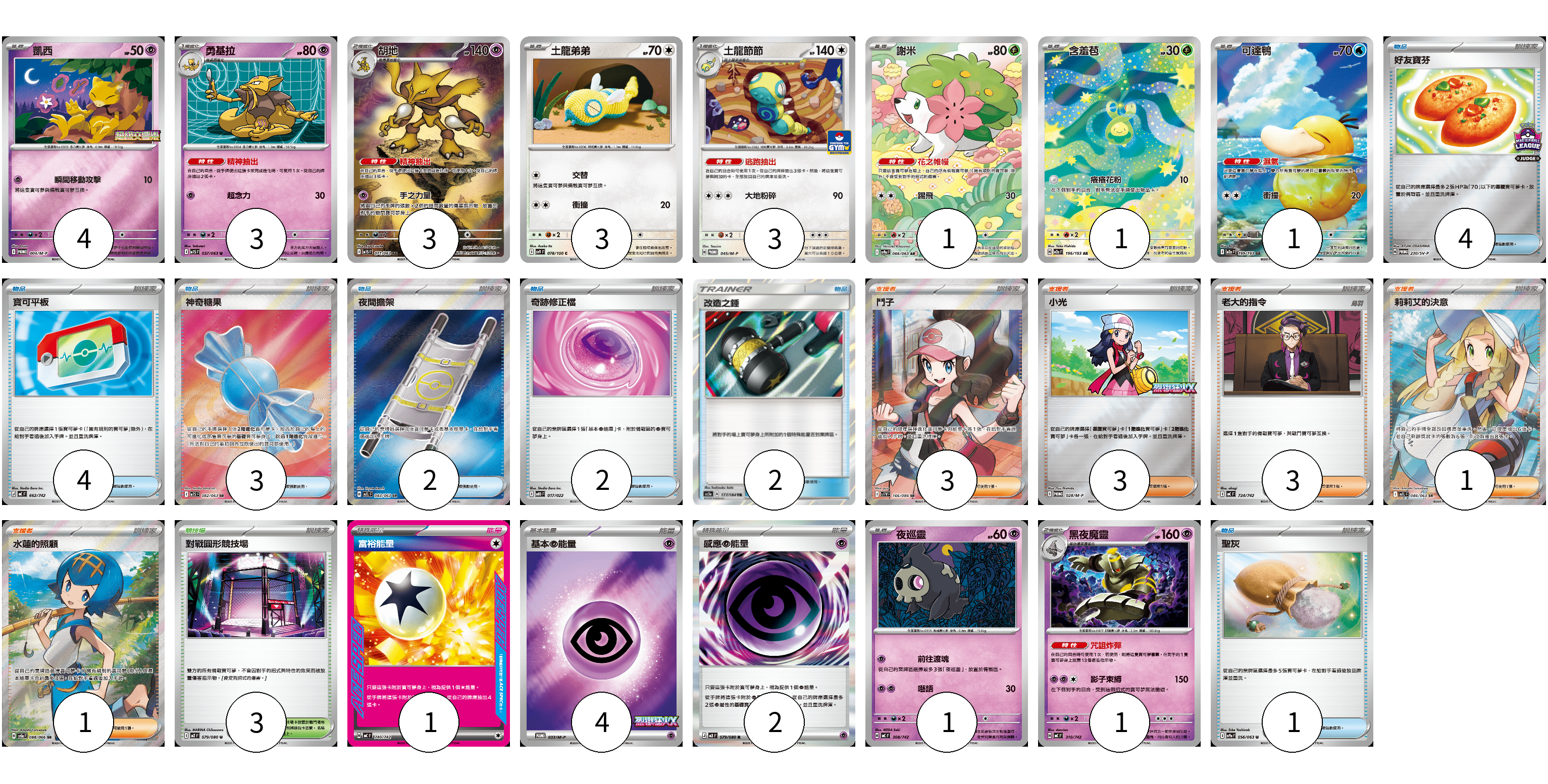 牌組構築方案 以此牌組為基礎新構築牌組 顯示卡面 顯示列表 寶可夢卡(21) 4 3 3 3 3 1 1 1 1 1 物品卡(18) 4 4 3 2 2 2 1 支援者卡(11) 3 3 3 1 1 競技場卡(3) 3 能量卡(7) 1 4 2 寶可夢卡(21) 卡牌名稱 張數 卡牌名稱 張數 凱西 M-P 004/M-P 04 勇基拉 M1S 037/063 03 胡地 M1S 071/063 03 土龍弟弟 SV9 078/100 03 土龍節節 M-P 045/M-P 03 謝米 SV9a 066/063 01 含羞苞 M2a 196/193 01 可達鴨 M2a 199/193 01 夜巡靈 MC 308/742 01 黑夜魔靈 MC 310/742 01 物品卡(18) 卡牌名稱 張數 卡牌名稱 張數 好友寶芬 SV-P 230/SV-P 04 寶可平板 MC 662/742 04 神奇糖果 M1S 082/063 03 夜間擔架 M1L 083/063 02 奇跡修正檔 MBD 017/022 02 改造之錘 AS5a 177/184 02 聖灰 SV9a 056/063 01 支援者卡(11) 卡牌名稱 張數 卡牌名稱 張數 鬥子 SV11W 166/086 03 小光 M-P 028/M-P 03 老大的指令 MC 724/742 03 莉莉艾的決意 M1L 086/063 01 水蓮的照顧 SV5a 088/066 01 競技場卡(3) 卡牌名稱 張數 卡牌名稱 張數 對戰圓形競技場 M2 079/080 03 能量卡(7) 卡牌名稱 張數 卡牌名稱 張數 富裕能量 MC 740/742 01 基本【超】能量 M-P 033/M-P 04 感應【超】能量 M3 079/080 02 以此牌組為基礎新構築牌組 牌組編碼 TuamJS-pHBiKh-UbtpxO copy 列印牌組單 牌組編碼已複製 分享至SNS