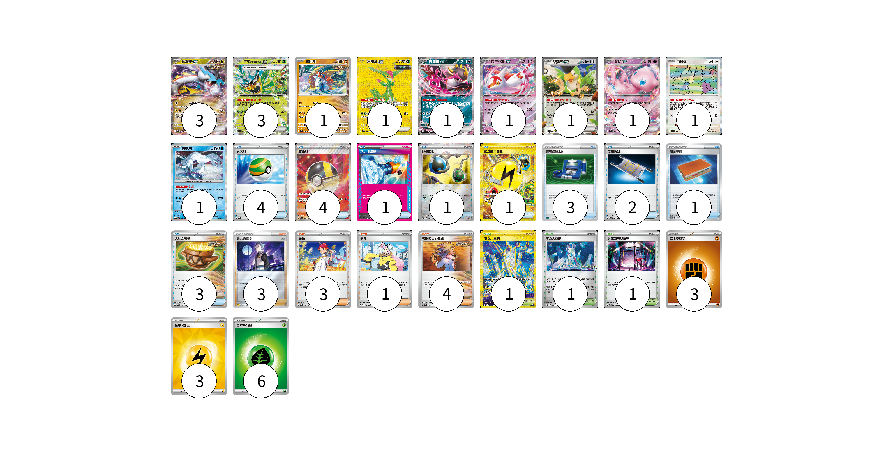牌組構築方案 以此牌組為基礎新構築牌組 顯示卡面 顯示列表 寶可夢卡(14) 3 3 1 1 1 1 1 1 1 1 物品卡(20) 4 4 1 1 1 3 2 1 3 支援者卡(11) 3 3 1 4 競技場卡(3) 1 1 1 能量卡(12) 3 3 6 寶可夢卡(14) 卡牌名稱 張數 卡牌名稱 張數 猛雷鼓ex SV5K 053/071 03 厄鬼椪 碧草面具ex M2a 017/193 03 爬地翅 SV4K 041/066 01 鐵斑葉ex SV5M 098/071 01 吉雉雞ex M2a 114/193 01 拉帝亞斯ex M2a 075/193 01 怒鸚哥ex SVK 006/042 01 夢幻ex SV4a 076/190 01 百變怪 SV4a 144/190 01 古劍豹 M2a 043/193 01 物品卡(20) 卡牌名稱 張數 卡牌名稱 張數 巢穴球 SVM 133/175 04 高級球 M2a 216/193 04 頂尖捕捉器 MBG 014/022 01 能量回收 SV11W 079/086 01 超級能量回收 SV2D 098/071 01 寶可齒輪3.0 SLD 014/020 03 夜間擔架 M2a 159/193 02 朋友手冊 SC2D 141/157 01 大地之容器 SV8a 143/187 03 支援者卡(11) 卡牌名稱 張數 卡牌名稱 張數 老大的指令(赤日) SPZ 020/020 03 赤松 SV8a 163/187 03 奇樹 SVOD 016/020 01 奧琳博士的氣魄 SV8a 167/187 04 競技場卡(3) 卡牌名稱 張數 卡牌名稱 張數 零之大空洞 SV7 135/102 01 零之大空洞 SV-P 151/SV-P 01 對戰圓形競技場 M2 079/080 01 能量卡(12) 卡牌名稱 張數 卡牌名稱 張數 基本【鬥】能量 M-P FIG 03 基本【雷】能量 SVQP LIG 03 基本【草】能量 M-P GRA 06 以此牌組為基礎新構築牌組 牌組編碼 TwmCTY-DwAXxl-ewWUvn copy 列印牌組單 牌組編碼已複製 分享至SNS
