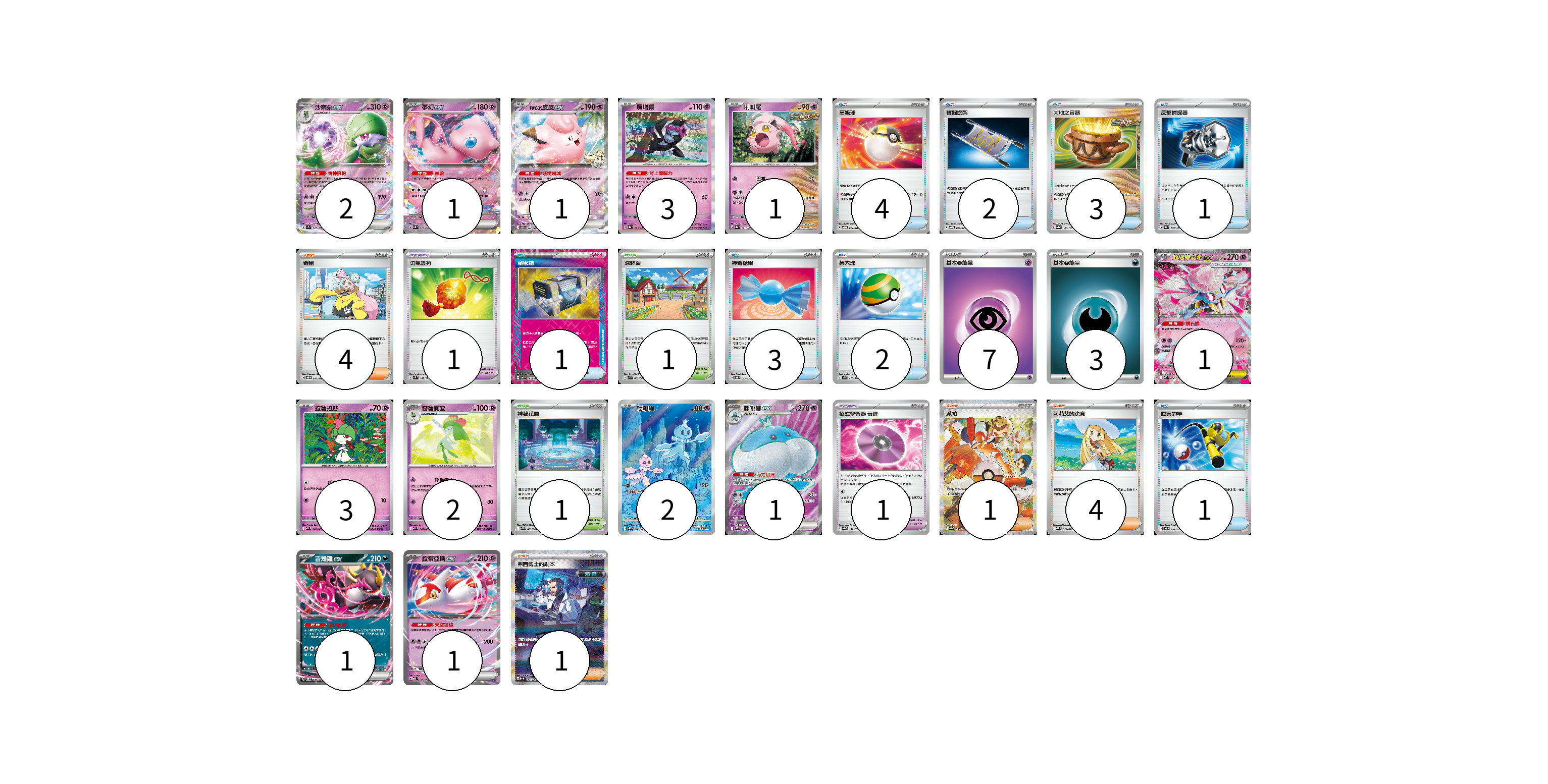 牌組構築方案 以此牌組為基礎新構築牌組 顯示卡面 顯示列表 寶可夢卡(19) 2 1 1 3 1 1 3 2 2 1 1 1 寶可夢道具(2) 1 1 物品卡(17) 4 2 3 1 1 3 2 1 支援者卡(10) 4 1 4 1 競技場卡(2) 1 1 能量卡(10) 7 3 寶可夢卡(19) 卡牌名稱 張數 卡牌名稱 張數 沙奈朵ex SV1S 028/078 02 夢幻ex SVK 001/042 01 莉莉艾的皮皮ex SV9 033/100 01 願增猿 SV8a 075/187 03 吼叫尾 SV8a 071/187 01 超級蒂安希ex MBD 006/022 01 拉魯拉絲 M1S 040/063 03 奇魯莉安 M1S 041/063 02 輕飄飄 SV11W 124/086 02 胖嘟嘟ex SV11W 162/086 01 吉雉雞ex SVOM 009/021 01 拉帝亞斯ex MBD 003/022 01 寶可夢道具(2) 卡牌名稱 張數 卡牌名稱 張數 勇氣護符 SVM 142/175 01 招式學習器 衰退 SV8a 161/187 01 物品卡(17) 卡牌名稱 張數 卡牌名稱 張數 高級球 SVOD 012/020 04 夜間擔架 SVOM 016/021 02 大地之容器 SV8a 143/187 03 反擊捕捉器 SV8a 139/187 01 秘密箱 SV6 092/101 01 神奇糖果 SVOD 013/020 03 巢穴球 SV1S 070/078 02 厲害釣竿 SVOD 010/020 01 支援者卡(10) 卡牌名稱 張數 卡牌名稱 張數 奇樹 SVOD 016/020 04 派帕 SV4a 353/190 01 莉莉艾的決意 MBD 021/022 04 弗圖博士的劇本 SV4M 091/066 01 競技場卡(2) 卡牌名稱 張數 卡牌名稱 張數 深缽鎮 SVK 039/042 01 神秘花園 M1S 063/063 01 能量卡(10) 卡牌名稱 張數 卡牌名稱 張數 基本【超】能量 SVEM PSY 07 基本【惡】能量 SVF DAR 03 以此牌組為基礎新構築牌組 牌組編碼 TyXHGf-XQHqPF-WmcLUK copy 列印牌組單 牌組編碼已複製 分享至SNS