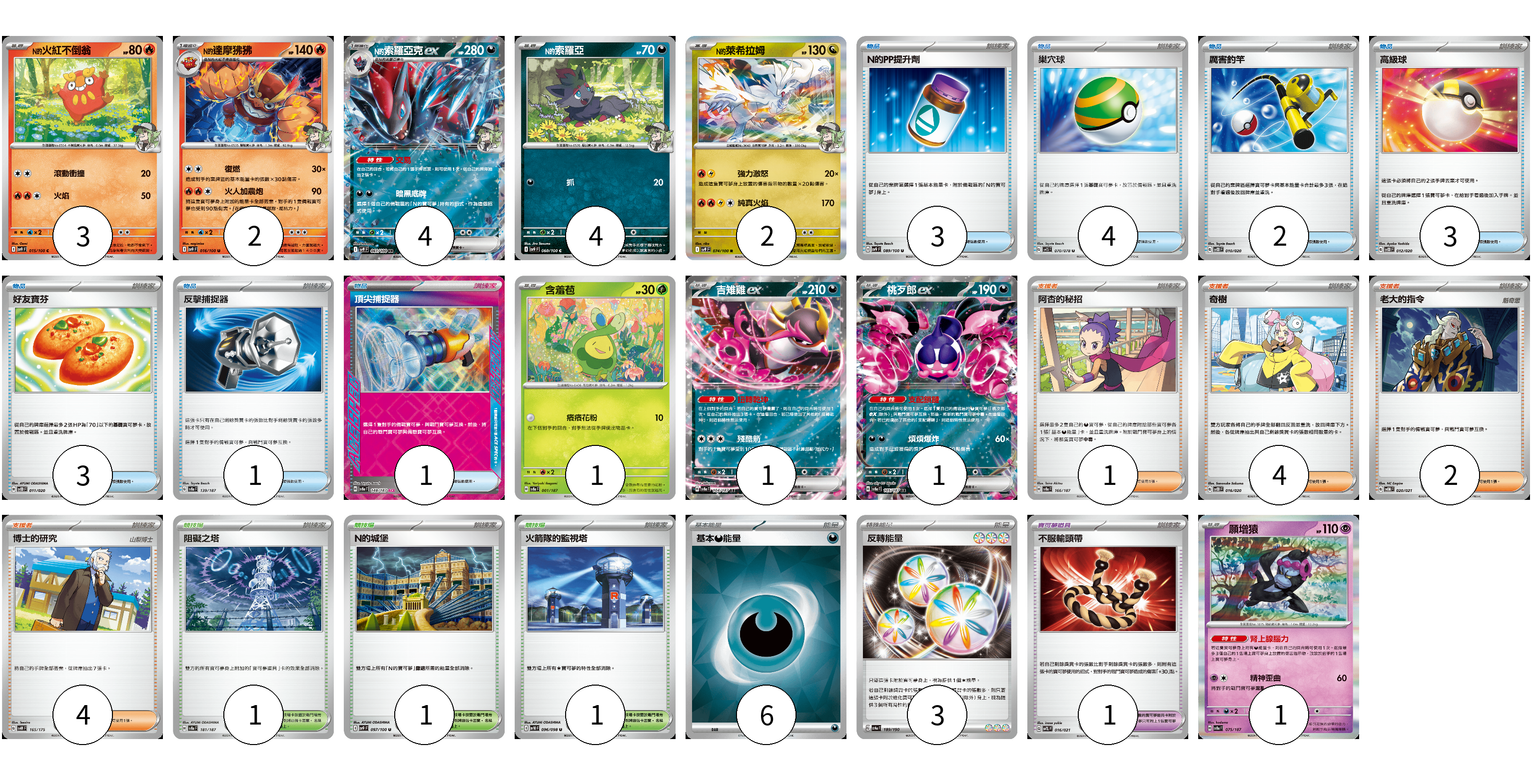 牌組構築方案 以此牌組為基礎新構築牌組 顯示卡面 顯示列表 寶可夢卡(19) 3 2 4 4 2 1 1 1 1 寶可夢道具(1) 1 物品卡(17) 3 4 2 3 3 1 1 支援者卡(11) 1 4 2 4 競技場卡(3) 1 1 1 能量卡(9) 6 3 寶可夢卡(19) 卡牌名稱 張數 卡牌名稱 張數 N的火紅不倒翁 SV9 015/100 03 N的達摩狒狒 SV9 016/100 02 N的索羅亞克ex SV9 061/100 04 N的索羅亞 SV9 060/100 04 N的萊希拉姆 SV9 074/100 02 含羞苞 SV8a 001/187 01 吉雉雞ex SV8a 104/187 01 桃歹郎ex SV8a 105/187 01 願增猿 SV8a 075/187 01 寶可夢道具(1) 卡牌名稱 張數 卡牌名稱 張數 不服輸頭帶 SVTL 016/021 01 物品卡(17) 卡牌名稱 張數 卡牌名稱 張數 N的PP提升劑 SV9 089/100 03 巢穴球 SV1S 070/078 04 厲害釣竿 SVOD 010/020 02 高級球 SVOD 012/020 03 好友寶芬 SVOD 011/020 03 反擊捕捉器 SV8a 139/187 01 頂尖捕捉器 SV8a 148/187 01 支援者卡(11) 卡牌名稱 張數 卡牌名稱 張數 阿杏的秘招 SV8a 166/187 01 奇樹 SVOD 016/020 04 老大的指令 SVOM 020/021 02 博士的研究 SVM 165/175 04 競技場卡(3) 卡牌名稱 張數 卡牌名稱 張數 阻礙之塔 SV8a 181/187 01 N的城堡 SV9 097/100 01 火箭隊的監視塔 SV10 096/098 01 能量卡(9) 卡牌名稱 張數 卡牌名稱 張數 基本【惡】能量 SVOM DAR 06 反轉能量 SV4a 189/190 03 以此牌組為基礎新構築牌組 牌組編碼 UGQQyn-hdooTT-aEWuib copy 列印牌組單 牌組編碼已複製 分享至SNS