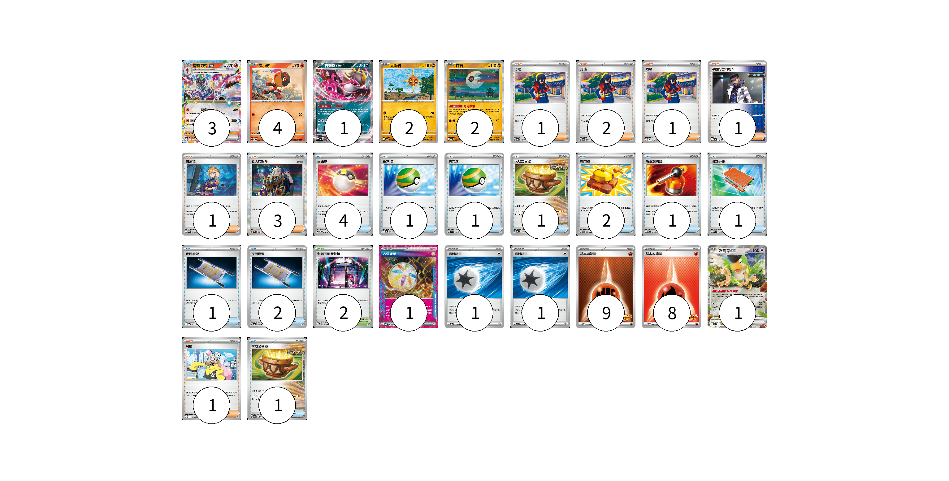 牌組構築方案 以此牌組為基礎新構築牌組 顯示卡面 顯示列表 寶可夢卡(13) 3 4 1 2 2 1 物品卡(15) 4 1 1 1 2 1 1 1 2 1 支援者卡(10) 1 2 1 1 1 3 1 競技場卡(2) 2 能量卡(20) 1 1 1 9 8 寶可夢卡(13) 卡牌名稱 張數 卡牌名稱 張數 蒼炎刃鬼ex SVPS 006/008 03 炭小侍 SVPS 005/008 04 吉雉雞ex SV6a 038/064 01 太陽岩 M1L 027/063 02 月石 M1L 026/063 02 怒鸚哥ex SV2P 065/071 01 物品卡(15) 卡牌名稱 張數 卡牌名稱 張數 高級球 SVOM 013/021 04 巢穴球 SVHK 012/022 01 巢穴球 SV1S 070/078 01 大地之容器 SV4K 060/066 01 戰鬥鑼 M1L 059/063 02 高溫燃燒器 M2 074/080 01 朋友手冊 SVK 014/042 01 夜間擔架 SV8a 151/187 01 夜間擔架 SV6a 056/064 02 大地之容器 SVK 012/042 01 支援者卡(10) 卡牌名稱 張數 卡牌名稱 張數 丹瑜 SV8a 170/187 01 丹瑜 SVK 030/042 02 丹瑜 SV6 097/101 01 弗圖博士的劇本 SV4M 065/066 01 白蕾雅 SV8a 176/187 01 老大的指令 SV4a 181/190 03 奇樹 SVOD 016/020 01 競技場卡(2) 卡牌名稱 張數 卡牌名稱 張數 對戰圓形競技場 M2 079/080 02 能量卡(20) 卡牌名稱 張數 卡牌名稱 張數 古舊能量 SV6 101/101 01 噴射能量 SV8a 185/187 01 噴射能量 SVK 040/042 01 基本【鬥】能量 SV-P 262/SV-P 09 基本【火】能量 SV-P 258/SV-P 08 以此牌組為基礎新構築牌組 牌組編碼 UHKcvN-XiBysA-nHHhPK copy 列印牌組單 牌組編碼已複製 分享至SNS