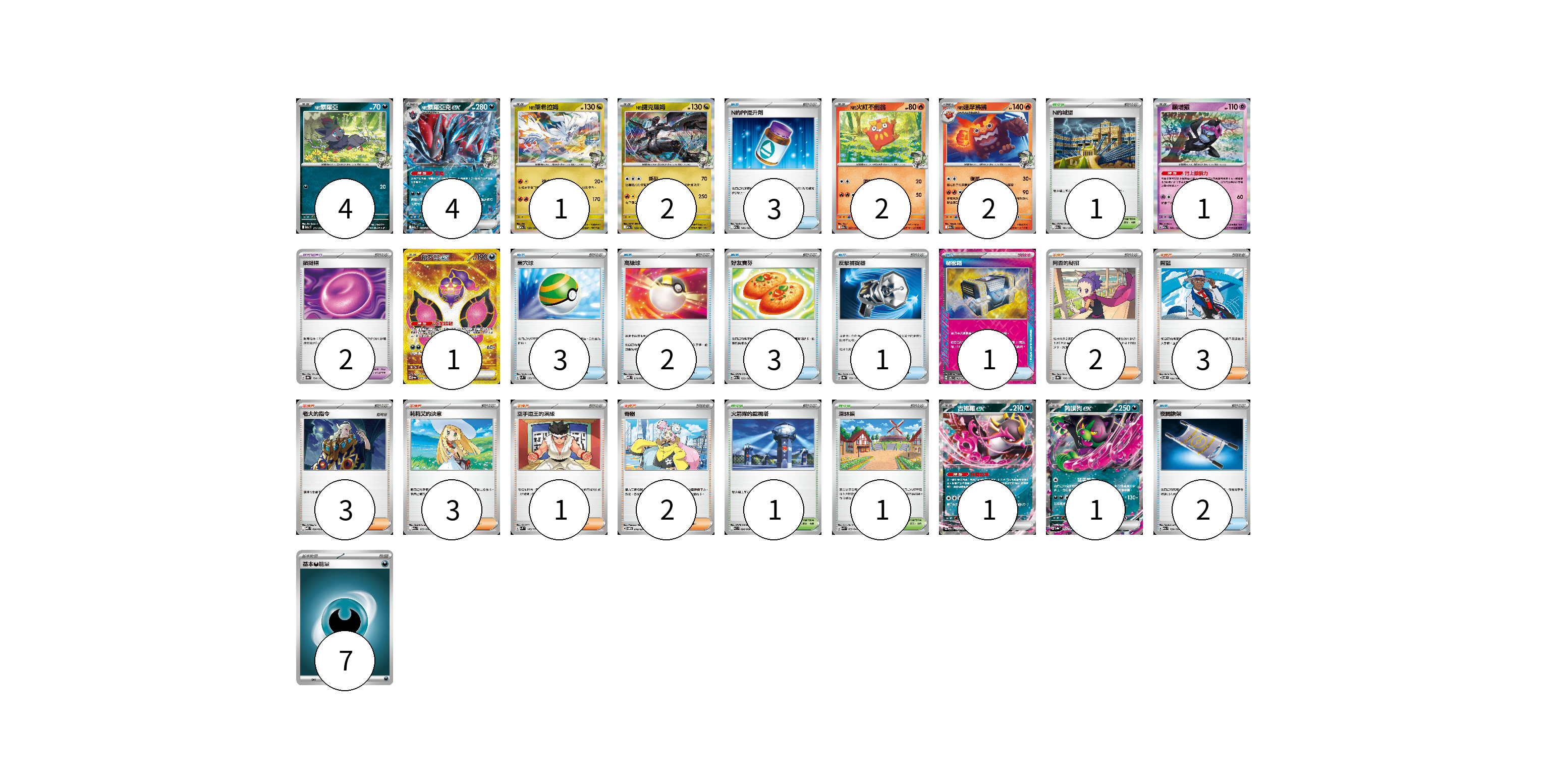 牌組構築方案 以此牌組為基礎新構築牌組 顯示卡面 顯示列表 寶可夢卡(19) 4 4 1 2 2 2 1 1 1 1 寶可夢道具(2) 2 物品卡(15) 3 3 2 3 1 1 2 支援者卡(14) 2 3 3 3 1 2 競技場卡(3) 1 1 1 能量卡(7) 7 寶可夢卡(19) 卡牌名稱 張數 卡牌名稱 張數 N的索羅亞 M2a 111/193 04 N的索羅亞克ex M2a 112/193 04 N的萊希拉姆 M2a 128/193 01 N的捷克羅姆 M2a 129/193 02 N的火紅不倒翁 M2a 027/193 02 N的達摩狒狒 M2a 028/193 02 願增猿 M2a 081/193 01 桃歹郎ex SV6a 092/064 01 吉雉雞ex M2a 114/193 01 夠讚狗ex SV8a 102/187 01 寶可夢道具(2) 卡牌名稱 張數 卡牌名稱 張數 鎖鏈糬 SV8a 154/187 02 物品卡(15) 卡牌名稱 張數 卡牌名稱 張數 N的PP提升劑 M2a 146/193 03 巢穴球 SVM 133/175 03 高級球 MBD 014/022 02 好友寶芬 M2a 153/193 03 反擊捕捉器 SV8a 139/187 01 秘密箱 SV6 092/101 01 夜間擔架 M2a 159/193 02 支援者卡(14) 卡牌名稱 張數 卡牌名稱 張數 阿杏的秘招 SV8a 166/187 02 席藍 SV8 102/106 03 老大的指令 MBD 020/022 03 莉莉艾的決意 M2a 175/193 03 空手道王的演練 SVM 143/175 01 奇樹 SVOM 018/021 02 競技場卡(3) 卡牌名稱 張數 卡牌名稱 張數 N的城堡 M2a 181/193 01 火箭隊的監視塔 SV10 096/098 01 深缽鎮 SVK 039/042 01 能量卡(7) 卡牌名稱 張數 卡牌名稱 張數 基本【惡】能量 SVF DAR 07 以此牌組為基礎新構築牌組 牌組編碼 UHbctz-UzCShj-gJNVcz copy 列印牌組單 牌組編碼已複製 分享至SNS