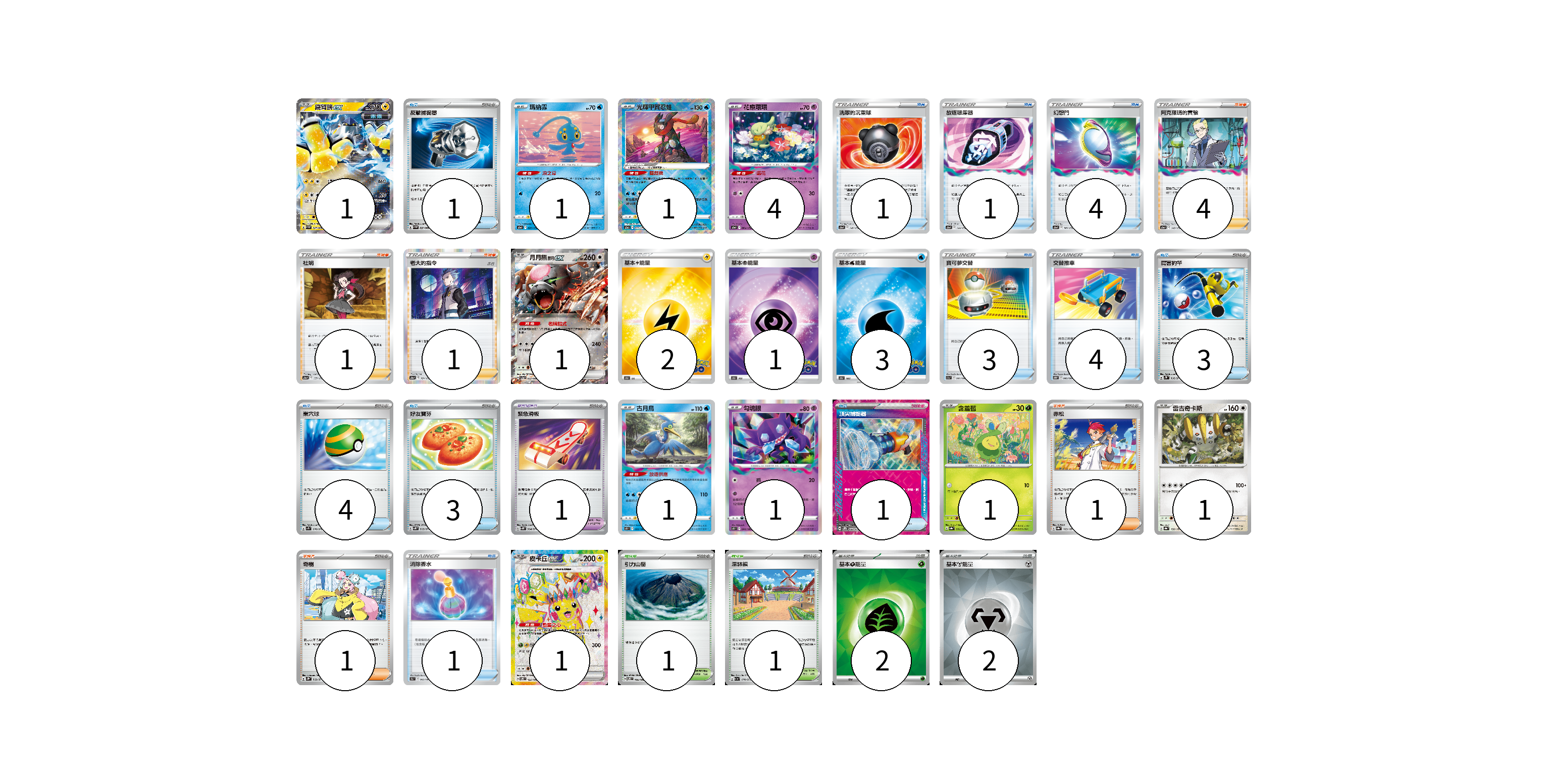 牌組構築方案 以此牌組為基礎新構築牌組 顯示卡面 顯示列表 寶可夢卡(13) 1 1 1 4 1 1 1 1 1 1 寶可夢道具(1) 1 物品卡(26) 1 1 1 4 3 4 3 4 3 1 1 支援者卡(8) 4 1 1 1 1 競技場卡(2) 1 1 能量卡(10) 2 1 3 2 2 寶可夢卡(13) 卡牌名稱 張數 卡牌名稱 張數 鐵臂膀ex SV4M 027/066 01 瑪納霏 S12a 029/172 01 光輝甲賀忍蛙 S12a 033/172 01 花療環環 S12a 064/172 04 月月熊 赫月 ex SV5a 052/066 01 古月鳥 S11 033/100 01 勾魂眼 S11 044/100 01 含羞苞 SV8a 001/187 01 雷吉奇卡斯 SV8a 132/187 01 皮卡丘ex SV8 122/106 01 寶可夢道具(1) 卡牌名稱 張數 卡牌名稱 張數 緊急滑板 SV5K 064/071 01 物品卡(26) 卡牌名稱 張數 卡牌名稱 張數 反擊捕捉器 SV4M 059/066 01 洗翠的沉重球 S12a 140/172 01 放逐吸塵器 S12a 144/172 01 幻想門 S12a 141/172 04 寶可夢交替 S11a 061/068 03 交替推車 S10D 060/067 04 厲害釣竿 SV2P 066/071 03 巢穴球 SV1S 070/078 04 好友寶芬 SV5K 063/071 03 頂尖捕捉器 SV5M 062/071 01 消除香水 S9a 063/067 01 支援者卡(8) 卡牌名稱 張數 卡牌名稱 張數 阿克羅瑪的實驗 S12a 148/172 04 杜娟 S12a 157/172 01 老大的指令(赤日) S12a 161/172 01 赤松 SV8a 163/187 01 奇樹 SV2D 069/071 01 競技場卡(2) 卡牌名稱 張數 卡牌名稱 張數 引力山岳 SV8 106/106 01 深缽鎮 SV1a 070/073 01 能量卡(10) 卡牌名稱 張數 卡牌名稱 張數 基本雷能量 S10b LIG 02 基本超能量 S10b PSY 01 基本水能量 S10b WAT 03 基本【草】能量 SVK GRA 02 基本【鋼】能量 SVK MET 02 以此牌組為基礎新構築牌組 牌組編碼 UHxUxx-UDYbHP-RWebcU copy 列印牌組單 牌組編碼已複製 分享至SNS