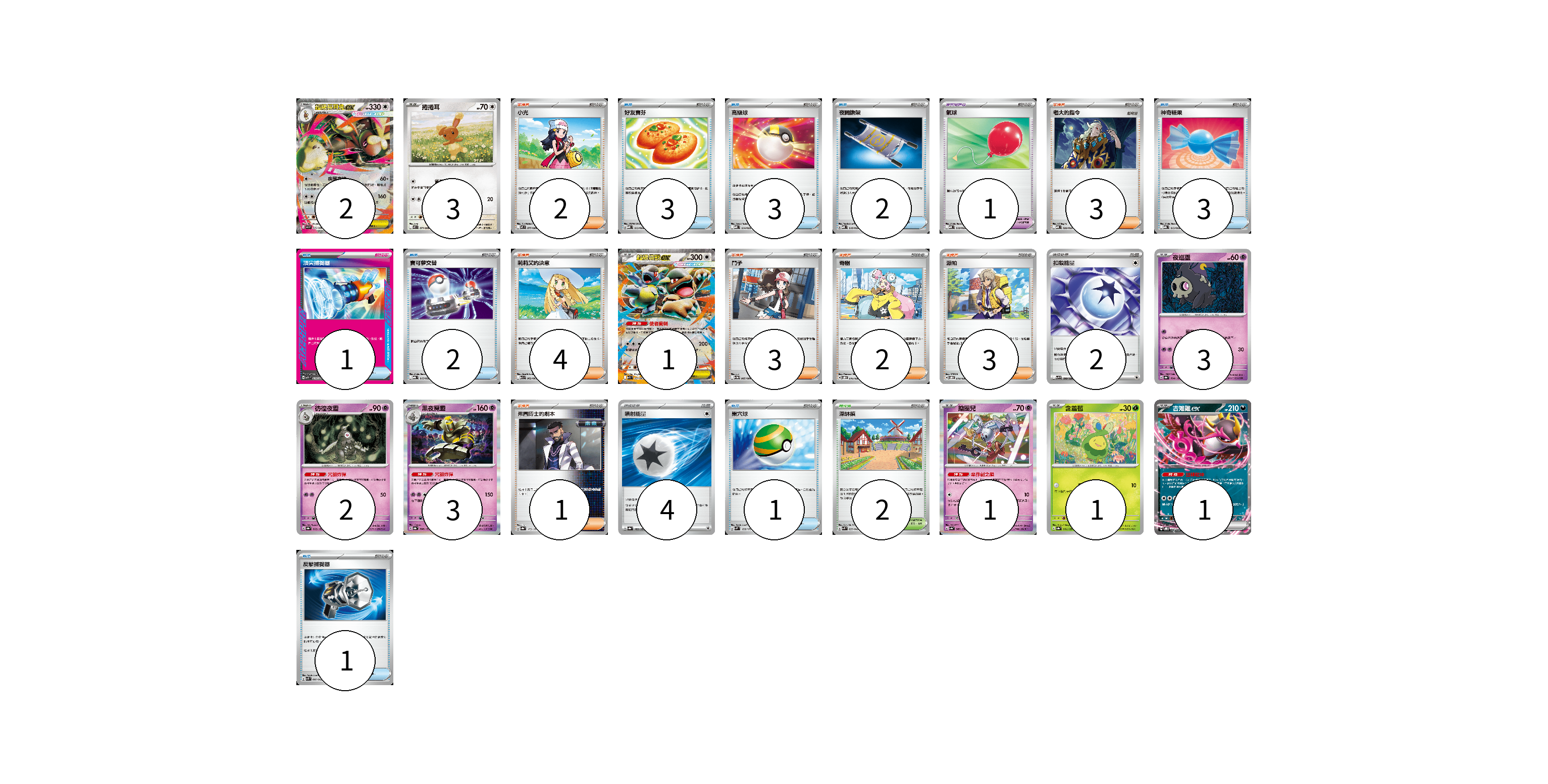牌組構築方案 以此牌組為基礎新構築牌組 顯示卡面 顯示列表 寶可夢卡(17) 2 3 1 3 2 3 1 1 1 物品卡(17) 3 3 2 1 3 1 2 1 1 支援者卡(18) 2 3 4 3 2 3 1 競技場卡(2) 2 能量卡(6) 2 4 寶可夢卡(17) 卡牌名稱 張數 卡牌名稱 張數 超級長耳兔ex M2 072/080 02 捲捲耳 M2 071/080 03 超級袋獸ex M1S 051/063 01 夜巡靈 SV8a 064/187 03 彷徨夜靈 SV8a 065/187 02 黑夜魔靈 SV8a 066/187 03 鑰圈兒 SV4a 087/190 01 含羞苞 SV8a 001/187 01 吉雉雞ex SVOD 004/020 01 物品卡(17) 卡牌名稱 張數 卡牌名稱 張數 好友寶芬 MBD 013/022 03 高級球 MBD 014/022 03 夜間擔架 MBD 016/022 02 氣球 MBD 018/022 01 神奇糖果 MBG 013/022 03 頂尖捕捉器 MBG 014/022 01 寶可夢交替 MBG 015/022 02 巢穴球 SVM 133/175 01 反擊捕捉器 SVK 009/042 01 支援者卡(18) 卡牌名稱 張數 卡牌名稱 張數 小光 M2 077/080 02 老大的指令 MBD 020/022 03 莉莉艾的決意 M1L 062/063 04 鬥子 SV11W 085/086 03 奇樹 SVOD 016/020 02 派帕 SVOD 018/020 03 弗圖博士的劇本 SV8a 175/187 01 競技場卡(2) 卡牌名稱 張數 卡牌名稱 張數 深缽鎮 SVK 039/042 02 能量卡(6) 卡牌名稱 張數 卡牌名稱 張數 扣殺能量 SV9 100/100 02 噴射能量 SV8a 185/187 04 以此牌組為基礎新構築牌組 牌組編碼 UMdXrv-fYSJKP-LeWdIi copy 列印牌組單 牌組編碼已複製 分享至SNS