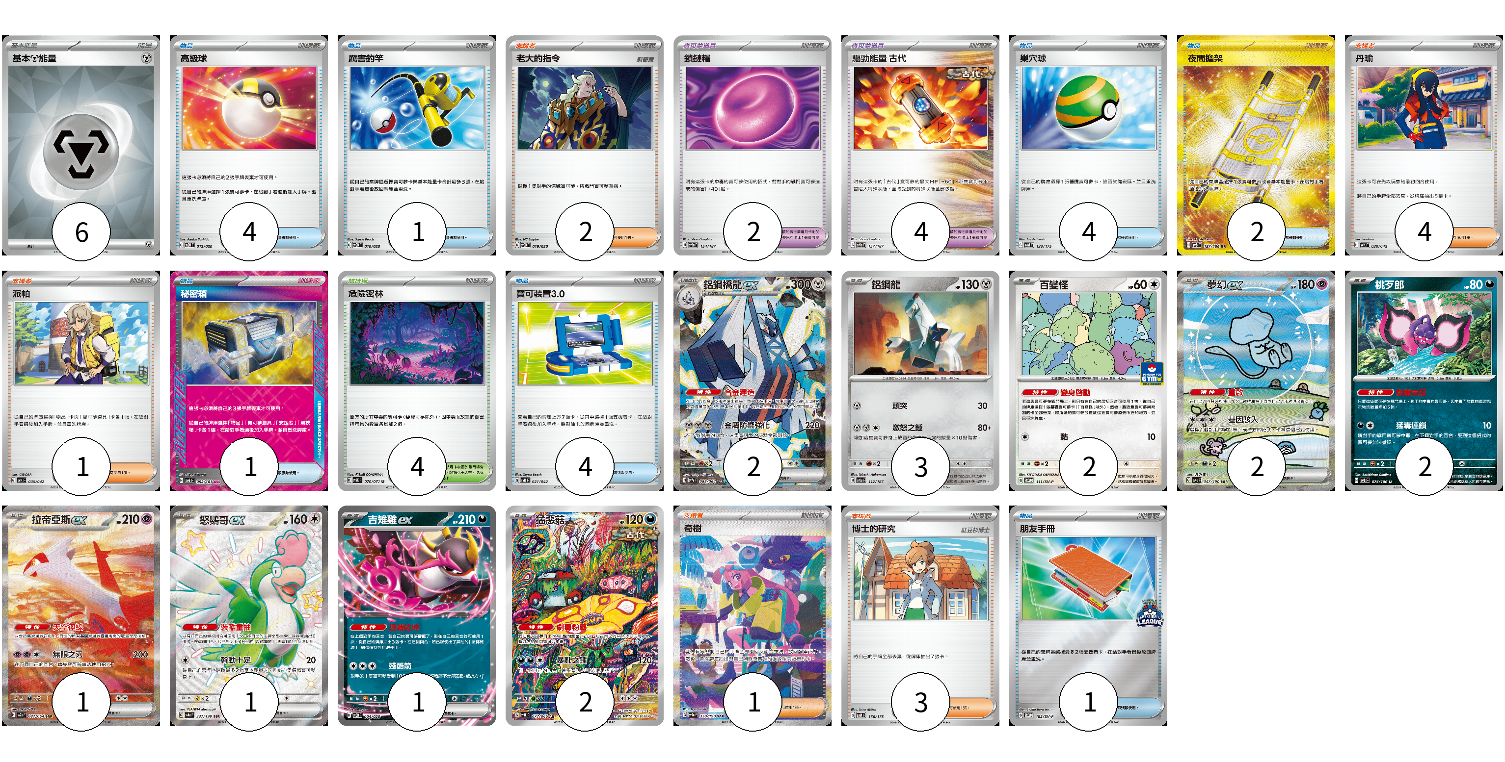 牌組構築方案 以此牌組為基礎新構築牌組 顯示卡面 顯示列表 寶可夢卡(16) 2 3 2 2 2 1 1 1 2 寶可夢道具(6) 2 4 物品卡(17) 4 1 4 2 1 4 1 支援者卡(11) 2 4 1 1 3 競技場卡(4) 4 能量卡(6) 6 寶可夢卡(16) 卡牌名稱 張數 卡牌名稱 張數 鋁鋼橋龍ex SV7a 088/064 02 鋁鋼龍 SV8a 112/187 03 百變怪 SV-P 111/SV-P 02 夢幻ex SV4a 347/190 02 桃歹郎 SV8 075/106 02 拉帝亞斯ex SV7a 087/064 01 怒鸚哥ex SV4a 337/190 01 吉雉雞ex SVOD 004/020 01 猛惡菇 SV4K 077/066 02 寶可夢道具(6) 卡牌名稱 張數 卡牌名稱 張數 鎖鏈糬 SV8a 154/187 02 驅勁能量 古代 SV8a 157/187 04 物品卡(17) 卡牌名稱 張數 卡牌名稱 張數 高級球 SVOD 012/020 04 厲害釣竿 SVOD 010/020 01 巢穴球 SVM 133/175 04 夜間擔架 SV8 137/106 02 秘密箱 SV6 092/101 01 寶可裝置3.0 SVK 021/042 04 朋友手冊 SV-P 182/SV-P 01 支援者卡(11) 卡牌名稱 張數 卡牌名稱 張數 老大的指令 SVOD 019/020 02 丹瑜 SVK 030/042 04 派帕 SVK 035/042 01 奇樹 SV4a 350/190 01 博士的研究 SVM 166/175 03 競技場卡(4) 卡牌名稱 張數 卡牌名稱 張數 危險密林 SV5K 070/071 04 能量卡(6) 卡牌名稱 張數 卡牌名稱 張數 基本【鋼】能量 SVK MET 06 以此牌組為基礎新構築牌組 牌組編碼 URGmVb-zMEQot-DYiaFC copy 列印牌組單 牌組編碼已複製 分享至SNS