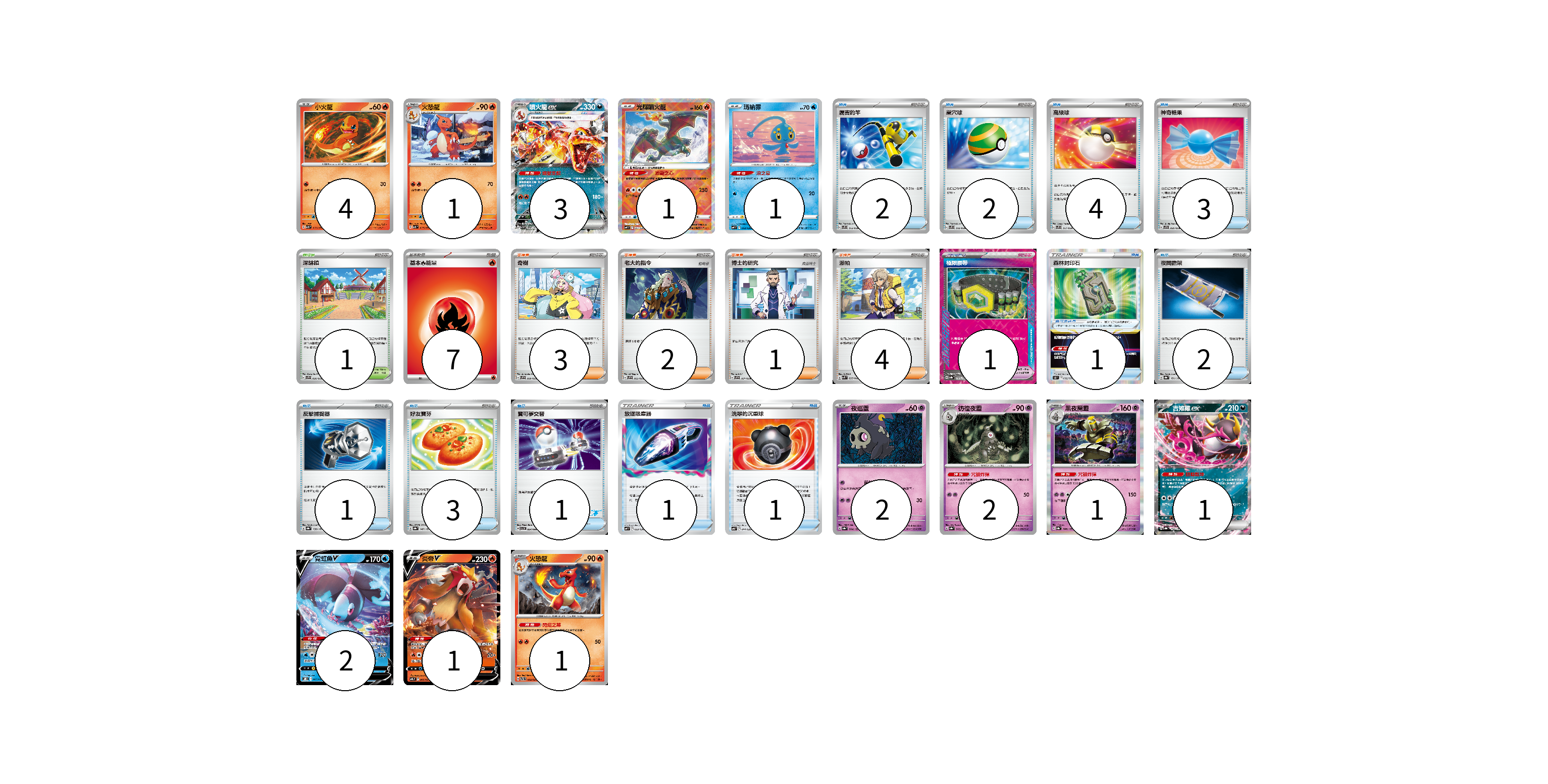 牌組構築方案 以此牌組為基礎新構築牌組 顯示卡面 顯示列表 寶可夢卡(20) 4 1 3 1 1 2 2 1 1 2 1 1 寶可夢道具(2) 1 1 物品卡(20) 2 2 4 3 2 1 3 1 1 1 支援者卡(10) 3 2 1 4 競技場卡(1) 1 能量卡(7) 7 寶可夢卡(20) 卡牌名稱 張數 卡牌名稱 張數 小火龍 SV3 012/108 04 火恐龍 SV3 013/108 01 噴火龍ex SV3 066/108 03 光輝噴火龍 SVF 001/038 01 瑪納霏 SVF 003/038 01 夜巡靈 SV8a 064/187 02 彷徨夜靈 SV8a 065/187 02 黑夜魔靈 SV8a 066/187 01 吉雉雞ex SV8a 104/187 01 霓虹魚V SVHM 001/022 02 炎帝V SVTL 005/021 01 火恐龍 SVTL 002/021 01 寶可夢道具(2) 卡牌名稱 張數 卡牌名稱 張數 極限腰帶 SV8a 159/187 01 森林封印石 S12 092/098 01 物品卡(20) 卡牌名稱 張數 卡牌名稱 張數 厲害釣竿 SVF 013/038 02 巢穴球 SVF 016/038 02 高級球 SVF 017/038 04 神奇糖果 SVF 020/038 03 夜間擔架 SV8a 151/187 02 反擊捕捉器 SV8a 139/187 01 好友寶芬 SV8a 147/187 03 寶可夢交替 SVI 054/066 01 放逐吸塵器 SVF 023/038 01 洗翠的沉重球 SVB 014/028 01 支援者卡(10) 卡牌名稱 張數 卡牌名稱 張數 奇樹 SVF 029/038 03 老大的指令 SVF 032/038 02 博士的研究 SVF 031/038 01 派帕 SVK 035/042 04 競技場卡(1) 卡牌名稱 張數 卡牌名稱 張數 深缽鎮 SVF 036/038 01 能量卡(7) 卡牌名稱 張數 卡牌名稱 張數 基本【火】能量 SVF FIR 07 以此牌組為基礎新構築牌組 牌組編碼 URvKDz-FPWmYw-gcuoZo copy 列印牌組單 牌組編碼已複製 分享至SNS