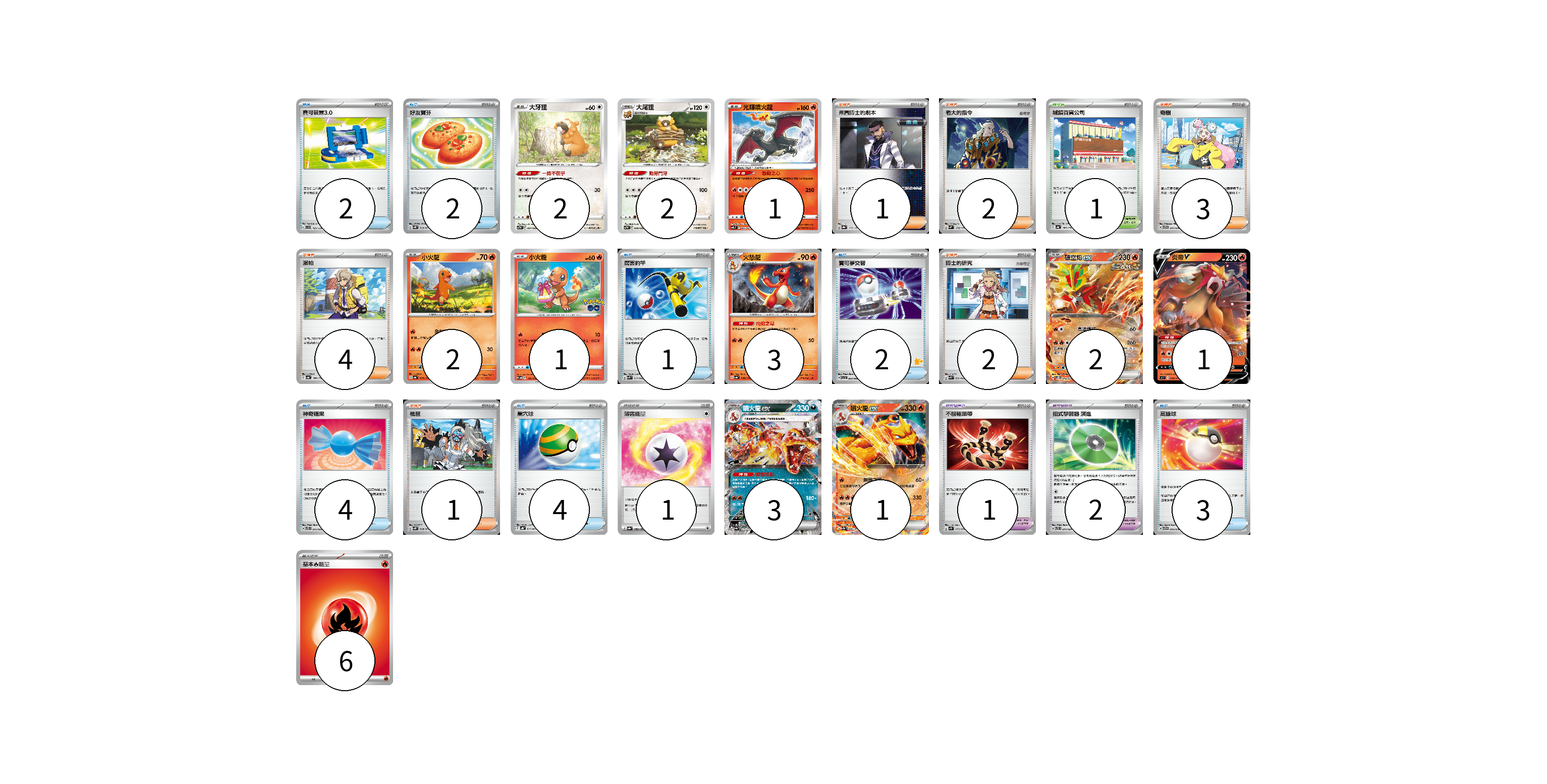 牌組構築方案 以此牌組為基礎新構築牌組 顯示卡面 顯示列表 寶可夢卡(18) 2 2 1 2 1 3 2 1 3 1 寶可夢道具(3) 1 2 物品卡(18) 2 2 1 2 4 4 3 支援者卡(13) 1 2 3 4 2 1 競技場卡(1) 1 能量卡(7) 1 6 寶可夢卡(18) 卡牌名稱 張數 卡牌名稱 張數 大牙狸 SVTM 007/022 02 大尾狸 SVTM 008/022 02 光輝噴火龍 SVTL 003/021 01 小火龍 SV4a 025/190 02 小火龍 S-P 183/S-P 01 火恐龍 SV4a 026/190 03 破空焰ex SV5K 012/071 02 炎帝V SI 056/414 01 噴火龍ex SV4a 115/190 03 噴火龍ex SV2a 006/165 01 寶可夢道具(3) 卡牌名稱 張數 卡牌名稱 張數 不服輸頭帶 SV1S 073/078 01 招式學習器 演進 SVTL 017/021 02 物品卡(18) 卡牌名稱 張數 卡牌名稱 張數 寶可裝置3.0 SVD 121/139 02 好友寶芬 SV5K 063/071 02 厲害釣竿 SVK 011/042 01 寶可夢交替 SVI 054/066 02 神奇糖果 SVTS 015/022 04 巢穴球 SVHK 012/022 04 高級球 SVTG 013/019 03 支援者卡(13) 卡牌名稱 張數 卡牌名稱 張數 弗圖博士的劇本 SV8a 175/187 01 老大的指令 SVM 172/175 02 奇樹 SVTG 017/019 03 派帕 SV4a 180/190 04 博士的研究 SVK 032/042 02 枇琶 SV5K 068/071 01 競技場卡(1) 卡牌名稱 張數 卡牌名稱 張數 城鎮百貨公司 SV4a 183/190 01 能量卡(7) 卡牌名稱 張數 卡牌名稱 張數 薄霧能量 SV8a 186/187 01 基本火能量 sv-p FIR 06 以此牌組為基礎新構築牌組 牌組編碼 UTFHYr-pEVbqS-rBhtBa copy 列印牌組單 牌組編碼已複製 分享至SNS
