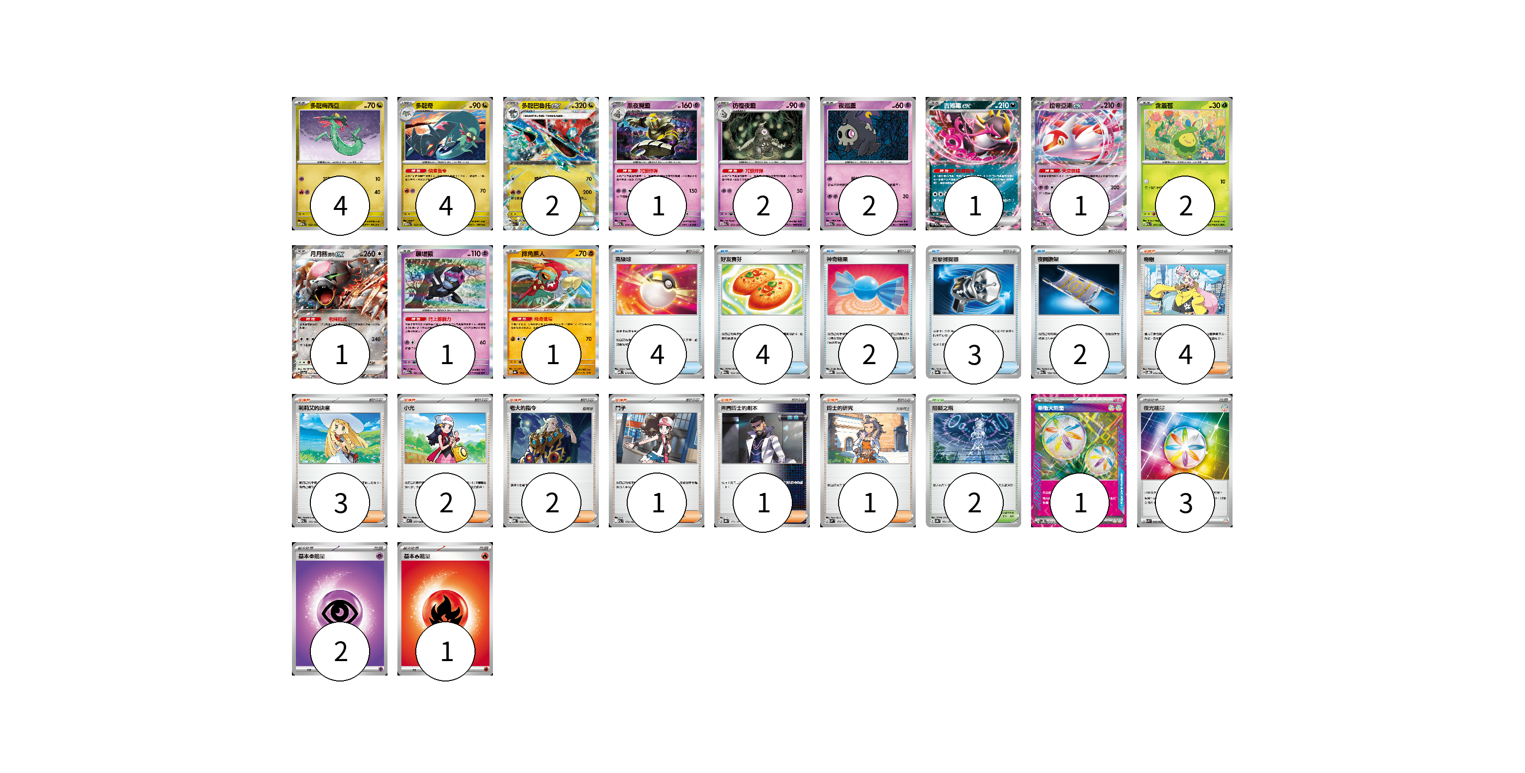 牌組構築方案 以此牌組為基礎新構築牌組 顯示卡面 顯示列表 寶可夢卡(22) 4 4 2 1 2 2 1 1 2 1 1 1 物品卡(15) 4 4 2 3 2 支援者卡(14) 4 3 2 2 1 1 1 競技場卡(2) 2 能量卡(7) 1 3 2 1 寶可夢卡(22) 卡牌名稱 張數 卡牌名稱 張數 多龍梅西亞 M2a 132/193 04 多龍奇 M2a 133/193 04 多龍巴魯托ex M2a 134/193 02 黑夜魔靈 M2a 074/193 01 彷徨夜靈 M2a 073/193 02 夜巡靈 M2a 072/193 02 吉雉雞ex M2a 114/193 01 拉帝亞斯ex M2a 075/193 01 含羞苞 M2a 011/193 02 月月熊 赫月 ex SV5a 052/066 01 願增猿 M2a 081/193 01 摔角鷹人 SV8a 084/187 01 物品卡(15) 卡牌名稱 張數 卡牌名稱 張數 高級球 MBD 014/022 04 好友寶芬 M2a 153/193 04 神奇糖果 MBG 013/022 02 反擊捕捉器 SV8a 139/187 03 夜間擔架 M2a 159/193 02 支援者卡(14) 卡牌名稱 張數 卡牌名稱 張數 奇樹 SVOD 016/020 04 莉莉艾的決意 M2a 175/193 03 小光 M2 077/080 02 老大的指令 MBD 020/022 02 鬥子 M2a 172/193 01 弗圖博士的劇本 SV8a 175/187 01 博士的研究 SVM 170/175 01 競技場卡(2) 卡牌名稱 張數 卡牌名稱 張數 阻礙之塔 SV8a 181/187 02 能量卡(7) 卡牌名稱 張數 卡牌名稱 張數 新衝天能量 SV5K 071/071 01 夜光能量 SVK 042/042 03 基本【超】能量 MBD PSY 02 基本【火】能量 M-P FIR 01 以此牌組為基礎新構築牌組 牌組編碼 UVqMbC-cCRxHM-qGjksh copy 列印牌組單 牌組編碼已複製 分享至SNS
