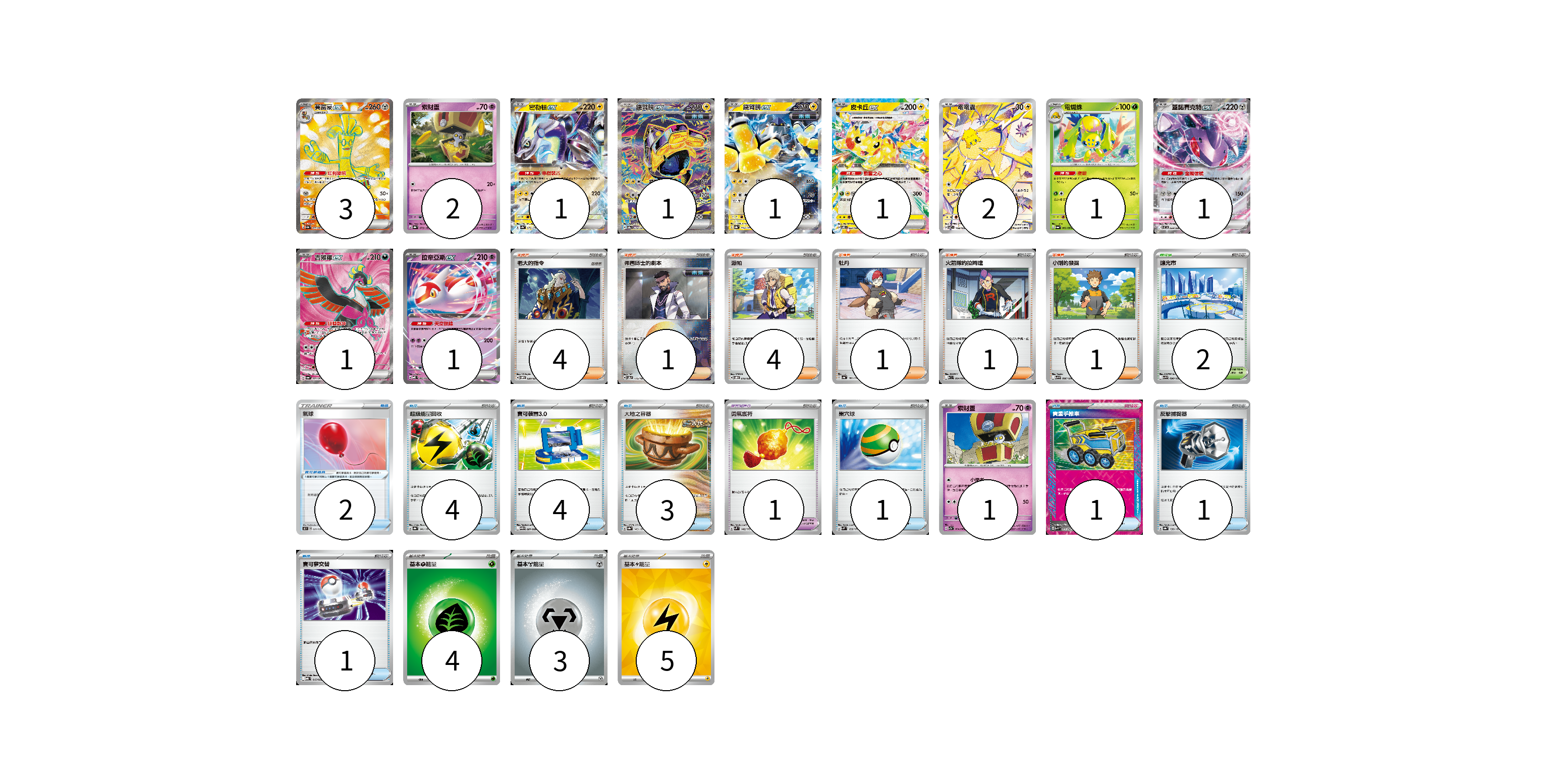 牌組構築方案 以此牌組為基礎新構築牌組 顯示卡面 顯示列表 寶可夢卡(16) 3 2 1 1 1 1 2 1 1 1 1 1 寶可夢道具(3) 2 1 物品卡(15) 4 4 3 1 1 1 1 支援者卡(12) 4 1 4 1 1 1 競技場卡(2) 2 能量卡(12) 4 3 5 寶可夢卡(16) 卡牌名稱 張數 卡牌名稱 張數 賽富豪ex SV3a 079/062 03 索財靈 SV8a 073/187 02 密勒頓ex SV4a 071/190 01 鐵臂膀ex SV8a 210/187 01 鐵臂膀ex SV8a 054/187 01 皮卡丘ex SV8 033/106 01 電電蟲 SV7 108/102 02 電蜘蛛 SV6a 002/064 01 蓋諾賽克特ex SV11B 069/086 01 吉雉雞ex SV6a 081/064 01 拉帝亞斯ex MBD 003/022 01 索財靈 SV7a 024/064 01 寶可夢道具(3) 卡牌名稱 張數 卡牌名稱 張數 氣球 SK 021/030 02 勇氣護符 SVM 142/175 01 物品卡(15) 卡牌名稱 張數 卡牌名稱 張數 超級能量回收 SV8a 141/187 04 寶可裝置3.0 SV11B 081/086 04 大地之容器 SV8a 143/187 03 巢穴球 SVM 133/175 01 貴重手推車 SVK 020/042 01 反擊捕捉器 SV8a 139/187 01 寶可夢交替 MBG 015/022 01 支援者卡(12) 卡牌名稱 張數 卡牌名稱 張數 老大的指令 SVOM 020/021 04 弗圖博士的劇本 SV8a 175/187 01 派帕 SVOD 018/020 04 牡丹 SV4a 182/190 01 火箭隊的拉姆達 SV10 094/098 01 小剛的發掘 SV9 096/100 01 競技場卡(2) 卡牌名稱 張數 卡牌名稱 張數 釀光市 SV9 098/100 02 能量卡(12) 卡牌名稱 張數 卡牌名稱 張數 基本【草】能量 M-P GRA 04 基本【鋼】能量 M-P MET 03 基本【雷】能量 SVQP LIG 05 以此牌組為基礎新構築牌組 牌組編碼 UWnlwd-vVUdEk-tNaMGc copy 列印牌組單 牌組編碼已複製 分享至SNS
