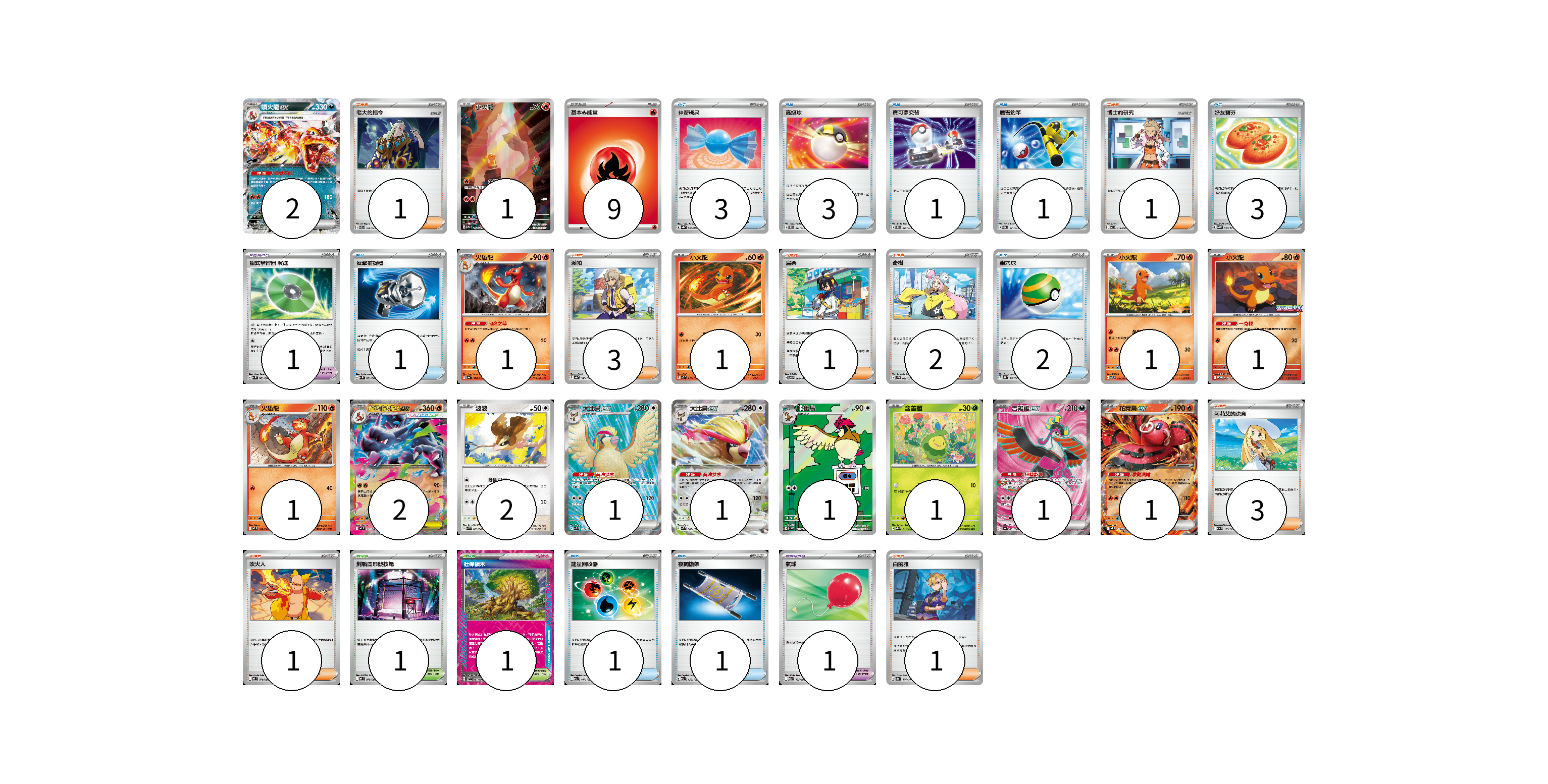 牌組構築方案 以此牌組為基礎新構築牌組 顯示卡面 顯示列表 寶可夢卡(18) 2 1 1 1 1 1 1 2 2 1 1 1 1 1 1 寶可夢道具(2) 1 1 物品卡(16) 3 3 1 1 3 1 2 1 1 支援者卡(13) 1 1 3 1 2 3 1 1 競技場卡(2) 1 1 能量卡(9) 9 寶可夢卡(18) 卡牌名稱 張數 卡牌名稱 張數 噴火龍ex SV3 066/108 02 小火龍 SV2a 168/165 01 火恐龍 SV4a 026/190 01 小火龍 SV3 012/108 01 小火龍 SVTL 001/021 01 小火龍 M-P 020/M-P 01 火恐龍 M2 012/080 01 超級噴火龍Xex M2 013/080 02 波波 SVK 003/042 02 大比鳥ex SV3 128/108 01 大比鳥ex SV3 089/108 01 比比鳥 SV3 119/108 01 含羞苞 M2a 011/193 01 吉雉雞ex SV6a 081/064 01 花舞鳥ex M2 018/080 01 寶可夢道具(2) 卡牌名稱 張數 卡牌名稱 張數 招式學習器 演進 SV4M 063/066 01 氣球 M2a 165/193 01 物品卡(16) 卡牌名稱 張數 卡牌名稱 張數 神奇糖果 SV3a 053/062 03 高級球 SVEL 012/020 03 寶可夢交替 SVEL 015/020 01 厲害釣竿 SVEM 011/020 01 好友寶芬 SV5K 063/071 03 反擊捕捉器 SV4M 059/066 01 巢穴球 SVHK 012/022 02 能量回收器 M2a 147/193 01 夜間擔架 M2a 159/193 01 支援者卡(13) 卡牌名稱 張數 卡牌名稱 張數 老大的指令 SVEL 019/020 01 博士的研究 SVEL 018/020 01 派帕 SV4a 180/190 03 烏栗 SV6 096/101 01 奇樹 SVF 029/038 02 莉莉艾的決意 M2a 175/193 03 吹火人 M2 078/080 01 白蕾雅 SV8a 176/187 01 競技場卡(2) 卡牌名稱 張數 卡牌名稱 張數 對戰圓形競技場 M2 079/080 01 壯偉碩木 SV7 101/102 01 能量卡(9) 卡牌名稱 張數 卡牌名稱 張數 基本【火】能量 SVEL FIR 09 以此牌組為基礎新構築牌組 牌組編碼 UXEDUE-HghyQB-yUAATj copy 列印牌組單 牌組編碼已複製 分享至SNS