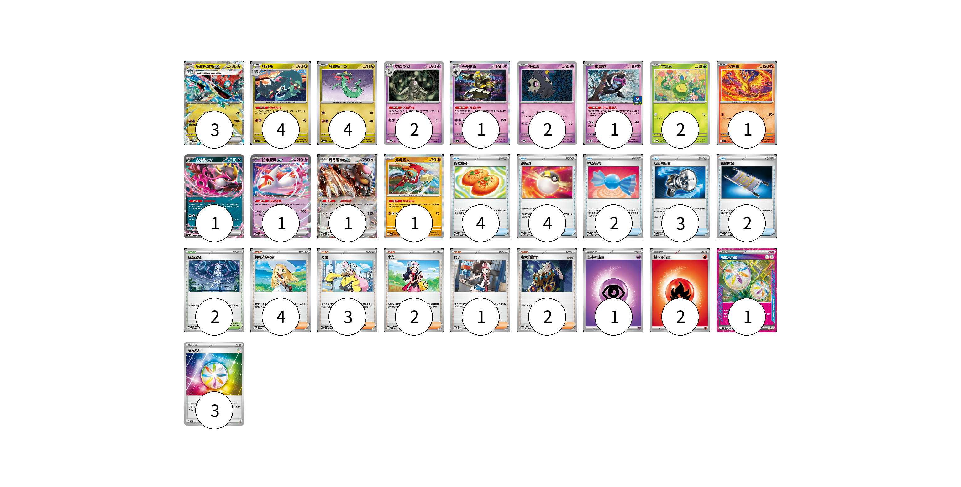 牌組構築方案 以此牌組為基礎新構築牌組 顯示卡面 顯示列表 寶可夢卡(24) 3 4 4 2 1 2 1 2 1 1 1 1 1 物品卡(15) 4 4 2 3 2 支援者卡(12) 4 3 2 1 2 競技場卡(2) 2 能量卡(7) 1 2 1 3 寶可夢卡(24) 卡牌名稱 張數 卡牌名稱 張數 多龍巴魯托ex SV6 081/101 03 多龍奇 SV6 080/101 04 多龍梅西亞 SV6 079/101 04 彷徨夜靈 SV6a 019/064 02 黑夜魔靈 SV6a 020/064 01 夜巡靈 SV8a 064/187 02 願增猿 M-P 014/M-P 01 含羞苞 SV8a 001/187 02 火焰鳥 M2 014/080 01 吉雉雞ex SVOD 004/020 01 拉帝亞斯ex MBD 003/022 01 月月熊 赫月ex SV8a 134/187 01 摔角鷹人 SV8a 084/187 01 物品卡(15) 卡牌名稱 張數 卡牌名稱 張數 好友寶芬 MBD 013/022 04 高級球 MBD 014/022 04 神奇糖果 MBG 013/022 02 反擊捕捉器 SV8a 139/187 03 夜間擔架 MBD 016/022 02 支援者卡(12) 卡牌名稱 張數 卡牌名稱 張數 莉莉艾的決意 M1L 062/063 04 奇樹 SVOD 016/020 03 小光 M2 077/080 02 鬥子 SV11W 085/086 01 老大的指令 MBD 020/022 02 競技場卡(2) 卡牌名稱 張數 卡牌名稱 張數 阻礙之塔 SV6 100/101 02 能量卡(7) 卡牌名稱 張數 卡牌名稱 張數 基本【超】能量 MBD PSY 01 基本【火】能量 M-P FIR 02 新衝天能量 SV5K 071/071 01 夜光能量 SV4a 190/190 03 以此牌組為基礎新構築牌組 牌組編碼 UddjUp-CsvRfQ-PRfGiC copy 列印牌組單 牌組編碼已複製 分享至SNS