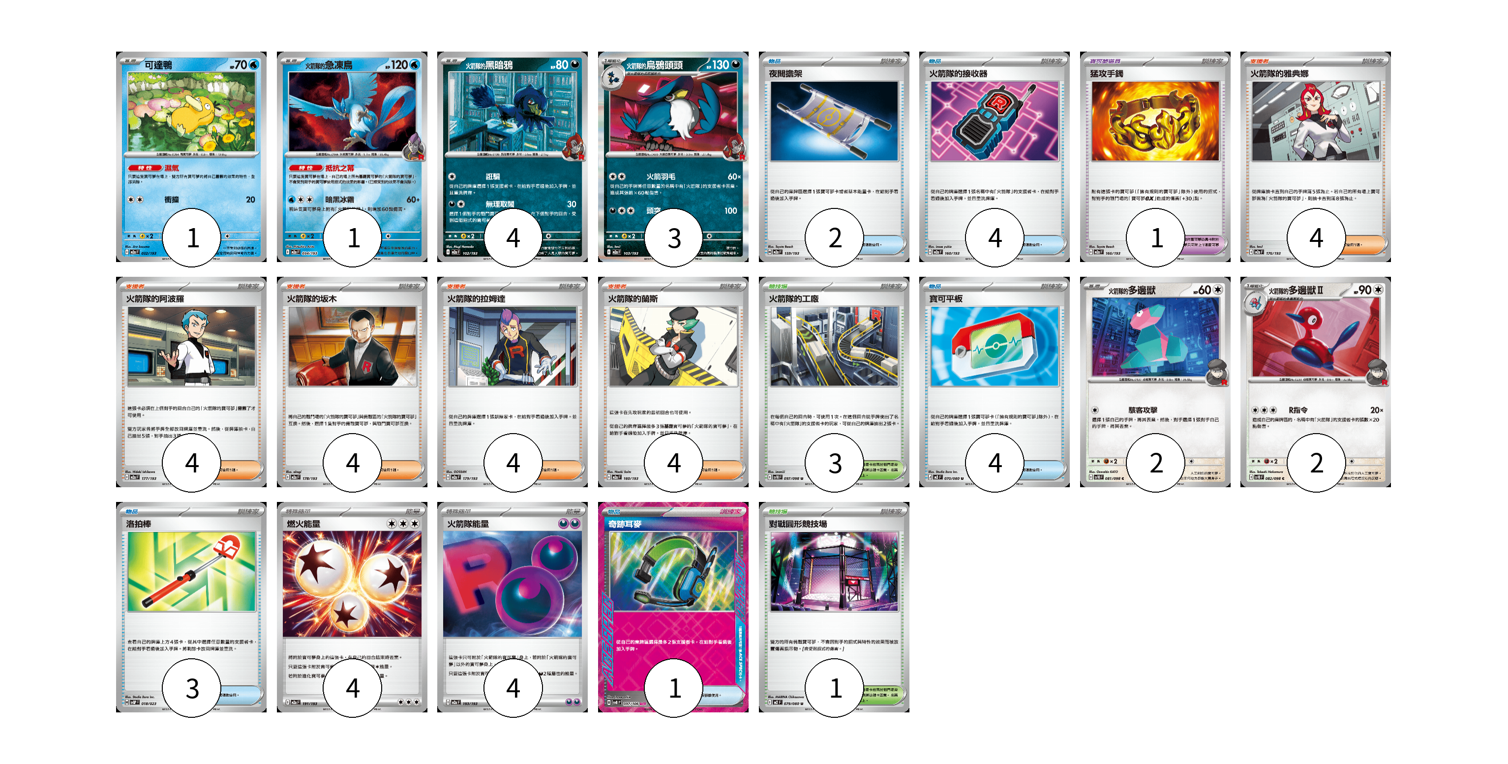 牌組構築方案 以此牌組為基礎新構築牌組 顯示卡面 顯示列表 寶可夢卡(13) 1 1 4 3 2 2 寶可夢道具(1) 1 物品卡(14) 2 4 4 3 1 支援者卡(20) 4 4 4 4 4 競技場卡(4) 3 1 能量卡(8) 4 4 寶可夢卡(13) 卡牌名稱 張數 卡牌名稱 張數 可達鴨 M2a 032/193 01 <火箭隊的>急凍鳥 M2a 034/193 01 <火箭隊的>黑暗鴉 M2a 102/193 04 火箭隊的烏鴉頭頭 M2a 103/193 03 <火箭隊的>多邊獸 SV10 081/098 02 <火箭隊的>多邊獸Ⅱ SV10 082/098 02 寶可夢道具(1) 卡牌名稱 張數 卡牌名稱 張數 猛攻手鐲 M2a 166/193 01 物品卡(14) 卡牌名稱 張數 卡牌名稱 張數 夜間擔架 M2a 159/193 02 火箭隊的接收器 M2a 160/193 04 寶可平板 M3 070/080 04 洛拍棒 SVQP 018/023 03 奇跡耳麥 SV8 097/106 01 支援者卡(20) 卡牌名稱 張數 卡牌名稱 張數 火箭隊的雅典娜 M2a 176/193 04 火箭隊的阿波羅 M2a 177/193 04 火箭隊的坂木 M2a 178/193 04 火箭隊的拉姆達 M2a 179/193 04 火箭隊的蘭斯 M2a 180/193 04 競技場卡(4) 卡牌名稱 張數 卡牌名稱 張數 火箭隊的工廠 SV10 097/098 03 對戰圓形競技場 M2 079/080 01 能量卡(8) 卡牌名稱 張數 卡牌名稱 張數 燃火能量 M2a 191/193 04 火箭隊能量 M2a 193/193 04 以此牌組為基礎新構築牌組 牌組編碼 UeKqii-JkSGON-kKaSwQ copy 列印牌組單 牌組編碼已複製 分享至SNS