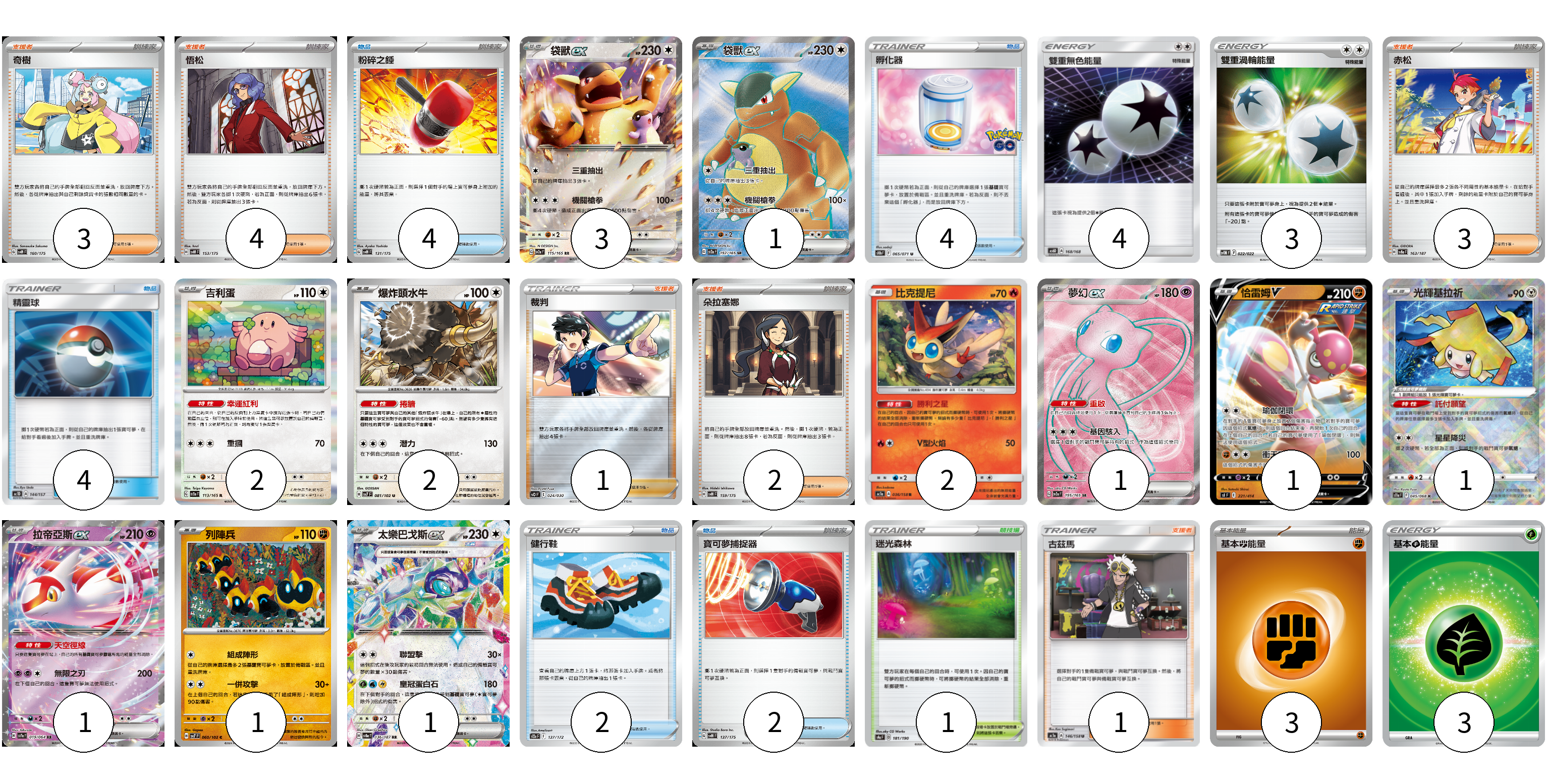 牌組構築方案 以此牌組為基礎新構築牌組 顯示卡面 顯示列表 寶可夢卡(16) 3 1 2 2 2 1 1 1 1 1 1 物品卡(16) 4 4 4 2 2 支援者卡(14) 3 4 3 1 2 1 競技場卡(1) 1 能量卡(13) 4 3 3 3 寶可夢卡(16) 卡牌名稱 張數 卡牌名稱 張數 袋獸ex SV2a 115/165 03 袋獸ex SV2a 192/165 01 吉利蛋 SV2a 113/165 02 爆炸頭水牛 SV7 081/102 02 比克提尼 AC1a 036/158 02 夢幻ex SV2a 195/165 01 恰雷姆V SI 221/414 01 光輝基拉祈 S11a 045/068 01 拉帝亞斯ex SV7a 019/064 01 列陣兵 SV7 060/102 01 太樂巴戈斯ex SV8a 136/187 01 物品卡(16) 卡牌名稱 張數 卡牌名稱 張數 粉碎之錘 SVM 131/175 04 孵化器 S10b 065/071 04 精靈球 AC1D 144/157 04 健行鞋 S12a 137/172 02 寶可夢捕捉器 SVM 137/175 02 支援者卡(14) 卡牌名稱 張數 卡牌名稱 張數 奇樹 SVM 160/175 03 悟松 SVM 153/175 04 赤松 SV8a 163/187 03 裁判 SO 024/030 01 朵拉塞娜 SVM 159/175 02 古茲馬 AC1a 146/158 01 競技場卡(1) 卡牌名稱 張數 卡牌名稱 張數 迷光森林 S4a 181/190 01 能量卡(13) 卡牌名稱 張數 卡牌名稱 張數 雙重無色能量 AS6D 168/168 04 雙重渦輪能量 SVTM 022/022 03 基本【鬥】能量 SVTG FIG 03 基本【草】能量 SI GRA 03 以此牌組為基礎新構築牌組 牌組編碼 UgYZmc-lZykOX-cmHRzu copy 列印牌組單 牌組編碼已複製 分享至SNS
