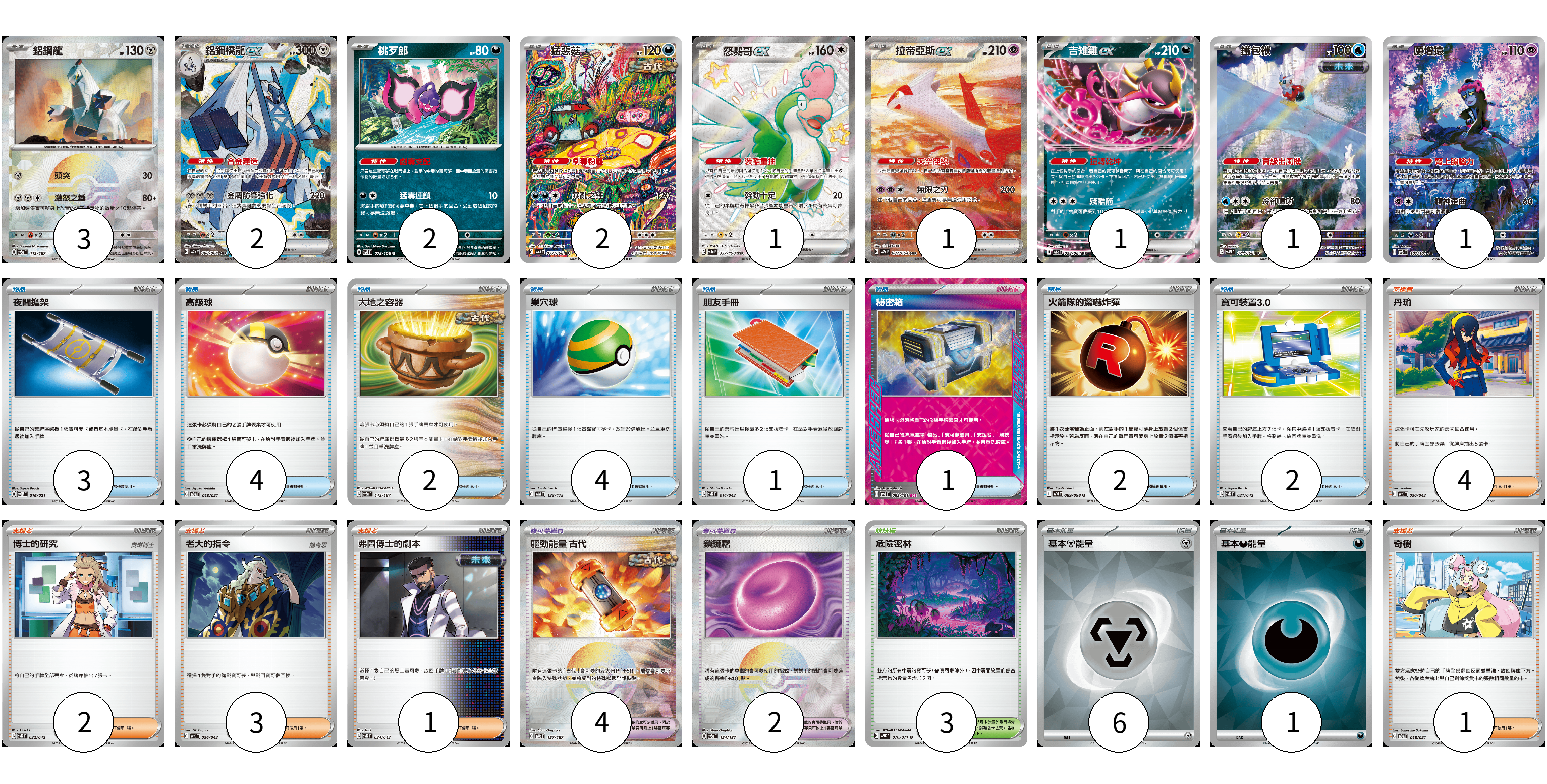 牌組構築方案 以此牌組為基礎新構築牌組 顯示卡面 顯示列表 寶可夢卡(14) 3 2 2 2 1 1 1 1 1 寶可夢道具(6) 4 2 物品卡(19) 3 4 2 4 1 1 2 2 支援者卡(11) 4 2 3 1 1 競技場卡(3) 3 能量卡(7) 6 1 寶可夢卡(14) 卡牌名稱 張數 卡牌名稱 張數 鋁鋼龍 SV8a 112/187 03 鋁鋼橋龍ex SV7a 088/064 02 桃歹郎 SV8 075/106 02 猛惡菇 SV4K 077/066 02 怒鸚哥ex SV4a 337/190 01 拉帝亞斯ex SV7a 087/064 01 吉雉雞ex SV6a 038/064 01 鐵包袱 SV4M 071/066 01 願增猿 SV6 107/101 01 寶可夢道具(6) 卡牌名稱 張數 卡牌名稱 張數 驅勁能量 古代 SV8a 157/187 04 鎖鏈糬 SV8a 154/187 02 物品卡(19) 卡牌名稱 張數 卡牌名稱 張數 夜間擔架 SVOM 016/021 03 高級球 SVOM 013/021 04 大地之容器 SV8a 143/187 02 巢穴球 SVM 133/175 04 朋友手冊 SVK 014/042 01 秘密箱 SV6 092/101 01 火箭隊的驚嚇炸彈 SV10 089/098 02 寶可裝置3.0 SVK 021/042 02 支援者卡(11) 卡牌名稱 張數 卡牌名稱 張數 丹瑜 SVK 030/042 04 博士的研究 SVK 032/042 02 老大的指令 SVK 036/042 03 弗圖博士的劇本 SVK 034/042 01 奇樹 SVOM 018/021 01 競技場卡(3) 卡牌名稱 張數 卡牌名稱 張數 危險密林 SV5K 070/071 03 能量卡(7) 卡牌名稱 張數 卡牌名稱 張數 基本【鋼】能量 SVOD MET 06 基本【惡】能量 SVOM DAR 01 以此牌組為基礎新構築牌組 牌組編碼 UgixvG-emqUdn-JLhfcC copy 列印牌組單 牌組編碼已複製 分享至SNS