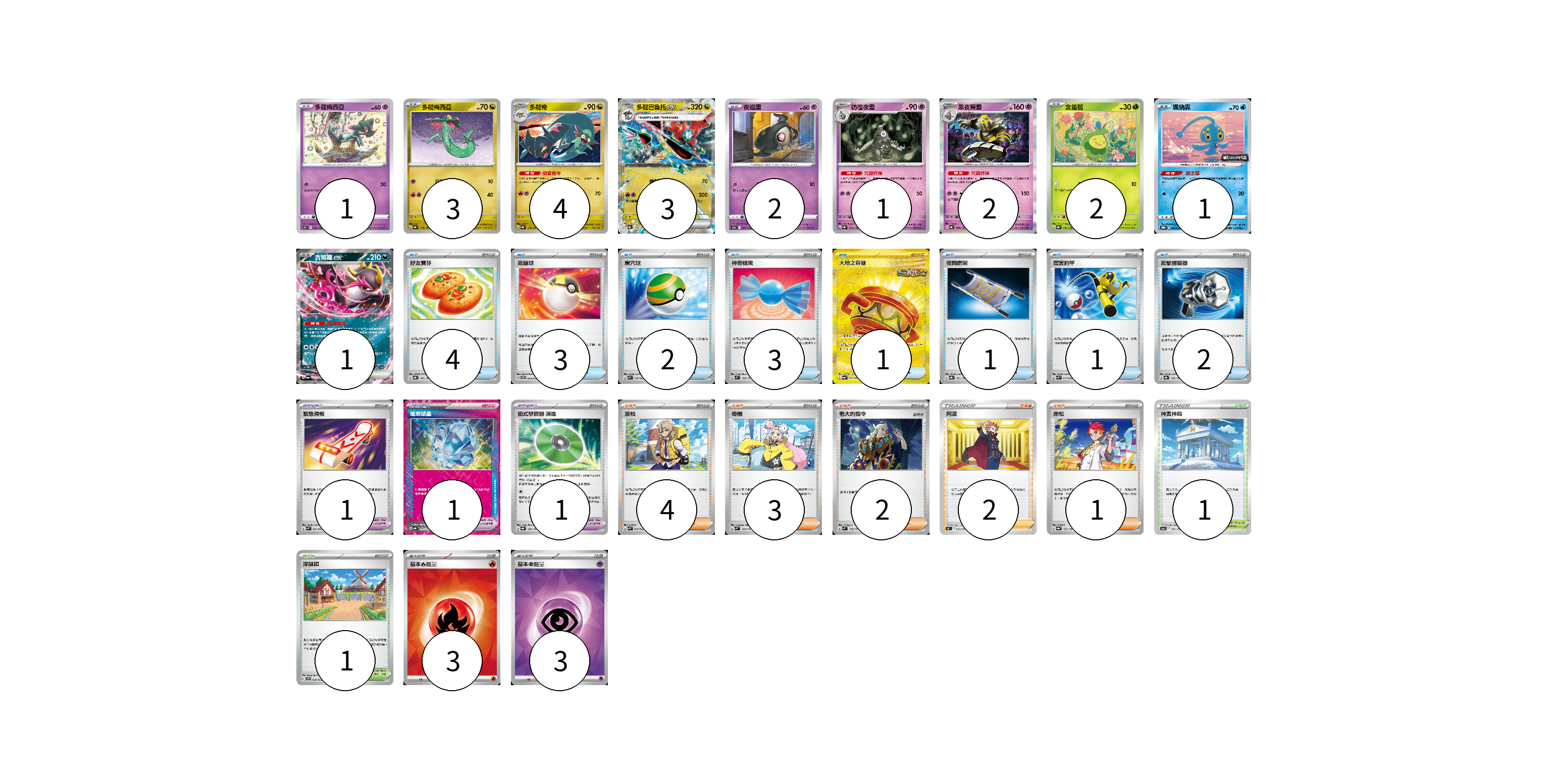 牌組構築方案 以此牌組為基礎新構築牌組 顯示卡面 顯示列表 寶可夢卡(20) 1 3 4 3 2 1 2 2 1 1 寶可夢道具(3) 1 1 1 物品卡(17) 4 3 2 3 1 1 1 2 支援者卡(12) 4 3 2 2 1 競技場卡(2) 1 1 能量卡(6) 3 3 寶可夢卡(20) 卡牌名稱 張數 卡牌名稱 張數 多龍梅西亞 S11 052/100 01 多龍梅西亞 SV8a 118/187 03 多龍奇 SV8a 119/187 04 多龍巴魯托ex SV8a 120/187 03 夜巡靈 S12a 057/172 02 彷徨夜靈 SV8a 065/187 01 黑夜魔靈 SV8a 066/187 02 含羞苞 SV8a 001/187 02 瑪納霏 SV-P 135/SV-P 01 吉雉雞ex SV6a 038/064 01 寶可夢道具(3) 卡牌名稱 張數 卡牌名稱 張數 緊急滑板 SVK 023/042 01 璀璨結晶 SV8a 152/187 01 招式學習器 演進 SV8a 160/187 01 物品卡(17) 卡牌名稱 張數 卡牌名稱 張數 好友寶芬 SV8a 147/187 04 高級球 SVTG 013/019 03 巢穴球 SVK 016/042 02 神奇糖果 SVM 135/175 03 大地之容器 SV6a 093/064 01 夜間擔架 SV8a 151/187 01 厲害釣竿 SVK 011/042 01 反擊捕捉器 SV8a 139/187 02 支援者卡(12) 卡牌名稱 張數 卡牌名稱 張數 派帕 SVK 035/042 04 奇樹 SVM 160/175 03 老大的指令 SVM 172/175 02 阿渡 S12 096/098 02 赤松 SV8a 163/187 01 競技場卡(2) 卡牌名稱 張數 卡牌名稱 張數 神奧神殿 S12a 169/172 01 深缽鎮 SVF 036/038 01 能量卡(6) 卡牌名稱 張數 卡牌名稱 張數 基本【火】能量 SVK FIR 03 基本【超】能量 SVK PSY 03 以此牌組為基礎新構築牌組 牌組編碼 Uigttx-doMBYX-YOBAOX copy 列印牌組單 牌組編碼已複製 分享至SNS