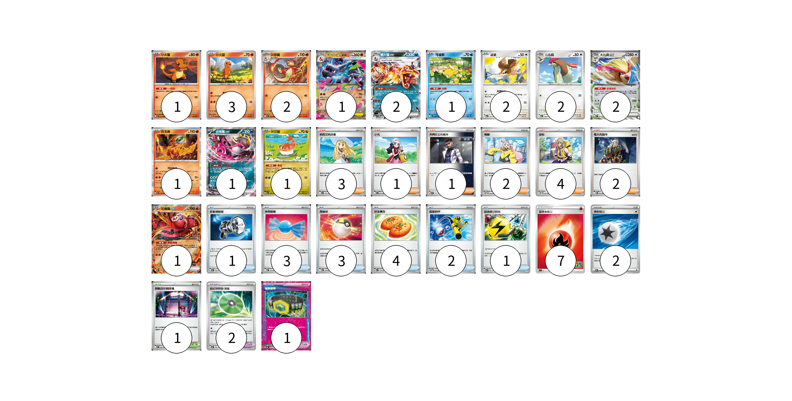 牌組構築方案 以此牌組為基礎新構築牌組 顯示卡面 顯示列表 寶可夢卡(20) 1 3 2 1 2 1 2 2 2 1 1 1 1 寶可夢道具(3) 2 1 物品卡(14) 1 3 3 4 2 1 支援者卡(13) 3 1 1 2 4 2 競技場卡(1) 1 能量卡(9) 7 2 寶可夢卡(20) 卡牌名稱 張數 卡牌名稱 張數 小火龍 M2 011/080 01 小火龍 SVTL 001/021 03 火恐龍 M2 012/080 02 超級噴火龍Xex M2 013/080 01 噴火龍ex SV3 066/108 02 可達鴨 M2a 032/193 01 波波 SV4a 137/190 02 比比鳥 SV4a 138/190 02 大比鳥ex SVK 005/042 02 古玉魚 SV8a 025/187 01 吉雉雞ex M2a 114/193 01 米立龍 M2a 135/193 01 花舞鳥ex M2 018/080 01 寶可夢道具(3) 卡牌名稱 張數 卡牌名稱 張數 招式學習器 演進 SV8a 160/187 02 極限腰帶 SV8a 159/187 01 物品卡(14) 卡牌名稱 張數 卡牌名稱 張數 反擊捕捉器 SV8a 139/187 01 神奇糖果 MBG 013/022 03 高級球 MBD 014/022 03 好友寶芬 M2a 153/193 04 厲害釣竿 SVOD 010/020 02 超級能量回收 SV8a 141/187 01 支援者卡(13) 卡牌名稱 張數 卡牌名稱 張數 莉莉艾的決意 M2a 175/193 03 小光 M2 077/080 01 弗圖博士的劇本 SV8a 175/187 01 奇樹 SVOM 018/021 02 派帕 SVOD 018/020 04 老大的指令 MBD 020/022 02 競技場卡(1) 卡牌名稱 張數 卡牌名稱 張數 對戰圓形競技場 M2 079/080 01 能量卡(9) 卡牌名稱 張數 卡牌名稱 張數 基本火能量 S8a FIR 07 噴射能量 SV8a 185/187 02 以此牌組為基礎新構築牌組 牌組編碼 UjGiNH-gDgzjN-KrPDoO copy 列印牌組單 牌組編碼已複製 分享至SNS