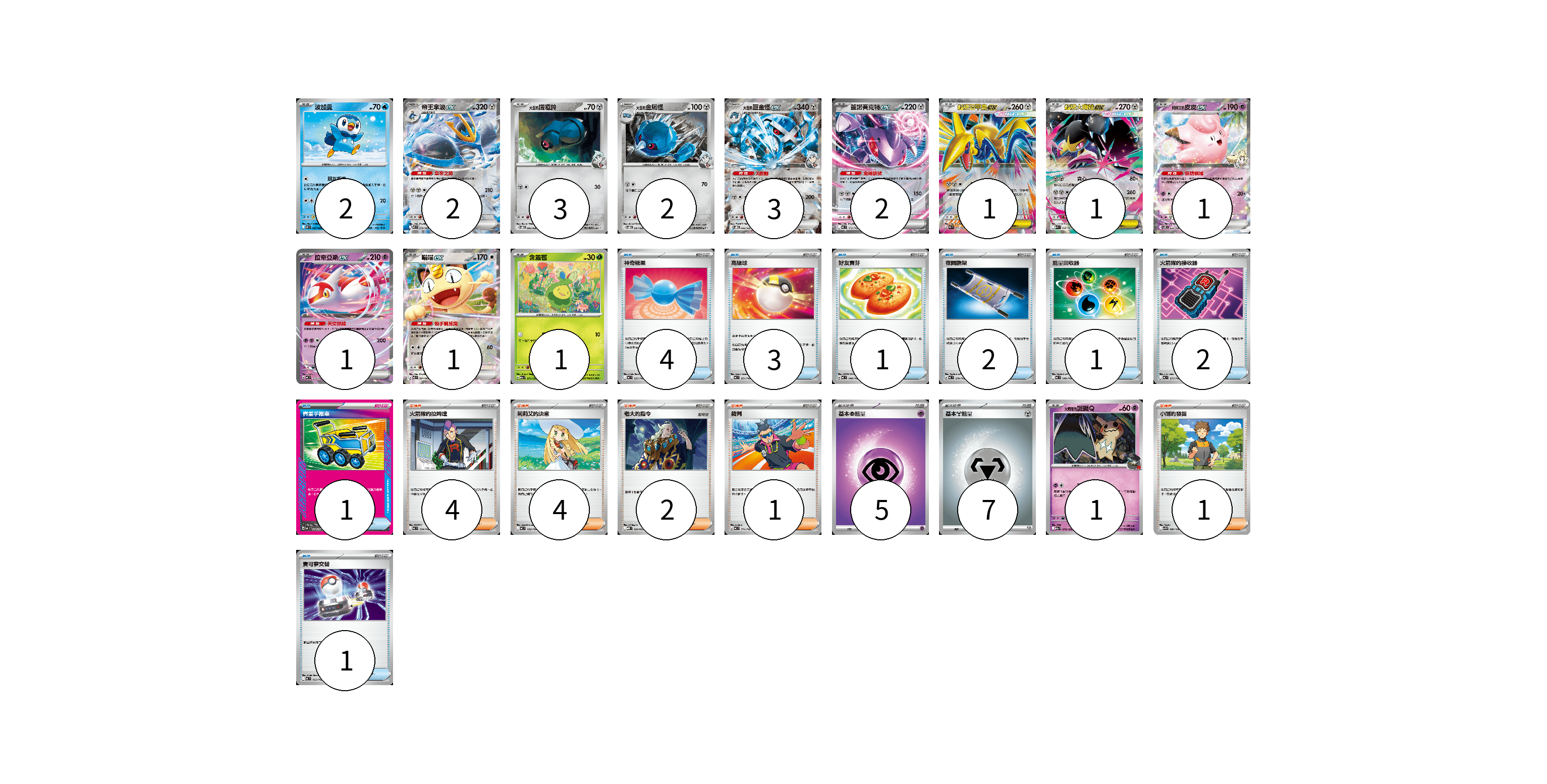 牌組構築方案 以此牌組為基礎新構築牌組 顯示卡面 顯示列表 寶可夢卡(21) 2 2 3 2 3 2 1 1 1 1 1 1 1 物品卡(15) 4 3 1 2 1 2 1 1 支援者卡(12) 4 4 2 1 1 能量卡(12) 5 7 寶可夢卡(21) 卡牌名稱 張數 卡牌名稱 張數 波加曼 M2 027/080 02 帝王拿波ex M2 058/080 02 <大吾的>鐵啞鈴 SVOD 006/020 03 <大吾的>金屬怪 SVOD 007/020 02 <大吾的>巨金怪ex SVOD 008/020 03 蓋諾賽克特ex MC 512/742 02 超級盔甲鳥ex M3 054/080 01 超級大嘴娃ex M1L 046/063 01 莉莉艾的皮皮ex SV9 033/100 01 拉帝亞斯ex MC 312/742 01 喵喵ex M3 061/080 01 含羞苞 M2a 011/193 01 <火箭隊的>謎擬Q M2a 079/193 01 物品卡(15) 卡牌名稱 張數 卡牌名稱 張數 神奇糖果 MC 655/742 04 高級球 MC 651/742 03 好友寶芬 MC 648/742 01 夜間擔架 MC 670/742 02 能量回收器 MC 640/742 01 火箭隊的接收器 MC 675/742 02 貴重手推車 MC 658/742 01 寶可夢交替 MC 663/742 01 支援者卡(12) 卡牌名稱 張數 卡牌名稱 張數 火箭隊的拉姆達 MC 734/742 04 莉莉艾的決意 MC 729/742 04 老大的指令 MBD 020/022 02 裁判 MC 711/742 01 小剛的發掘 SV9 096/100 01 能量卡(12) 卡牌名稱 張數 卡牌名稱 張數 基本【超】能量 MC PSY 05 基本【鋼】能量 MC MET 07 以此牌組為基礎新構築牌組 牌組編碼 UsnHmT-LsJOkx-bktsFC copy 列印牌組單 牌組編碼已複製 分享至SNS