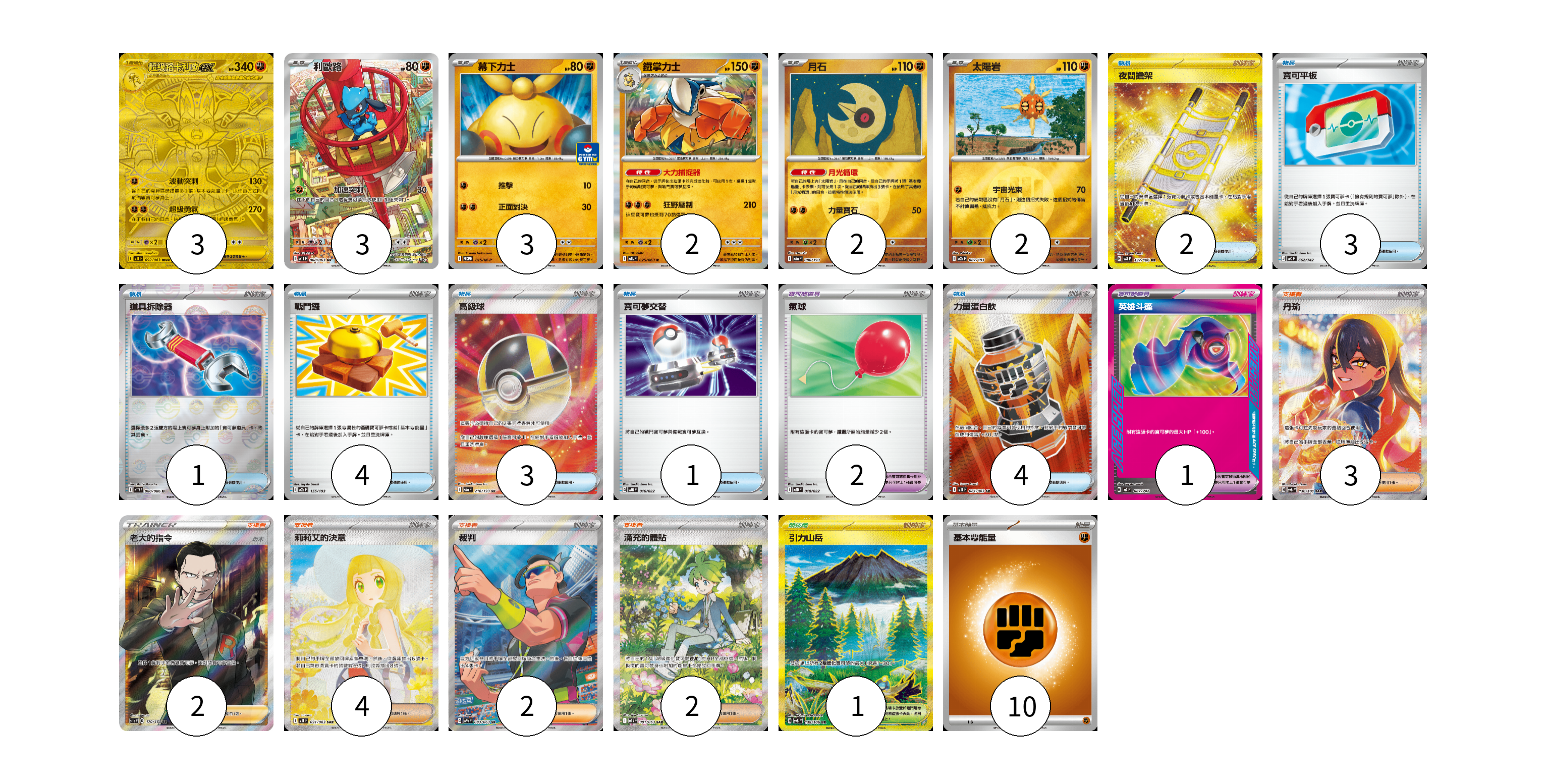 牌組構築方案 以此牌組為基礎新構築牌組 顯示卡面 顯示列表 寶可夢卡(15) 3 3 3 2 2 2 寶可夢道具(1) 1 物品卡(20) 2 3 1 4 3 1 2 4 支援者卡(13) 3 2 4 2 2 競技場卡(1) 1 能量卡(10) 10 寶可夢卡(15) 卡牌名稱 張數 卡牌名稱 張數 超級路卡利歐ex M1L 092/063 03 利歐路 M1L 068/063 03 幕下力士 M-P 015/M-P 03 鐵掌力士 M1L 025/063 02 月石 M2a 086/193 02 太陽岩 M2a 087/193 02 寶可夢道具(1) 卡牌名稱 張數 卡牌名稱 張數 英雄斗篷 MC 687/742 01 物品卡(20) 卡牌名稱 張數 卡牌名稱 張數 夜間擔架 SV8 137/106 02 寶可平板 MC 662/742 03 道具拆除器 SV11W 080/086 01 戰鬥鑼 M2a 155/193 04 高級球 M2a 216/193 03 寶可夢交替 SVQL 016/022 01 氣球 MBD 018/022 02 力量蛋白飲 M1L 081/063 04 支援者卡(13) 卡牌名稱 張數 卡牌名稱 張數 丹瑜 SV6 130/101 03 老大的指令(坂木) SC1b 170/153 02 莉莉艾的決意 M1L 091/063 04 裁判 SV9a 083/063 02 滿充的體貼 M1S 091/063 02 競技場卡(1) 卡牌名稱 張數 卡牌名稱 張數 引力山岳 SV8 138/106 01 能量卡(10) 卡牌名稱 張數 卡牌名稱 張數 基本【鬥】能量 MC FIG 10 以此牌組為基礎新構築牌組 牌組編碼 UuYxTP-pEDaJL-xbaLGK copy 列印牌組單 牌組編碼已複製 分享至SNS