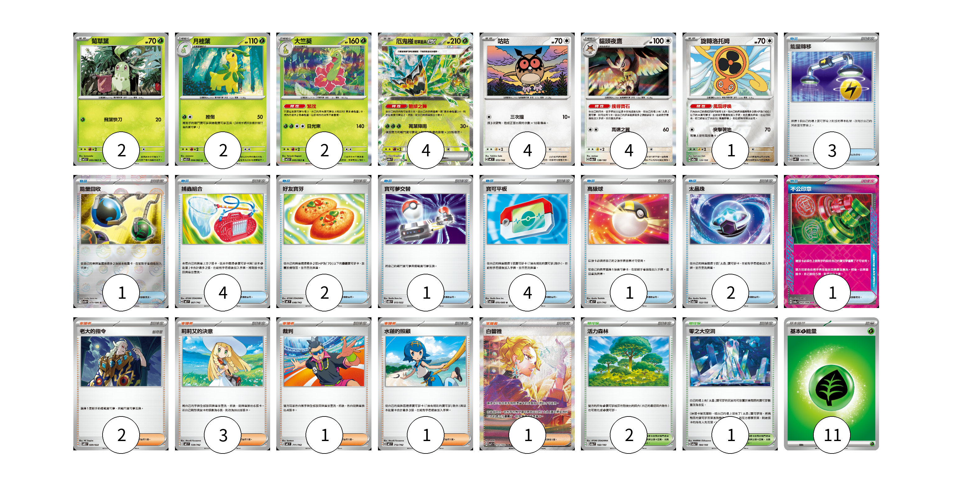 牌組構築方案 以此牌組為基礎新構築牌組 顯示卡面 顯示列表 寶可夢卡(19) 2 2 2 4 4 4 1 物品卡(19) 3 1 4 2 1 4 1 2 1 支援者卡(8) 2 3 1 1 1 競技場卡(3) 2 1 能量卡(11) 11 寶可夢卡(19) 卡牌名稱 張數 卡牌名稱 張數 菊草葉 M1S 003/063 02 月桂葉 M1S 004/063 02 大竺葵 M1S 005/063 02 厄鬼椪 碧草面具ex M2a 017/193 04 咕咕 MC 572/742 04 貓頭夜鷹 M2a 138/193 04 旋轉洛托姆 M2a 139/193 01 物品卡(19) 卡牌名稱 張數 卡牌名稱 張數 能量轉移 SVM 127/175 03 能量回收 SV11W 079/086 01 捕蟲組合 MC 667/742 04 好友寶芬 MC 648/742 02 寶可夢交替 MBG 015/022 01 寶可平板 M3 070/080 04 高級球 MC 651/742 01 太晶珠 M2a 152/193 02 不公印章 SV5a 053/066 01 支援者卡(8) 卡牌名稱 張數 卡牌名稱 張數 老大的指令 MBD 020/022 02 莉莉艾的決意 MC 729/742 03 裁判 MC 711/742 01 水蓮的照顧 MC 712/742 01 白蕾雅 SV7 132/102 01 競技場卡(3) 卡牌名稱 張數 卡牌名稱 張數 活力森林 M2a 182/193 02 零之大空洞 M2a 184/193 01 能量卡(11) 卡牌名稱 張數 卡牌名稱 張數 基本【草】能量 MJ GRA 11 以此牌組為基礎新構築牌組 牌組編碼 UupspK-GaAaiu-QQUiyu copy 列印牌組單 牌組編碼已複製 分享至SNS