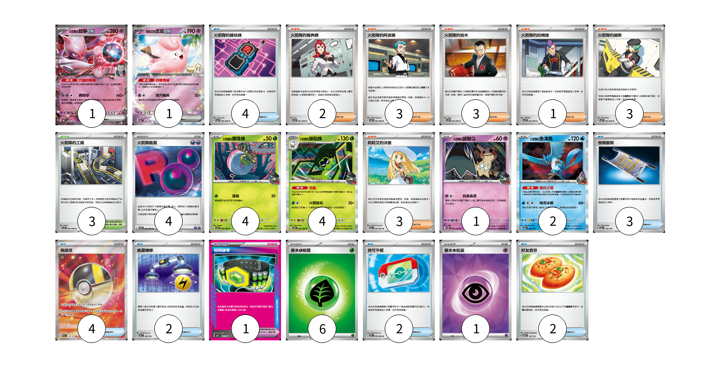 牌組構築方案 以此牌組為基礎新構築牌組 顯示卡面 顯示列表 寶可夢卡(13) 1 1 4 4 1 2 寶可夢道具(1) 1 物品卡(17) 4 3 4 2 2 2 支援者卡(15) 2 3 3 1 3 3 競技場卡(3) 3 能量卡(11) 4 6 1 寶可夢卡(13) 卡牌名稱 張數 卡牌名稱 張數 <火箭隊的>超夢ex MC 290/742 01 莉莉艾的皮皮ex MC 287/742 01 <火箭隊的>團珠蛛 SV10 008/098 04 <火箭隊的>操陷蛛 SV10 009/098 04 <火箭隊的>謎擬Q SV10 042/098 01 <火箭隊的>急凍鳥 M2a 034/193 02 寶可夢道具(1) 卡牌名稱 張數 卡牌名稱 張數 極限腰帶 MC 691/742 01 物品卡(17) 卡牌名稱 張數 卡牌名稱 張數 火箭隊的接收器 SV10 090/098 04 夜間擔架 M2a 159/193 03 高級球 M2a 216/193 04 能量轉移 MC 638/742 02 寶可平板 M3 070/080 02 好友寶芬 M2a 153/193 02 支援者卡(15) 卡牌名稱 張數 卡牌名稱 張數 火箭隊的雅典娜 SV10 091/098 02 火箭隊的阿波羅 SV10 092/098 03 火箭隊的坂木 SV10 093/098 03 火箭隊的拉姆達 SV10 094/098 01 火箭隊的蘭斯 SV10 095/098 03 莉莉艾的決意 M1L 062/063 03 競技場卡(3) 卡牌名稱 張數 卡牌名稱 張數 火箭隊的工廠 SV10 097/098 03 能量卡(11) 卡牌名稱 張數 卡牌名稱 張數 火箭隊能量 SV10 098/098 04 基本【草】能量 MC GRA 06 基本【超】能量 SVM PSY 01 以此牌組為基礎新構築牌組 牌組編碼 UuqPam-MkKwUn-LZoVBG copy 列印牌組單 牌組編碼已複製 分享至SNS