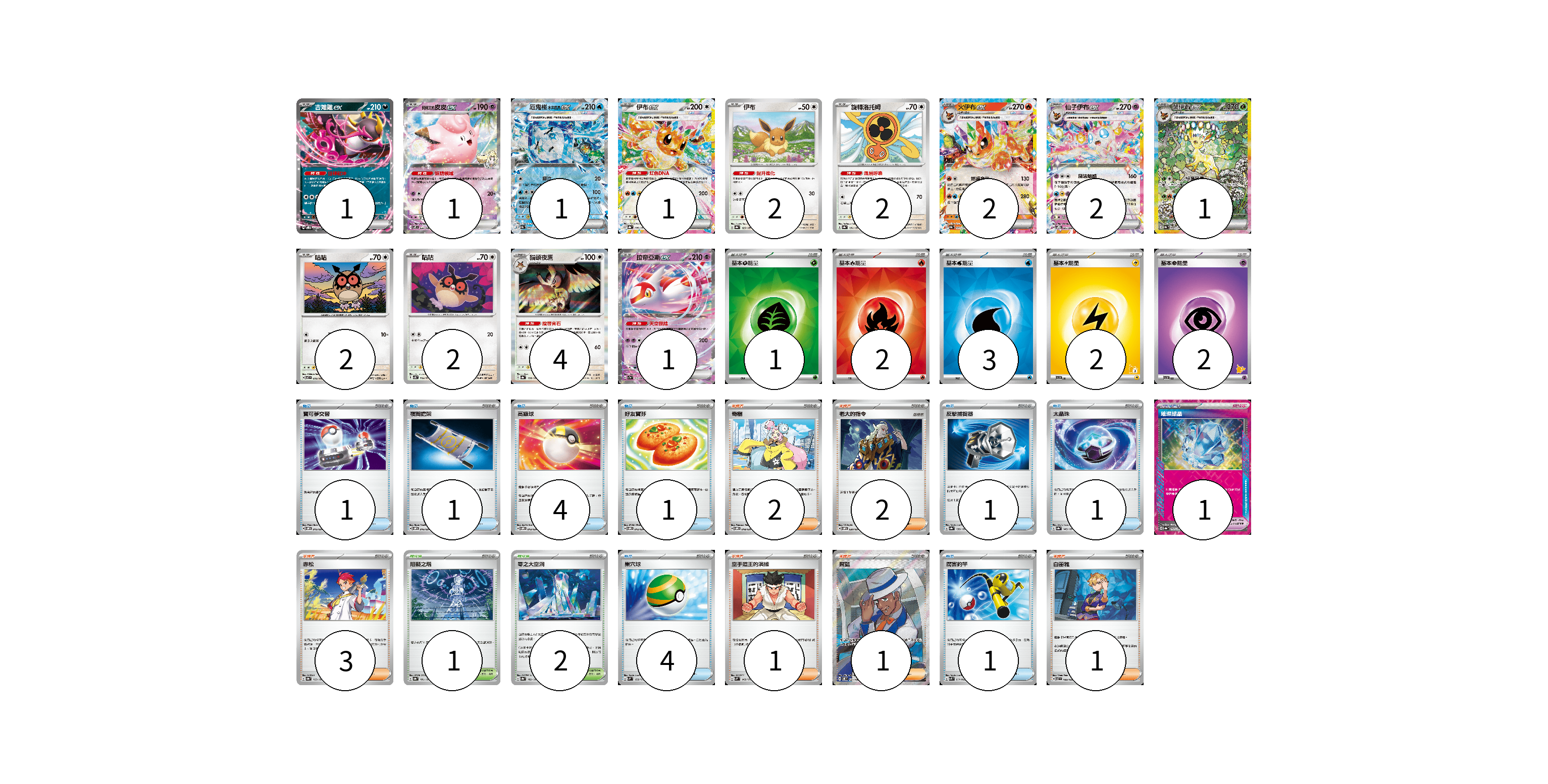 牌組構築方案 以此牌組為基礎新構築牌組 顯示卡面 顯示列表 寶可夢卡(22) 1 1 1 1 2 2 2 2 1 2 2 4 1 寶可夢道具(1) 1 物品卡(14) 1 1 4 1 1 1 4 1 支援者卡(10) 2 2 3 1 1 1 競技場卡(3) 1 2 能量卡(10) 1 2 3 2 2 寶可夢卡(22) 卡牌名稱 張數 卡牌名稱 張數 吉雉雞ex SVOD 004/020 01 莉莉艾的皮皮ex SV9 033/100 01 厄鬼椪 水井面具ex SV8a 050/187 01 伊布ex SV8a 126/187 01 伊布 SV8a 125/187 02 旋轉洛托姆 SV8a 131/187 02 火伊布ex SV8a 022/187 02 仙子伊布ex SVPN 005/008 02 葉伊布ex SV8a 200/187 01 咕咕 SV7 076/102 02 咕咕 SV5K 054/071 02 貓頭夜鷹 SV8a 128/187 04 拉帝亞斯ex SV7a 019/064 01 寶可夢道具(1) 卡牌名稱 張數 卡牌名稱 張數 璀璨結晶 SV8a 152/187 01 物品卡(14) 卡牌名稱 張數 卡牌名稱 張數 寶可夢交替 SVOM 015/021 01 夜間擔架 SVOM 016/021 01 高級球 SVOM 013/021 04 好友寶芬 SVOM 012/021 01 反擊捕捉器 SV8a 139/187 01 太晶珠 SV8a 145/187 01 巢穴球 SVM 133/175 04 厲害釣竿 SVK 011/042 01 支援者卡(10) 卡牌名稱 張數 卡牌名稱 張數 奇樹 SVOM 018/021 02 老大的指令 SVOM 020/021 02 赤松 SV8a 163/187 03 空手道王的演練 SVM 143/175 01 席藍 SV8 127/106 01 白蕾雅 SV7 100/102 01 競技場卡(3) 卡牌名稱 張數 卡牌名稱 張數 阻礙之塔 SV8a 181/187 01 零之大空洞 SV8a 182/187 02 能量卡(10) 卡牌名稱 張數 卡牌名稱 張數 基本【草】能量 SVM GRA 01 基本【火】能量 SVM FIR 02 基本【水】能量 SVM WAT 03 基本【雷】能量 SVI LIG 02 基本【超】能量 SVI PSY 02 以此牌組為基礎新構築牌組 牌組編碼 UvKrSC-NbGXvu-qvJzEl copy 列印牌組單 牌組編碼已複製 分享至SNS