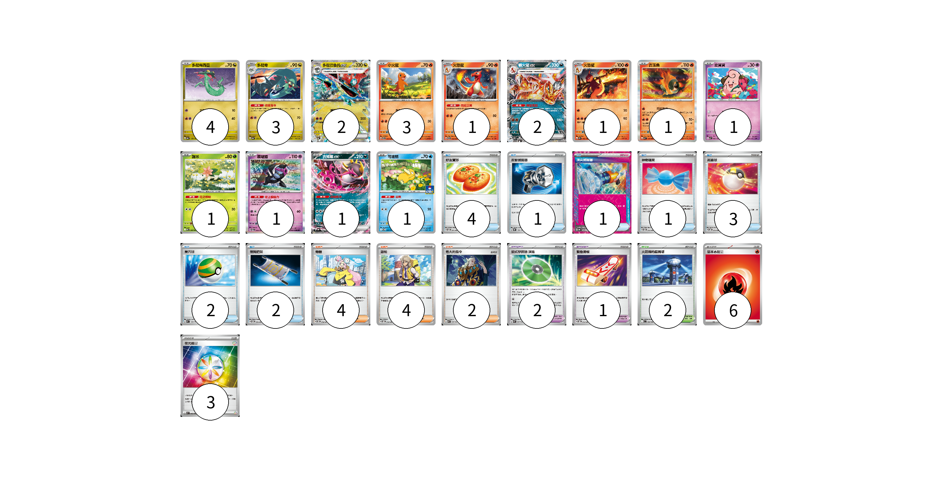 牌組構築方案 以此牌組為基礎新構築牌組 顯示卡面 顯示列表 寶可夢卡(22) 4 3 2 3 1 2 1 1 1 1 1 1 1 寶可夢道具(3) 2 1 物品卡(14) 4 1 1 1 3 2 2 支援者卡(10) 4 4 2 競技場卡(2) 2 能量卡(9) 6 3 寶可夢卡(22) 卡牌名稱 張數 卡牌名稱 張數 多龍梅西亞 SV8a 118/187 04 多龍奇 SV8a 119/187 03 多龍巴魯托ex SV8a 120/187 02 小火龍 SVTL 001/021 03 火恐龍 SVTL 002/021 01 噴火龍ex SVTL 006/021 02 火恐龍 SV2a 005/165 01 古玉魚 SV4K 016/066 01 皮寶寶 SV3 042/108 01 謝米 SV9a 006/063 01 願增猿 SV6 055/101 01 吉雉雞ex SV8a 104/187 01 可達鴨 SV-P 220/SV-P 01 寶可夢道具(3) 卡牌名稱 張數 卡牌名稱 張數 招式學習器 演進 SVK 025/042 02 緊急滑板 SVOD 015/020 01 物品卡(14) 卡牌名稱 張數 卡牌名稱 張數 好友寶芬 SVOD 011/020 04 反擊捕捉器 SV8a 139/187 01 頂尖捕捉器 SV8a 148/187 01 神奇糖果 SVOD 013/020 01 高級球 SVOD 012/020 03 巢穴球 SVM 133/175 02 夜間擔架 SVOM 016/021 02 支援者卡(10) 卡牌名稱 張數 卡牌名稱 張數 奇樹 SVOM 018/021 04 派帕 SVOD 018/020 04 老大的指令 SVK 036/042 02 競技場卡(2) 卡牌名稱 張數 卡牌名稱 張數 火箭隊的監視塔 SV10 096/098 02 能量卡(9) 卡牌名稱 張數 卡牌名稱 張數 基本火能量 sv-p FIR 06 夜光能量 SVK 042/042 03 以此牌組為基礎新構築牌組 牌組編碼 UvlLCw-iliUjD-BENStQ copy 列印牌組單 牌組編碼已複製 分享至SNS