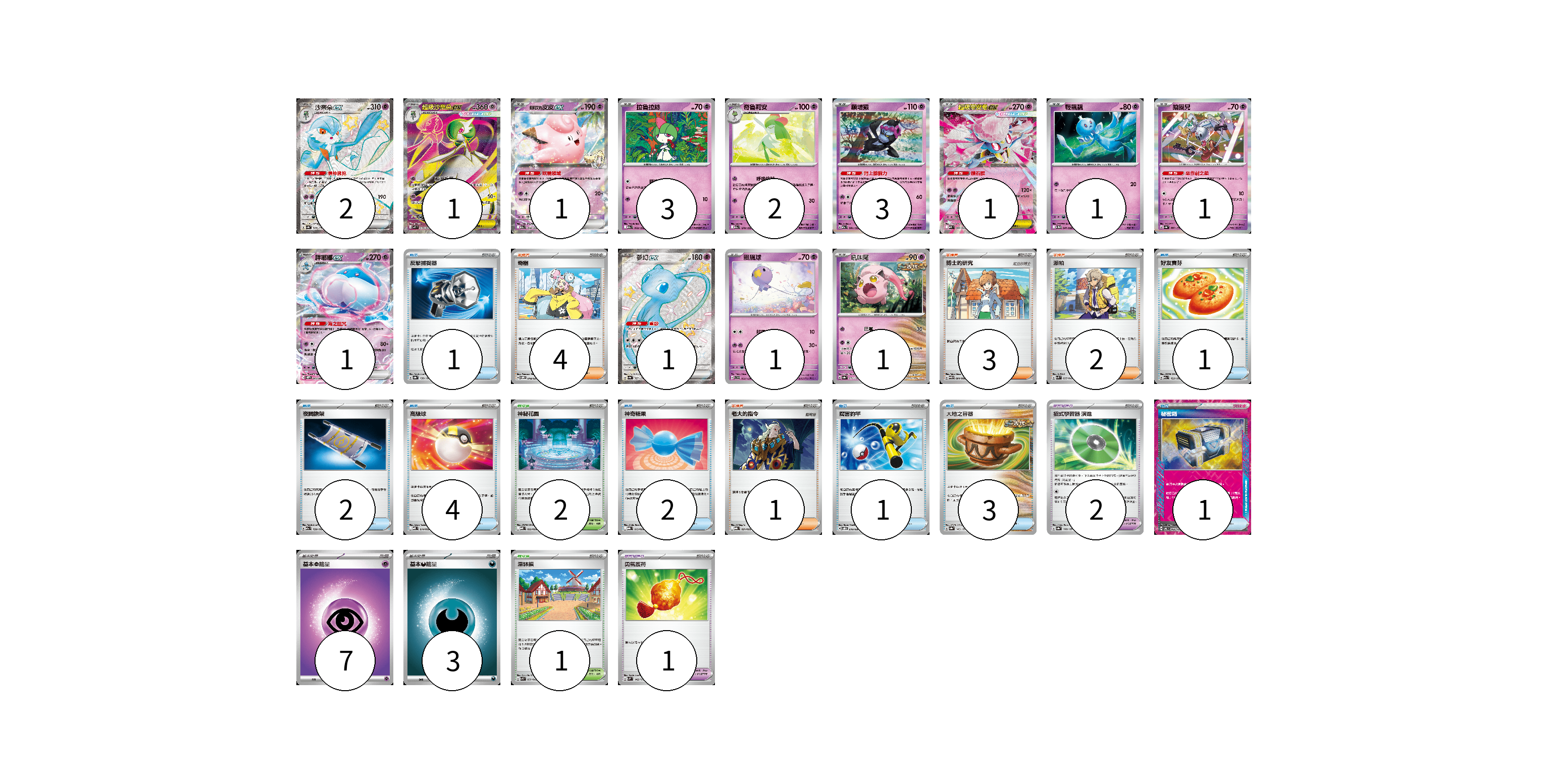 牌組構築方案 以此牌組為基礎新構築牌組 顯示卡面 顯示列表 寶可夢卡(19) 2 1 1 3 2 3 1 1 1 1 1 1 1 寶可夢道具(3) 2 1 物品卡(15) 1 1 2 4 2 1 3 1 支援者卡(10) 4 3 2 1 競技場卡(3) 2 1 能量卡(10) 7 3 寶可夢卡(19) 卡牌名稱 張數 卡牌名稱 張數 沙奈朵ex SV4a 328/190 02 超級沙奈朵ex M1S 078/063 01 莉莉艾的皮皮ex M2a 060/193 01 拉魯拉絲 M2a 069/193 03 奇魯莉安 M2a 070/193 02 願增猿 M2a 081/193 03 超級蒂安希ex MBD 006/022 01 輕飄飄 SV11W 041/086 01 鑰圈兒 SV4a 087/190 01 胖嘟嘟ex SV11W 042/086 01 夢幻ex SV4a 327/190 01 飄飄球 SVD 052/139 01 吼叫尾 SV8a 071/187 01 寶可夢道具(3) 卡牌名稱 張數 卡牌名稱 張數 招式學習器 演進 SV8a 160/187 02 勇氣護符 SVM 142/175 01 物品卡(15) 卡牌名稱 張數 卡牌名稱 張數 反擊捕捉器 SV8a 139/187 01 好友寶芬 M2a 153/193 01 夜間擔架 M2a 159/193 02 高級球 MBD 014/022 04 神奇糖果 MBG 013/022 02 厲害釣竿 SVOD 010/020 01 大地之容器 SV8a 143/187 03 秘密箱 SV6 092/101 01 支援者卡(10) 卡牌名稱 張數 卡牌名稱 張數 奇樹 SVOM 018/021 04 博士的研究 SV11B 084/086 03 派帕 SVK 035/042 02 老大的指令 MBG 021/022 01 競技場卡(3) 卡牌名稱 張數 卡牌名稱 張數 神秘花園 MBD 022/022 02 深缽鎮 SVK 039/042 01 能量卡(10) 卡牌名稱 張數 卡牌名稱 張數 基本【超】能量 MBD PSY 07 基本【惡】能量 MBG DAR 03 以此牌組為基礎新構築牌組 牌組編碼 UwaqAJ-wAWZQP-pmVAFC copy 列印牌組單 牌組編碼已複製 分享至SNS