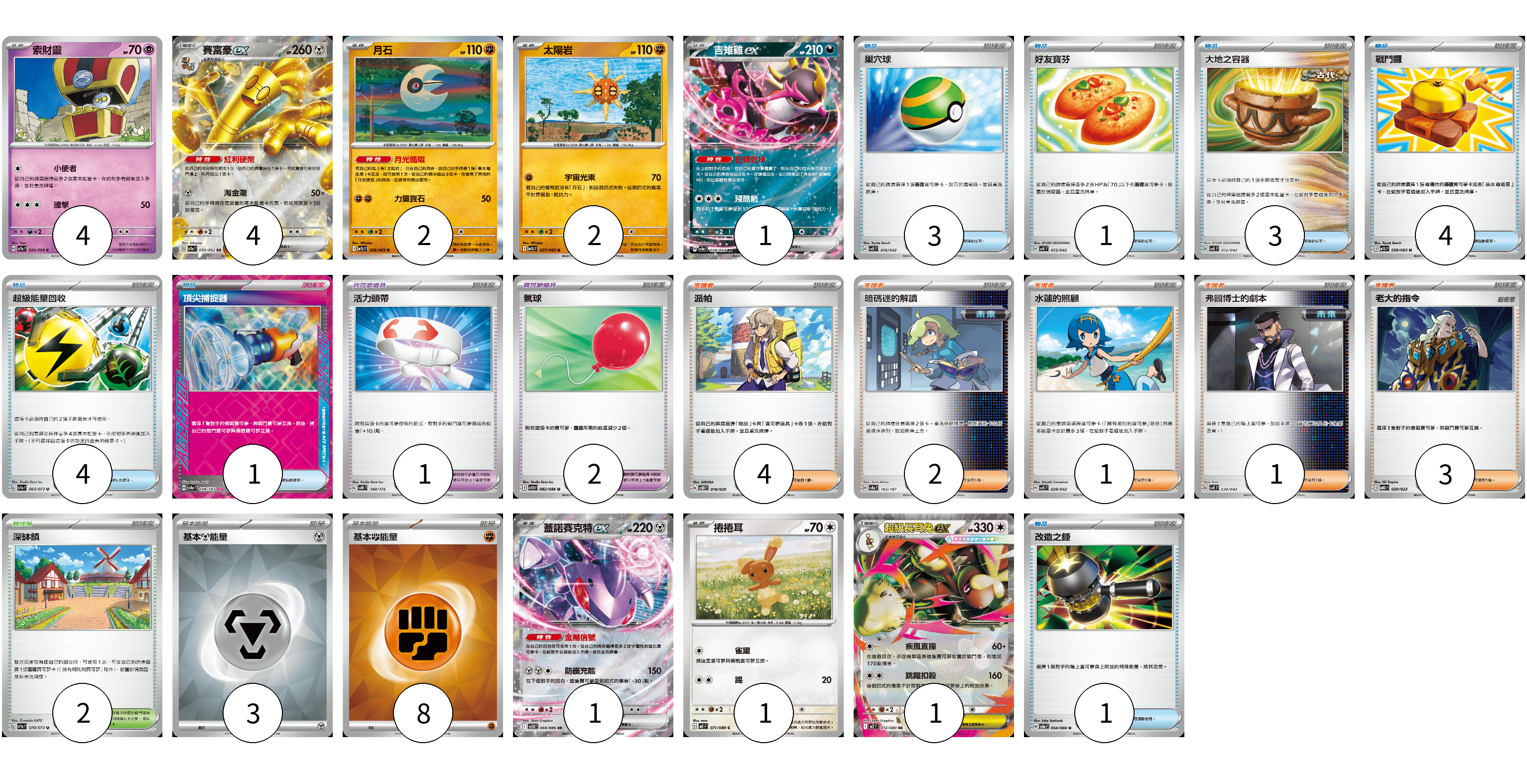 牌組構築方案 以此牌組為基礎新構築牌組 顯示卡面 顯示列表 寶可夢卡(16) 4 4 2 2 1 1 1 1 寶可夢道具(3) 1 2 物品卡(17) 3 1 3 4 4 1 1 支援者卡(11) 4 2 1 1 3 競技場卡(2) 2 能量卡(11) 3 8 寶可夢卡(16) 卡牌名稱 張數 卡牌名稱 張數 索財靈 SV7a 024/064 04 賽富豪ex SV3a 050/062 04 月石 M1L 026/063 02 太陽岩 M1L 027/063 02 吉雉雞ex SV6a 038/064 01 蓋諾賽克特ex SV11B 069/086 01 捲捲耳 M2 071/080 01 超級長耳兔ex M2 072/080 01 寶可夢道具(3) 卡牌名稱 張數 卡牌名稱 張數 活力頭帶 SVM 140/175 01 氣球 SV11B 082/086 02 物品卡(17) 卡牌名稱 張數 卡牌名稱 張數 巢穴球 SVK 016/042 03 好友寶芬 SVK 015/042 01 大地之容器 SVK 012/042 03 戰鬥鑼 M1L 059/063 04 超級能量回收 SV1a 064/073 04 頂尖捕捉器 SV8a 148/187 01 改造之錘 SV5a 054/066 01 支援者卡(11) 卡牌名稱 張數 卡牌名稱 張數 派帕 SVOD 018/020 04 暗碼迷的解讀 SV8a 165/187 02 水蓮的照顧 SVK 028/042 01 弗圖博士的劇本 SVK 034/042 01 老大的指令 MBD 020/022 03 競技場卡(2) 卡牌名稱 張數 卡牌名稱 張數 深缽鎮 SV1a 070/073 02 能量卡(11) 卡牌名稱 張數 卡牌名稱 張數 基本【鋼】能量 SVK MET 03 基本【鬥】能量 SVK FIG 08 以此牌組為基礎新構築牌組 牌組編碼 UyXExF-WseaeT-LGsPsM copy 列印牌組單 牌組編碼已複製 分享至SNS