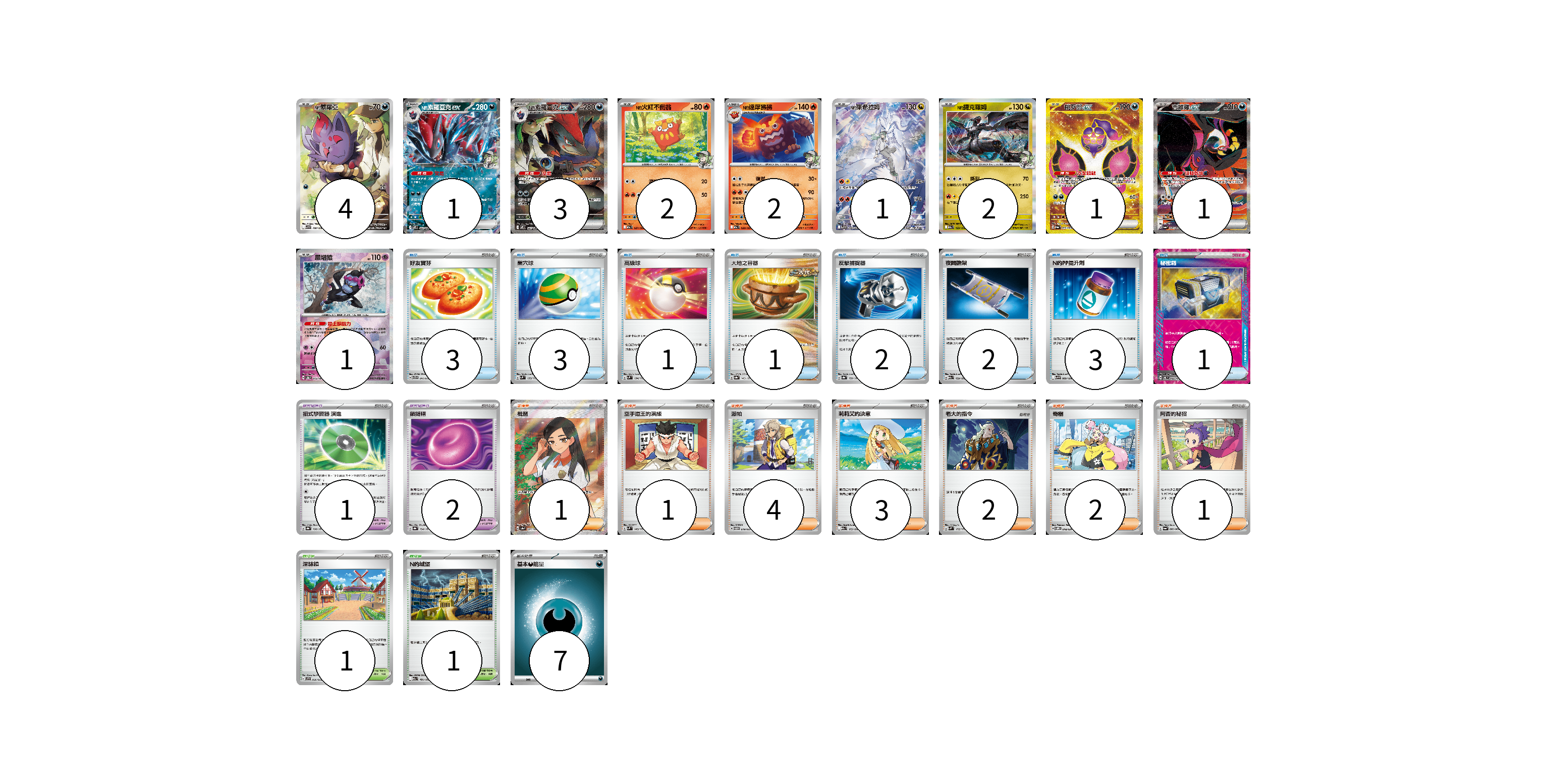 牌組構築方案 以此牌組為基礎新構築牌組 顯示卡面 顯示列表 寶可夢卡(18) 4 1 3 2 2 1 2 1 1 1 寶可夢道具(3) 1 2 物品卡(16) 3 3 1 1 2 2 3 1 支援者卡(14) 1 1 4 3 2 2 1 競技場卡(2) 1 1 能量卡(7) 7 寶可夢卡(18) 卡牌名稱 張數 卡牌名稱 張數 N的索羅亞 SV9 108/100 04 N的索羅亞克ex SV9 061/100 01 N的索羅亞克ex SV9 127/100 03 N的火紅不倒翁 M2a 027/193 02 N的達摩狒狒 M2a 028/193 02 N的萊希拉姆 SV9 109/100 01 N的捷克羅姆 M2a 129/193 02 桃歹郎ex SV6a 092/064 01 吉雉雞ex SV6a 089/064 01 願增猿 SV8a 075/187 01 寶可夢道具(3) 卡牌名稱 張數 卡牌名稱 張數 招式學習器 演進 SV8a 160/187 01 鎖鏈糬 SV8a 154/187 02 物品卡(16) 卡牌名稱 張數 卡牌名稱 張數 好友寶芬 SVTG 011/019 03 巢穴球 SVM 133/175 03 高級球 SVM 134/175 01 大地之容器 SV8a 143/187 01 反擊捕捉器 SV8a 139/187 02 夜間擔架 M2a 159/193 02 N的PP提升劑 SV9 089/100 03 秘密箱 SV6 092/101 01 支援者卡(14) 卡牌名稱 張數 卡牌名稱 張數 枇琶 SV8a 197/187 01 空手道王的演練 SVM 143/175 01 派帕 SVTM 019/022 04 莉莉艾的決意 M2a 175/193 03 老大的指令 SVM 172/175 02 奇樹 SVOM 018/021 02 阿杏的秘招 SV6a 060/064 01 競技場卡(2) 卡牌名稱 張數 卡牌名稱 張數 深缽鎮 SVF 036/038 01 N的城堡 M2a 181/193 01 能量卡(7) 卡牌名稱 張數 卡牌名稱 張數 基本【惡】能量 MBG DAR 07 以此牌組為基礎新構築牌組 牌組編碼 UyxcQK-OYOUhd-KFcvNc copy 列印牌組單 牌組編碼已複製 分享至SNS