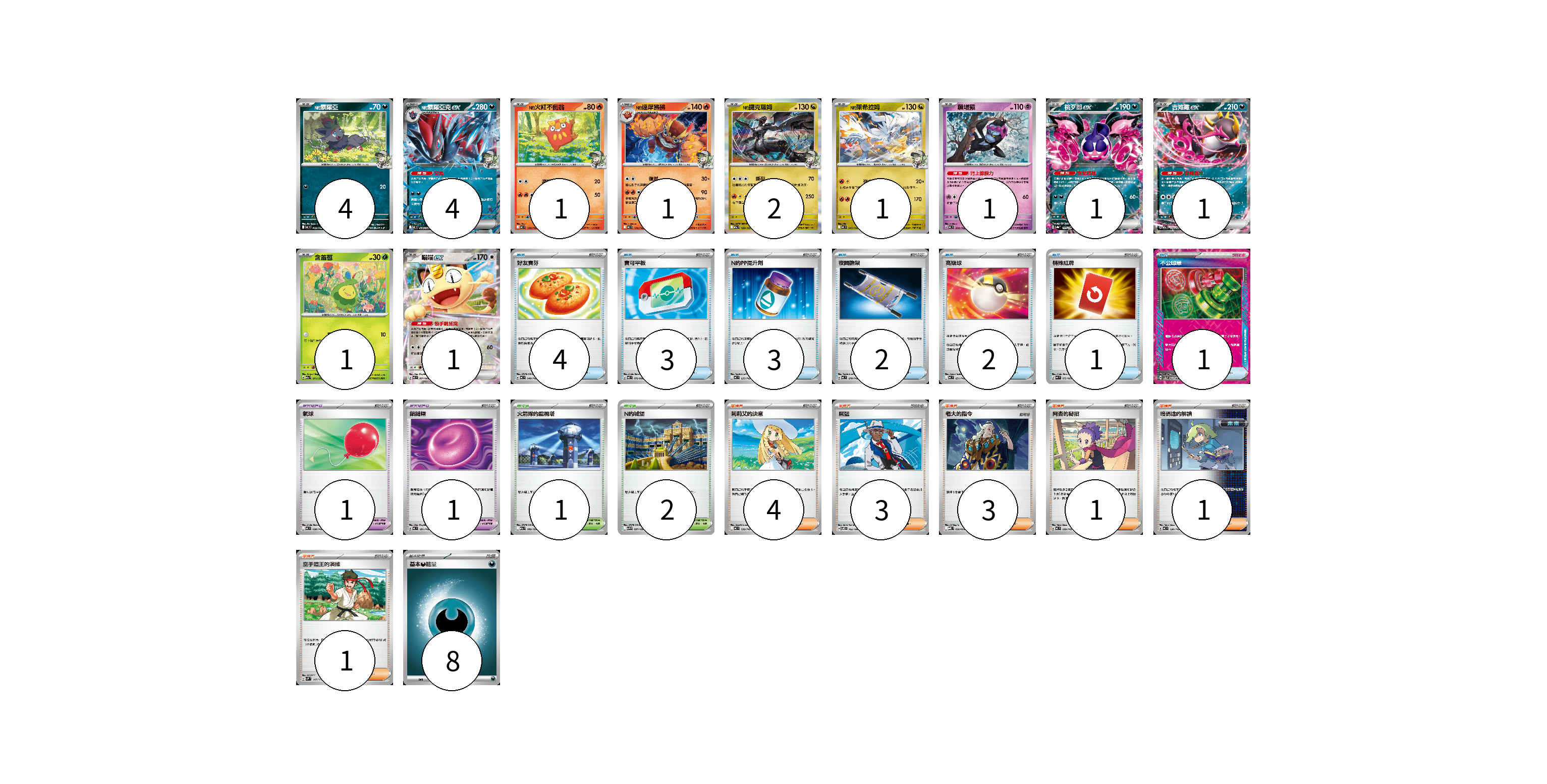 牌組構築方案 以此牌組為基礎新構築牌組 顯示卡面 顯示列表 寶可夢卡(18) 4 4 1 1 2 1 1 1 1 1 1 寶可夢道具(2) 1 1 物品卡(16) 4 3 3 2 2 1 1 支援者卡(13) 4 3 3 1 1 1 競技場卡(3) 1 2 能量卡(8) 8 寶可夢卡(18) 卡牌名稱 張數 卡牌名稱 張數 N的索羅亞 MC 469/742 04 N的索羅亞克ex MC 470/742 04 N的火紅不倒翁 MC 118/742 01 N的達摩狒狒 MC 119/742 01 N的捷克羅姆 M2a 129/193 02 N的萊希拉姆 MC 545/742 01 願增猿 MC 358/742 01 桃歹郎ex SV8a 105/187 01 吉雉雞ex M2a 114/193 01 含羞苞 M2a 011/193 01 喵喵ex M3 061/080 01 寶可夢道具(2) 卡牌名稱 張數 卡牌名稱 張數 氣球 MC 688/742 01 鎖鏈糬 MC 681/742 01 物品卡(16) 卡牌名稱 張數 卡牌名稱 張數 好友寶芬 MC 648/742 04 寶可平板 M3 070/080 03 N的PP提升劑 MC 635/742 03 夜間擔架 MC 670/742 02 高級球 MC 651/742 02 特殊紅牌 M4 072/083 01 不公印章 SV5a 053/066 01 支援者卡(13) 卡牌名稱 張數 卡牌名稱 張數 莉莉艾的決意 MC 729/742 04 席藍 SV8 102/106 03 老大的指令 MBD 020/022 03 阿杏的秘招 MC 699/742 01 暗碼迷的解讀 MC 698/742 01 空手道王的演練 SVM 147/175 01 競技場卡(3) 卡牌名稱 張數 卡牌名稱 張數 火箭隊的監視塔 M2a 189/193 01 N的城堡 SV9 097/100 02 能量卡(8) 卡牌名稱 張數 卡牌名稱 張數 基本【惡】能量 MC DAR 08 以此牌組為基礎新構築牌組 牌組編碼 VADXIz-JTiZnI-xrpEzH copy 列印牌組單 牌組編碼已複製 分享至SNS