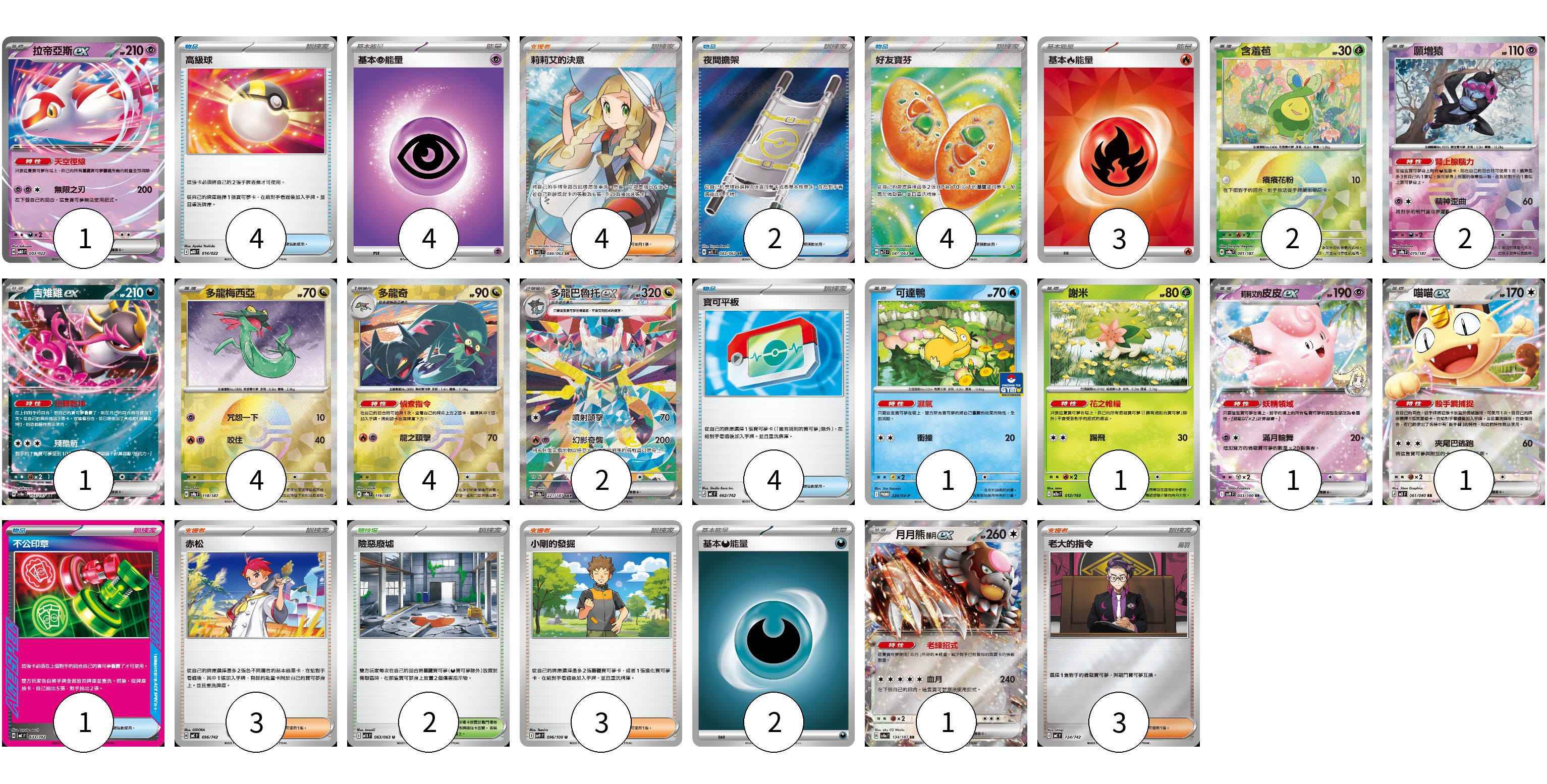 牌組構築方案 以此牌組為基礎新構築牌組 顯示卡面 顯示列表 寶可夢卡(21) 1 2 2 1 4 4 2 1 1 1 1 1 物品卡(15) 4 2 4 4 1 支援者卡(13) 4 3 3 3 競技場卡(2) 2 能量卡(9) 4 3 2 寶可夢卡(21) 卡牌名稱 張數 卡牌名稱 張數 拉帝亞斯ex MBD 003/022 01 含羞苞 SV8a 001/187 02 願增猿 SV8a 075/187 02 吉雉雞ex SV8a 104/187 01 多龍梅西亞 SV8a 118/187 04 多龍奇 SV8a 119/187 04 多龍巴魯托ex SV8a 221/187 02 可達鴨 SV-P 220/SV-P 01 謝米 M2a 012/193 01 莉莉艾的皮皮ex SV9 033/100 01 喵喵ex M3 061/080 01 月月熊 赫月ex SV8a 134/187 01 物品卡(15) 卡牌名稱 張數 卡牌名稱 張數 高級球 MBD 014/022 04 夜間擔架 M1L 083/063 02 好友寶芬 M1S 081/063 04 寶可平板 MC 662/742 04 不公印章 MC 633/742 01 支援者卡(13) 卡牌名稱 張數 卡牌名稱 張數 莉莉艾的決意 M1L 086/063 04 赤松 MC 696/742 03 小剛的發掘 SV9 096/100 03 老大的指令 MC 724/742 03 競技場卡(2) 卡牌名稱 張數 卡牌名稱 張數 險惡廢墟 M1L 063/063 02 能量卡(9) 卡牌名稱 張數 卡牌名稱 張數 基本【超】能量 MBD PSY 04 基本【火】能量 SVQL FIR 03 基本【惡】能量 SVF DAR 02 以此牌組為基礎新構築牌組 牌組編碼 VBXSLX-EnbbDu-BLuCXe copy 列印牌組單 牌組編碼已複製 分享至SNS