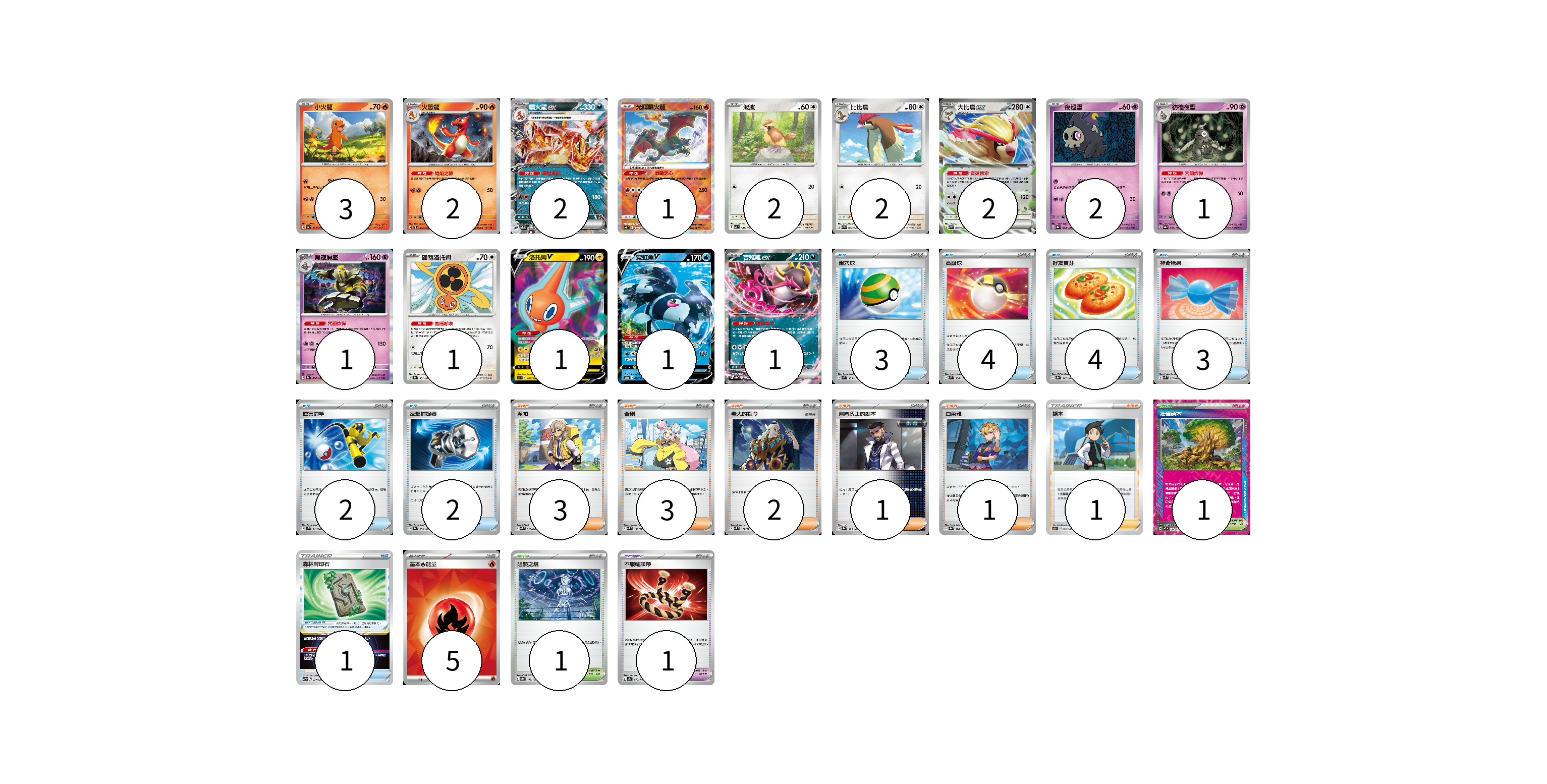 牌組構築方案 以此牌組為基礎新構築牌組 顯示卡面 顯示列表 寶可夢卡(22) 3 2 2 1 2 2 2 2 1 1 1 1 1 1 寶可夢道具(1) 1 物品卡(19) 3 4 4 3 2 2 1 支援者卡(11) 3 3 2 1 1 1 競技場卡(2) 1 1 能量卡(5) 5 寶可夢卡(22) 卡牌名稱 張數 卡牌名稱 張數 小火龍 SV4a 025/190 03 火恐龍 SVTL 002/021 02 噴火龍ex SVTL 006/021 02 光輝噴火龍 SVF 001/038 01 波波 SV3 087/108 02 比比鳥 SVK 004/042 02 大比鳥ex SVK 005/042 02 夜巡靈 SV8a 064/187 02 彷徨夜靈 SV8a 065/187 01 黑夜魔靈 SV8a 066/187 01 旋轉洛托姆 SV8a 131/187 01 洛托姆V S11 037/100 01 霓虹魚V S12a 026/172 01 吉雉雞ex SV8a 104/187 01 寶可夢道具(1) 卡牌名稱 張數 卡牌名稱 張數 不服輸頭帶 SV1S 073/078 01 物品卡(19) 卡牌名稱 張數 卡牌名稱 張數 巢穴球 SVM 133/175 03 高級球 SVM 134/175 04 好友寶芬 SV8a 147/187 04 神奇糖果 SVK 019/042 03 厲害釣竿 SVK 011/042 02 反擊捕捉器 SV8a 139/187 02 森林封印石 SVF 024/038 01 支援者卡(11) 卡牌名稱 張數 卡牌名稱 張數 派帕 SVK 035/042 03 奇樹 SVM 160/175 03 老大的指令 SVM 172/175 02 弗圖博士的劇本 SV8a 175/187 01 白蕾雅 SV8a 176/187 01 捩木 S11 097/100 01 競技場卡(2) 卡牌名稱 張數 卡牌名稱 張數 壯偉碩木 SV7 101/102 01 阻礙之塔 SV8a 181/187 01 能量卡(5) 卡牌名稱 張數 卡牌名稱 張數 基本【火】能量 SVK FIR 05 以此牌組為基礎新構築牌組 牌組編碼 VFeIph-sRTlYe-CztHaf copy 列印牌組單 牌組編碼已複製 分享至SNS