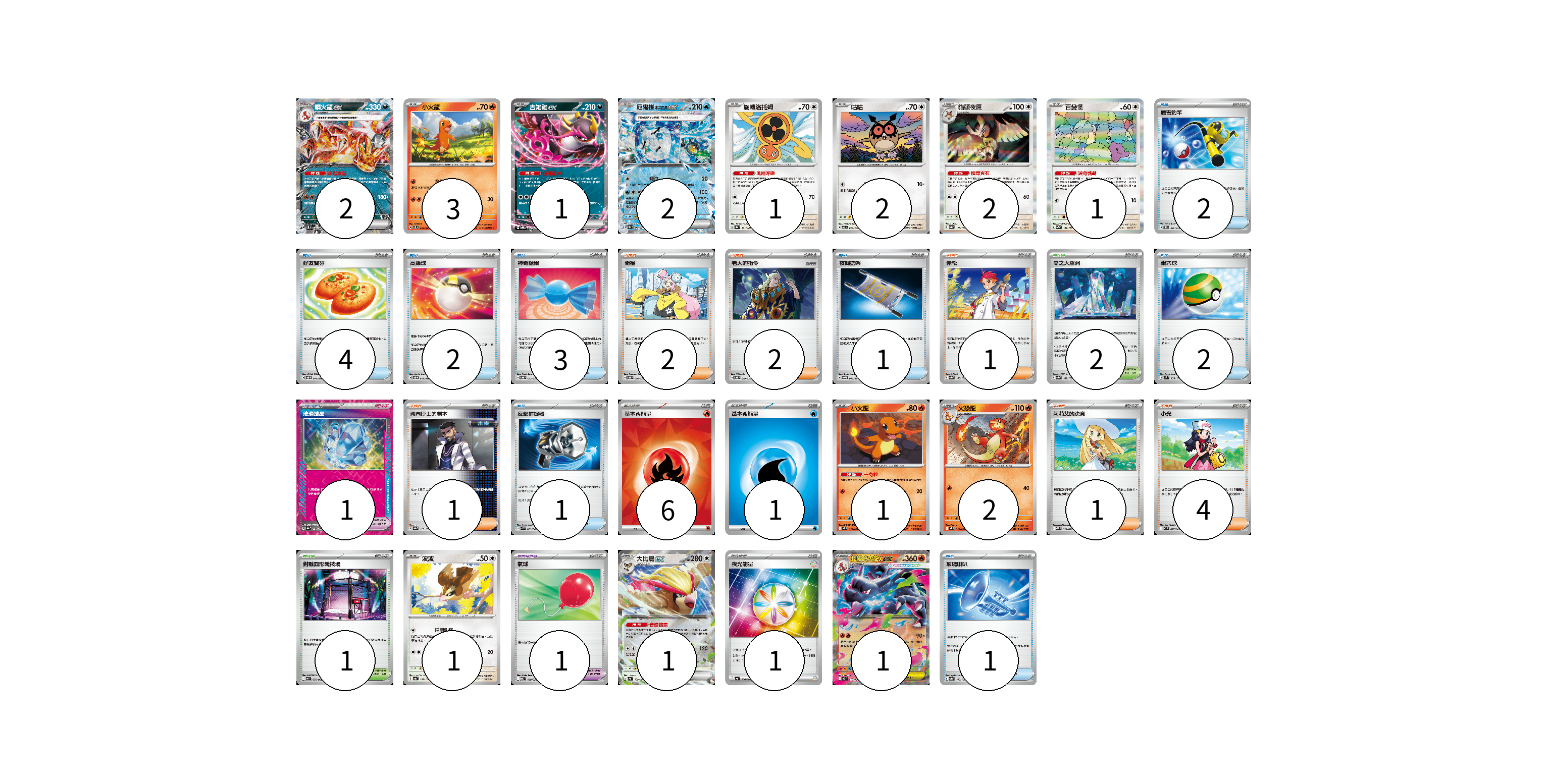 牌組構築方案 以此牌組為基礎新構築牌組 顯示卡面 顯示列表 寶可夢卡(22) 2 3 1 2 1 2 2 1 2 1 2 1 1 1 寶可夢道具(1) 1 物品卡(15) 4 2 3 1 2 1 1 1 支援者卡(11) 2 2 1 1 1 4 競技場卡(3) 2 1 能量卡(8) 6 1 1 寶可夢卡(22) 卡牌名稱 張數 卡牌名稱 張數 噴火龍ex SVTL 006/021 02 小火龍 SVTL 001/021 03 吉雉雞ex SVOD 004/020 01 厄鬼椪 水井面具ex SV8a 050/187 02 旋轉洛托姆 SV8a 131/187 01 咕咕 SV7 076/102 02 貓頭夜鷹 SV8a 128/187 02 百變怪 SV2a 132/165 01 厲害釣竿 SVEL 010/020 02 小火龍 M2 011/080 01 火恐龍 M2 012/080 02 波波 SV4a 137/190 01 大比鳥ex SV4a 139/190 01 超級噴火龍Xex M2 013/080 01 寶可夢道具(1) 卡牌名稱 張數 卡牌名稱 張數 璀璨結晶 SV8a 152/187 01 物品卡(15) 卡牌名稱 張數 卡牌名稱 張數 好友寶芬 SVOD 011/020 04 高級球 SVOD 012/020 02 神奇糖果 SVOD 013/020 03 夜間擔架 SVOM 016/021 01 巢穴球 SVM 133/175 02 反擊捕捉器 SVK 009/042 01 氣球 MBD 018/022 01 玻璃喇叭 SV8a 140/187 01 支援者卡(11) 卡牌名稱 張數 卡牌名稱 張數 奇樹 SVOD 016/020 02 老大的指令 SVOD 019/020 02 赤松 SV8a 163/187 01 弗圖博士的劇本 SV8a 175/187 01 莉莉艾的決意 MBD 021/022 01 小光 M2 077/080 04 競技場卡(3) 卡牌名稱 張數 卡牌名稱 張數 零之大空洞 SV8a 182/187 02 對戰圓形競技場 M2 079/080 01 能量卡(8) 卡牌名稱 張數 卡牌名稱 張數 基本【火】能量 SVK FIR 06 基本【水】能量 SVF WAT 01 夜光能量 SV4a 190/190 01 以此牌組為基礎新構築牌組 牌組編碼 VGmIAj-lfsTFl-RYCHJU copy 列印牌組單 牌組編碼已複製 分享至SNS